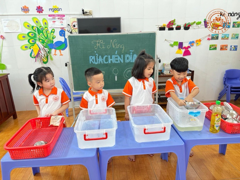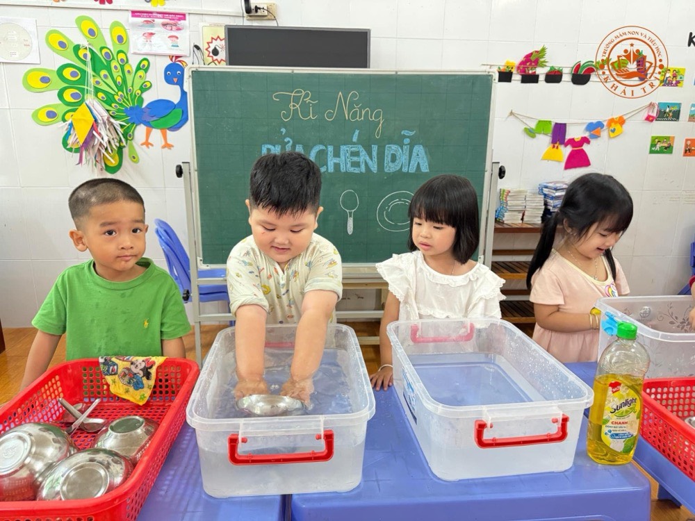 Hoạt động kỹ năng rửa chén là một hoạt động quan trọng mà các trẻ ở trường Mầm non Khải Trí được khuyến khích tham gia. Việc hướng dẫn trẻ nhỏ về quy trình rửa chén không chỉ giúp phát triển kỹ năng thông minh cảm nhận, sáng tạo, mà còn giúp trẻ thấu hiểu về việc giữ gìn vệ sinh cá nhân, môi trường xung quanh và an toàn thực phẩm.