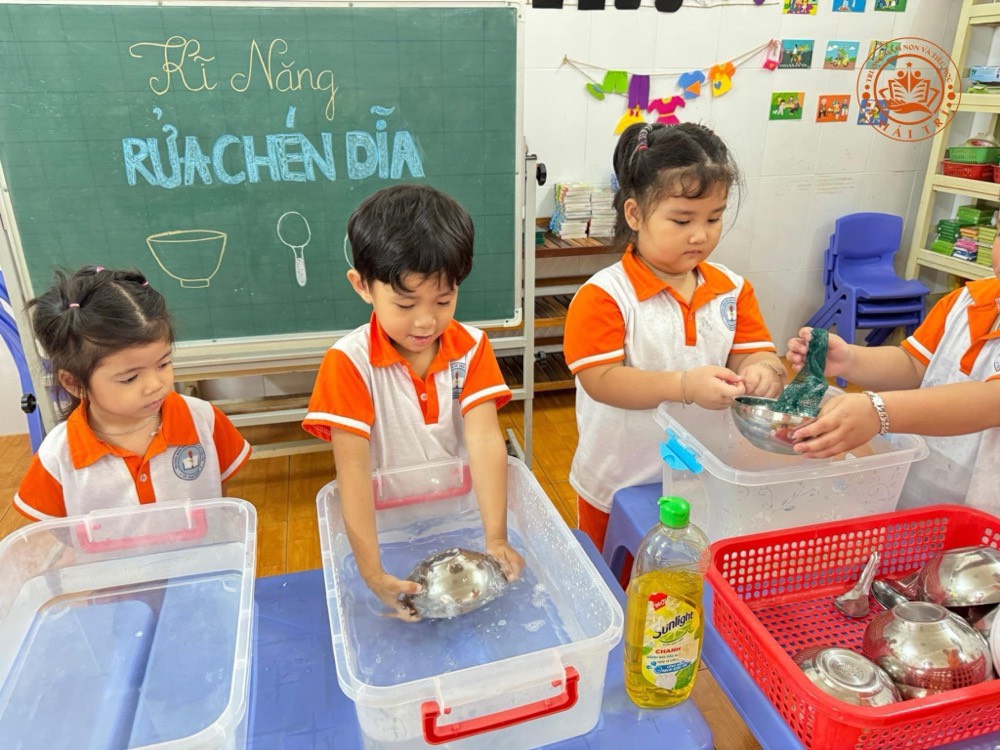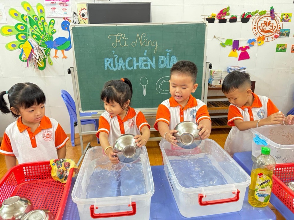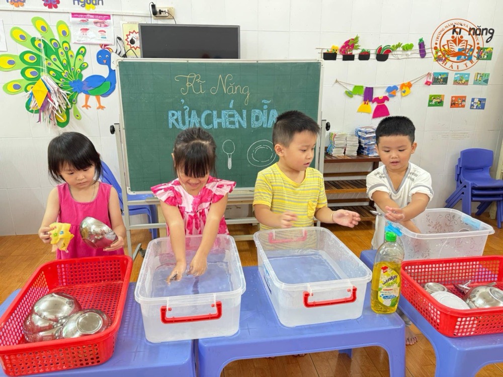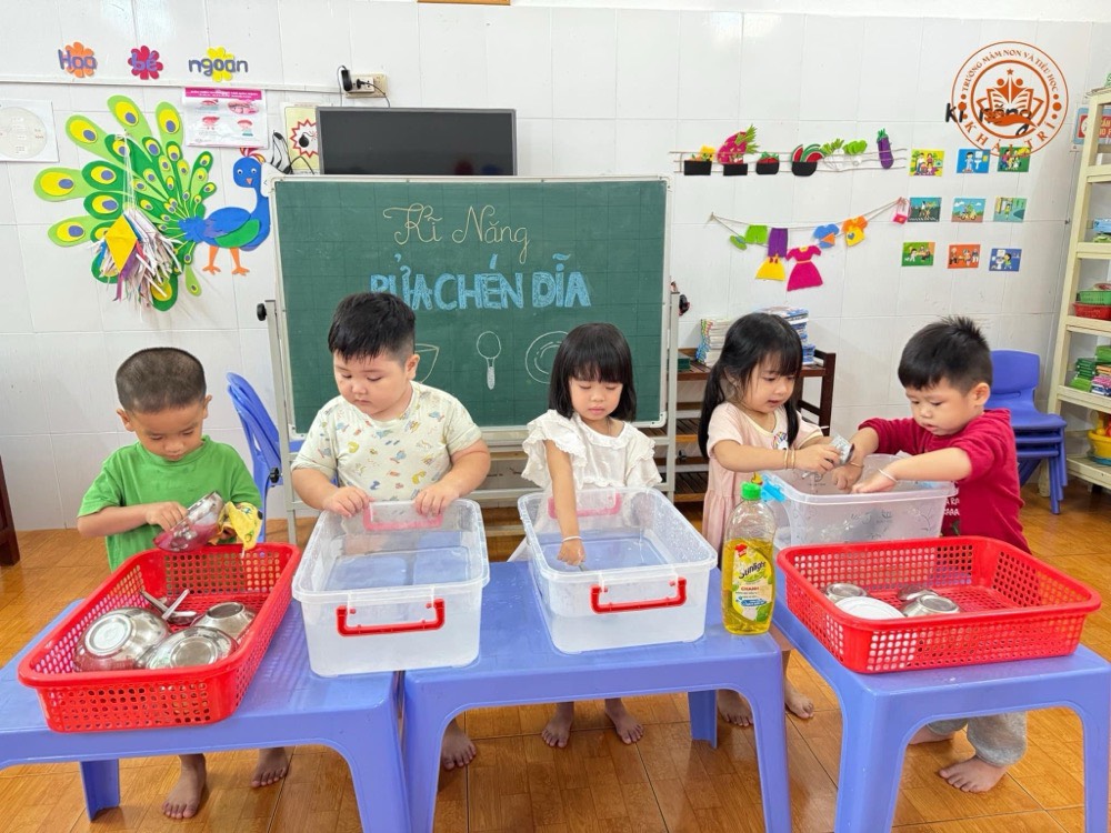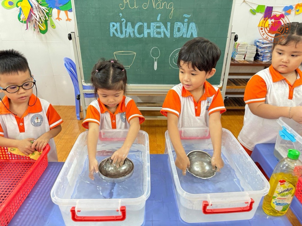 Hoạt động này giúp trẻ phát triển kỹ năng sắp xếp, phân loại và tự quản lý công việc hàng ngày. Thêm vào đó, trẻ cũng học cách sử dụng bình nước và dung dịch rửa chén một cách an toàn và hiệu quả.