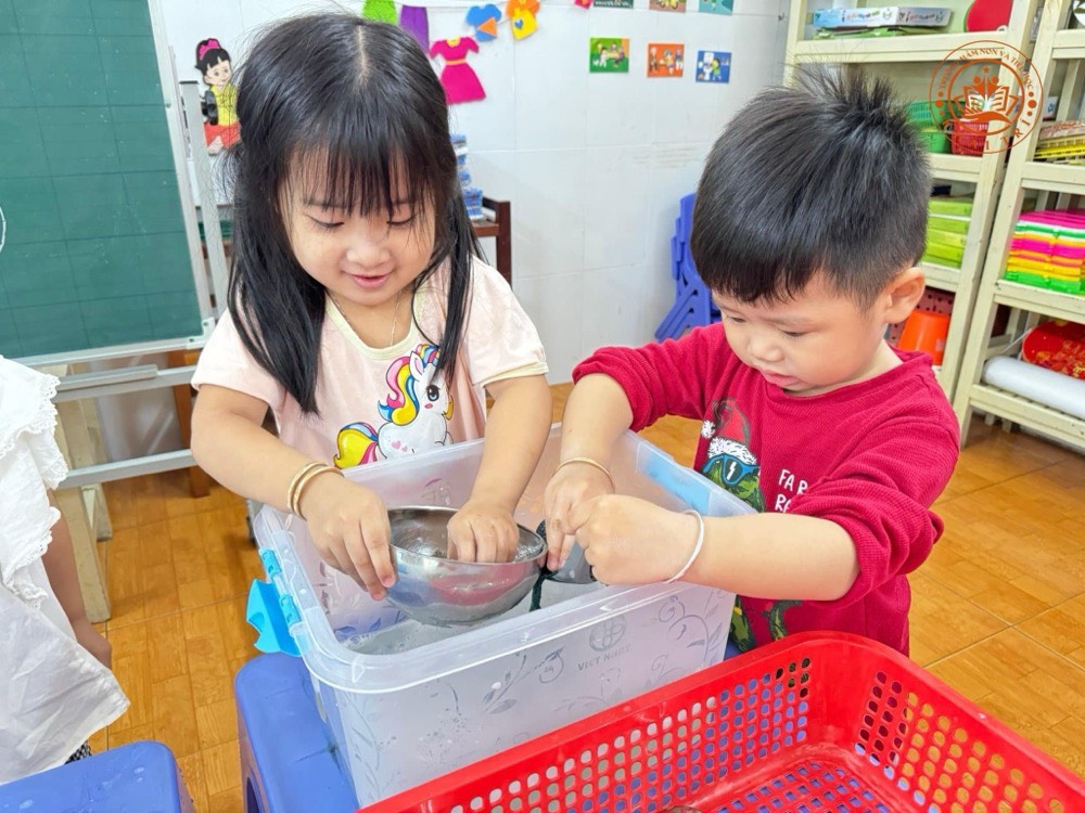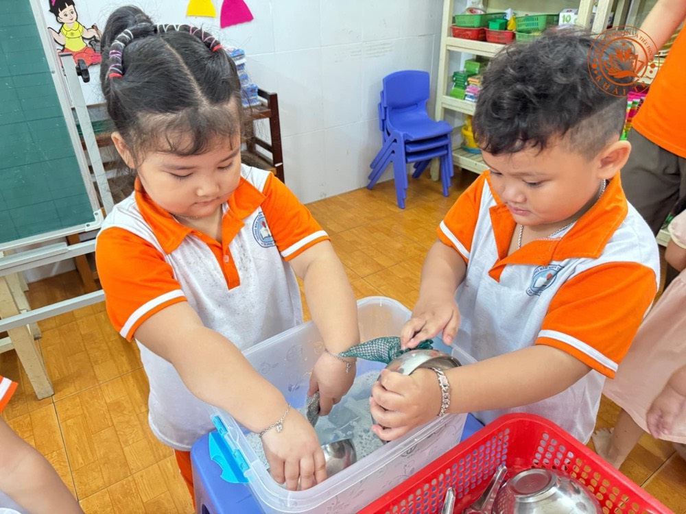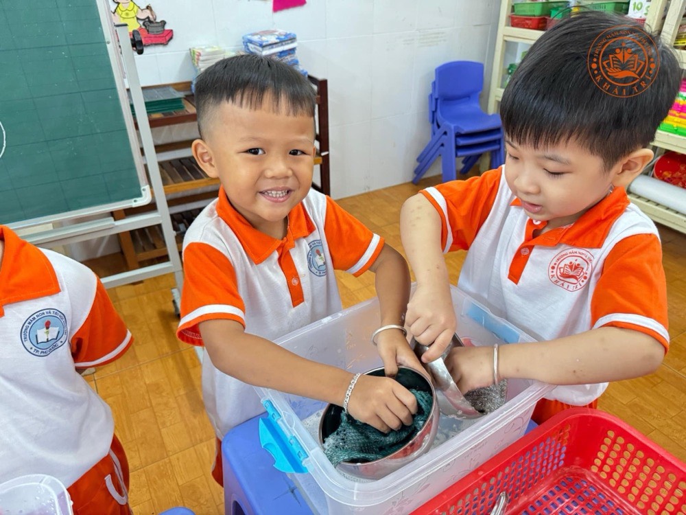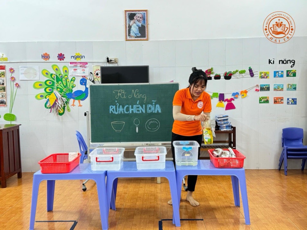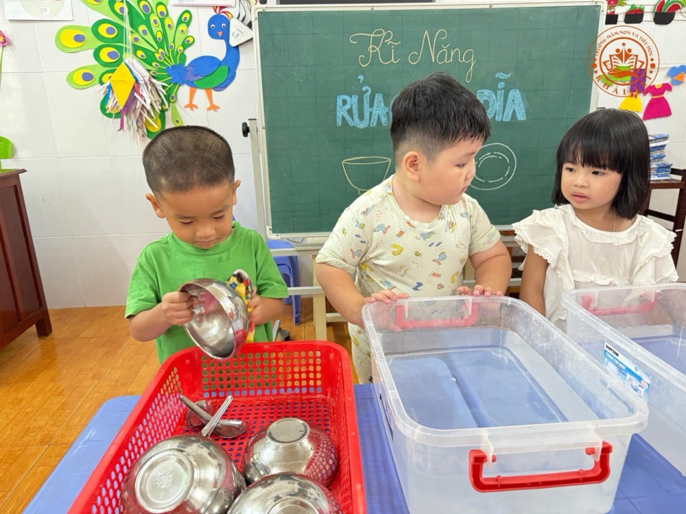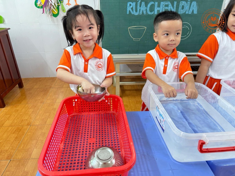 Hoạt động này giúp trẻ phát triển kỹ năng sắp xếp, phân loại và tự quản lý công việc hàng ngày. Thêm vào đó, trẻ cũng học cách sử dụng bình nước và dung dịch rửa chén một cách an toàn và hiệu quả.