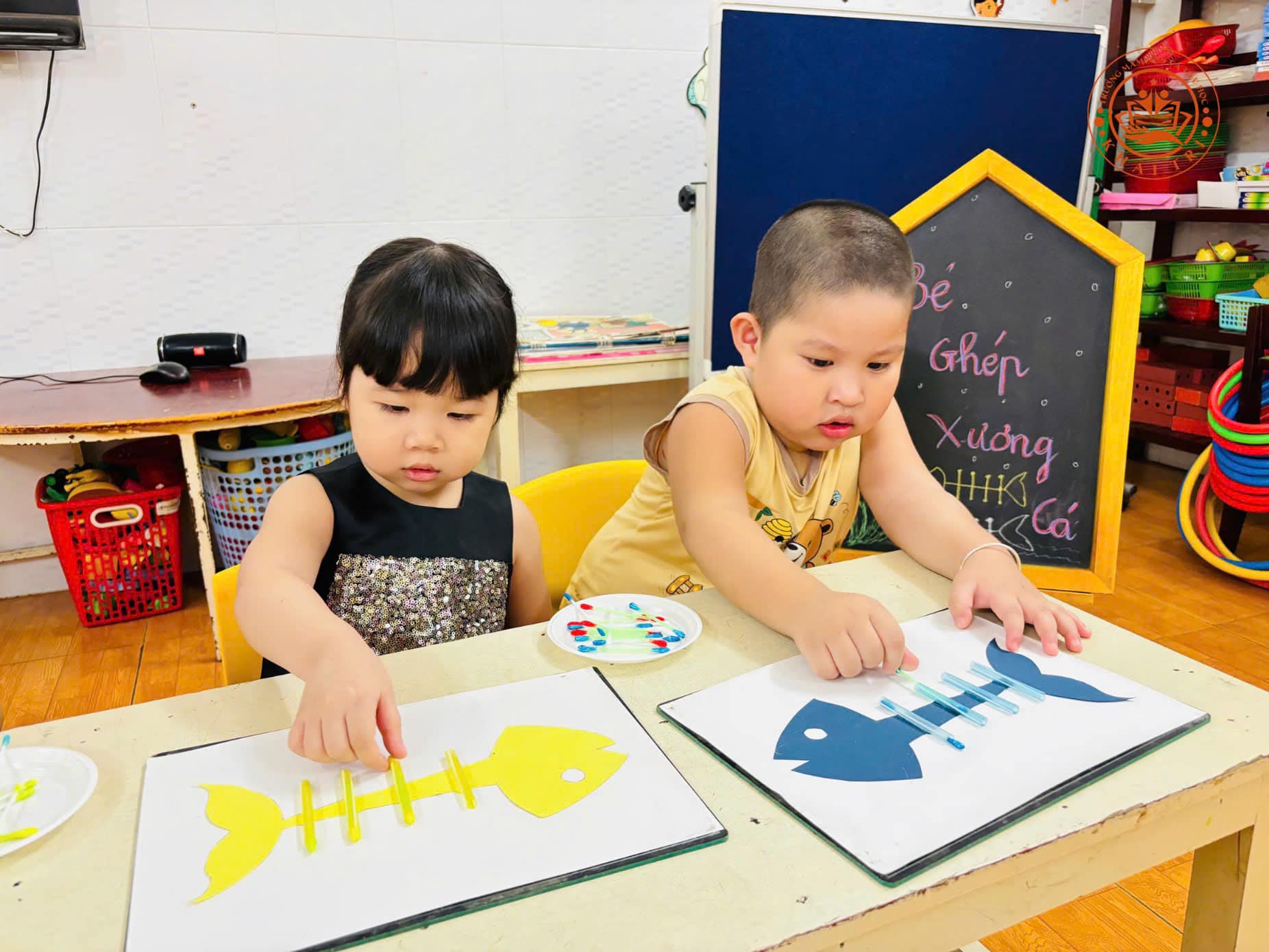 Trong hoạt động này, các bé được hướng dẫn sử dụng tăm bông để ghép thành hình xương cá. Nhờ sự khéo léo của đôi bàn tay nhỏ xinh, cùng với sự quan sát tỉ mỉ, từng em đã biến những vật dụng quen thuộc thành một tác phẩm nghệ thuật độc đáo. Qua việc ghép các bộ phận lại với nhau, các bé không chỉ được học tập về hình dáng và cấu trúc của xương cá mà còn cải thiện các kỹ năng vận động tinh.