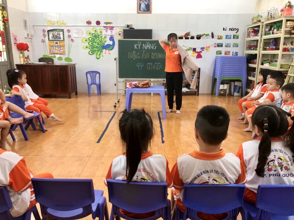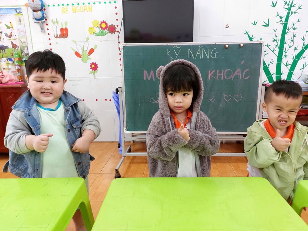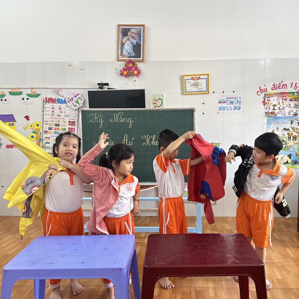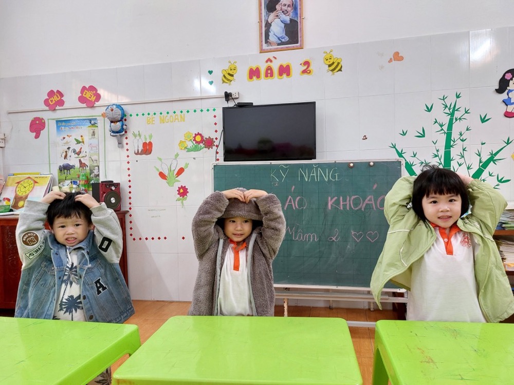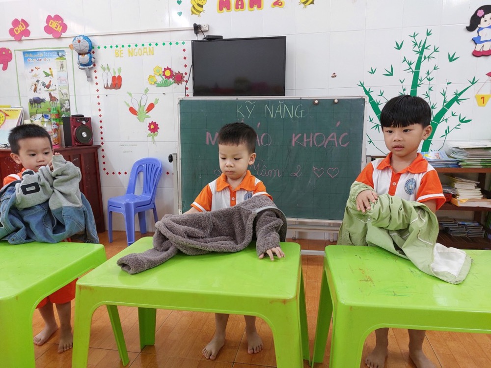 Tại trường Mầm Non Khải Trí, việc học kỹ năng mặc áo khoác là một phần quan trọng trong chương trình giáo dục. Trẻ nhỏ được khuyến khích và hướng dẫn từng bước cách mặc áo khoác một cách đúng đắn và tự lập.