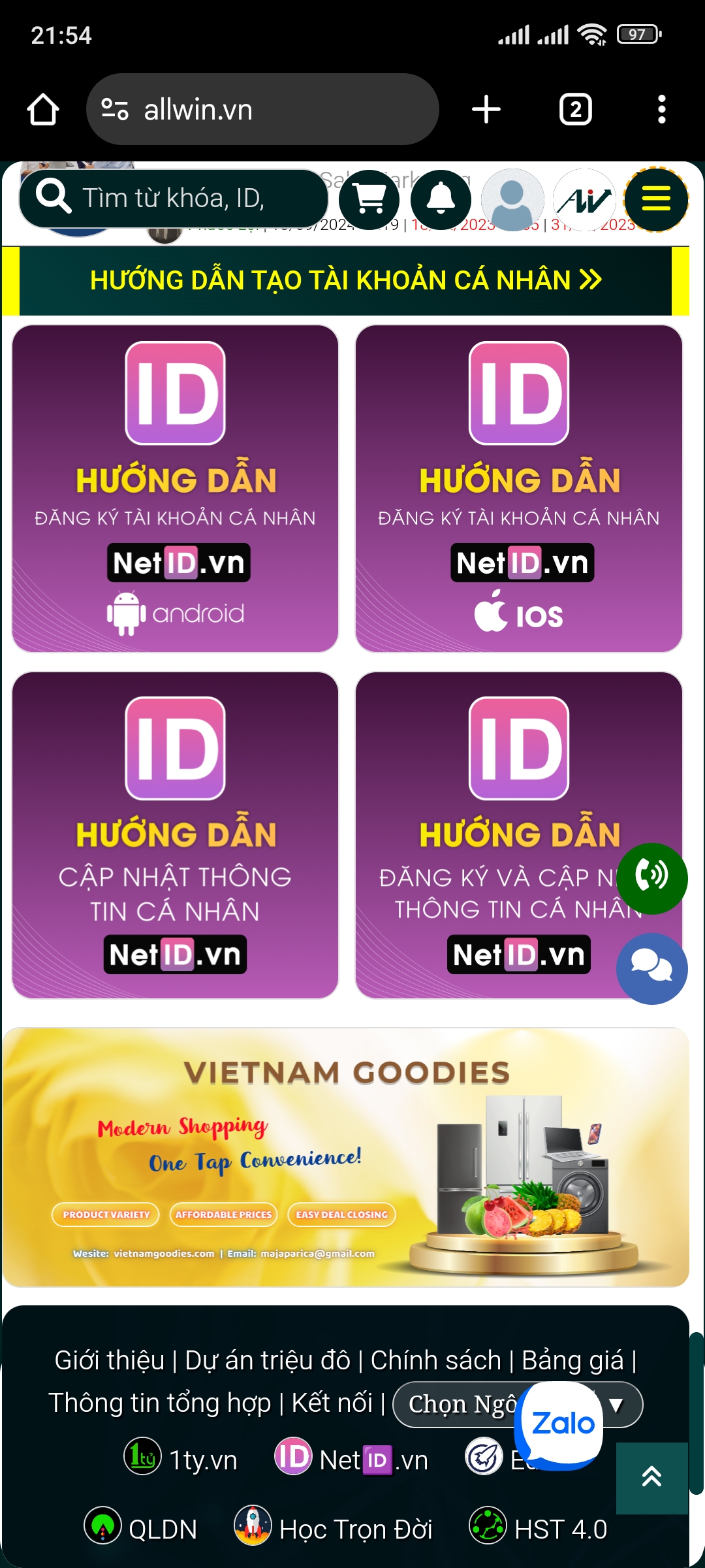 Banner Doanh nghiệp đăng ký Gói Quảng bá Vàng được hiển thị GIỮA TRANG trên HST ALLWIN