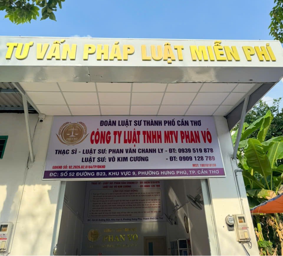 Công Ty Luật TNHH MTV Phan Võ được thành lập ngày 12/01/2026, hoạt động theo Giấy phép số 92.2026.02.0164/TP/ĐKHĐ, do Luật sư Phan Văn Chanh Ly làm người đại diện pháp luật. Công ty đặt trụ sở tại Số 52 đường B23, Khu vực 9, Phường Hưng Phú, TP. Cần Thơ, với mã số thuế 1801818159. Với định hướng cung cấp dịch vụ pháp lý chuyên nghiệp, rõ ràng và trách nhiệm, Công Ty Luật TNHH MTV Phan Võ hỗ trợ khách hàng trong nhiều lĩnh vực pháp luật, đồng hành bảo vệ quyền và lợi ích hợp pháp của cá nhân, tổ chức.