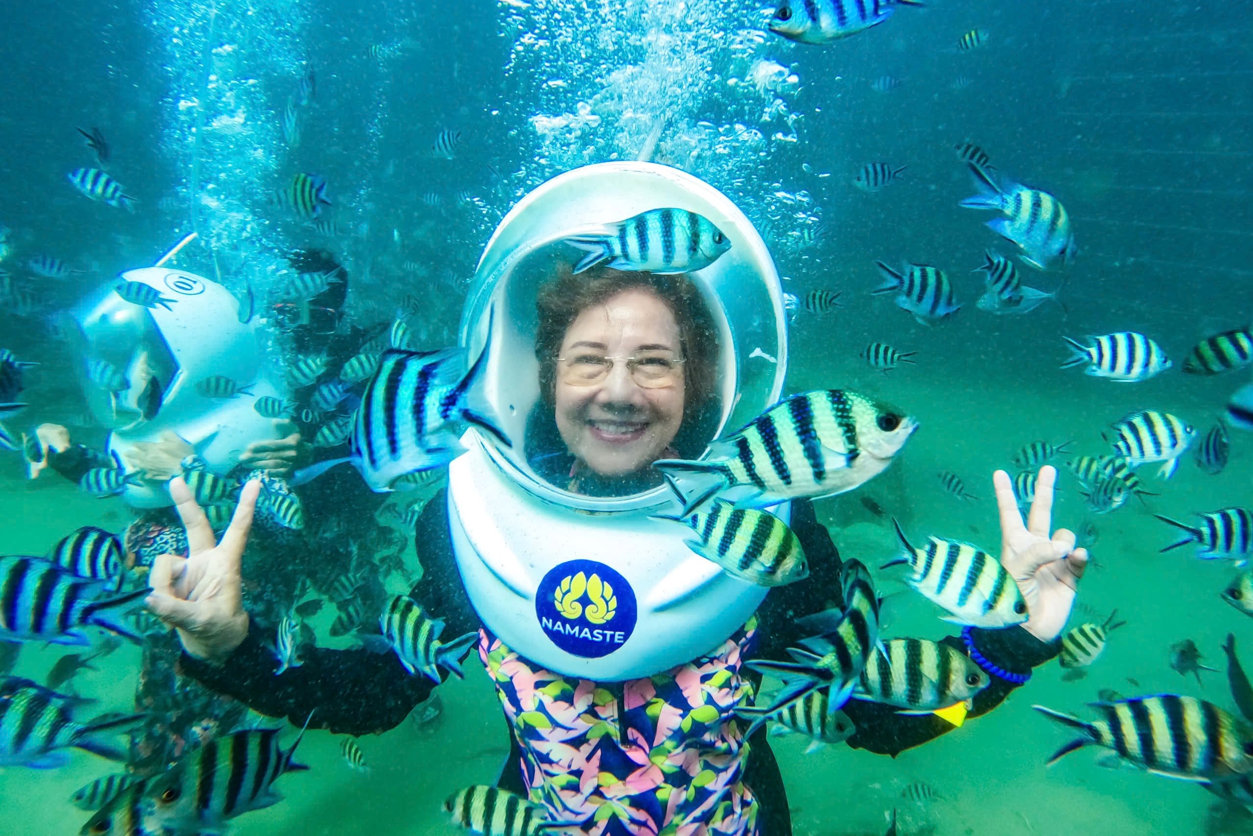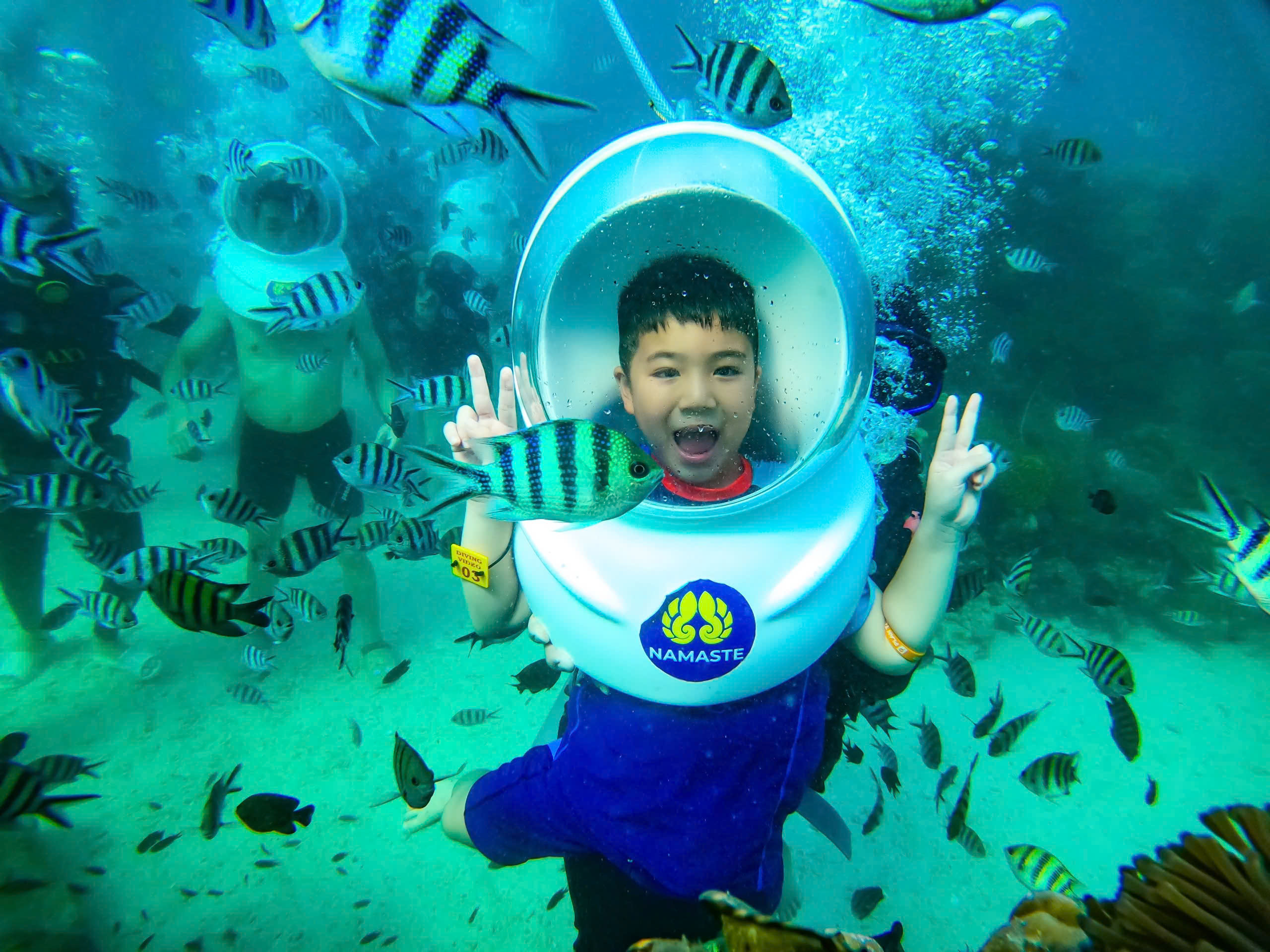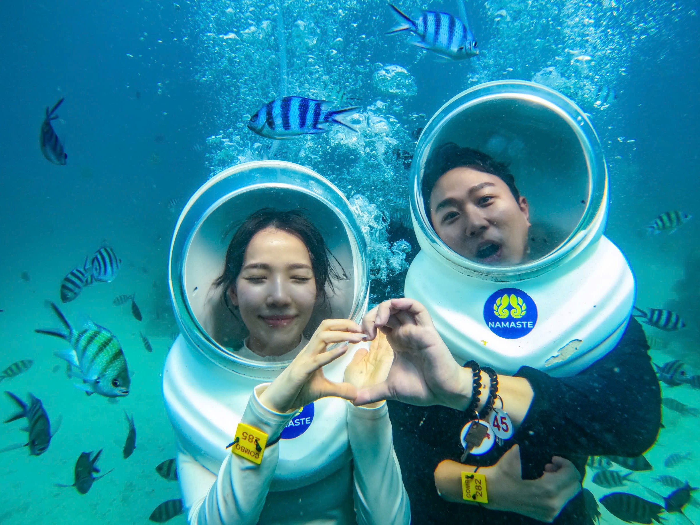 🌊 Không cần biết bơi – Bạn chỉ cần đội mũ lặn chuyên dụng và có thể dễ dàng hít thở khi di chuyển dưới nước.