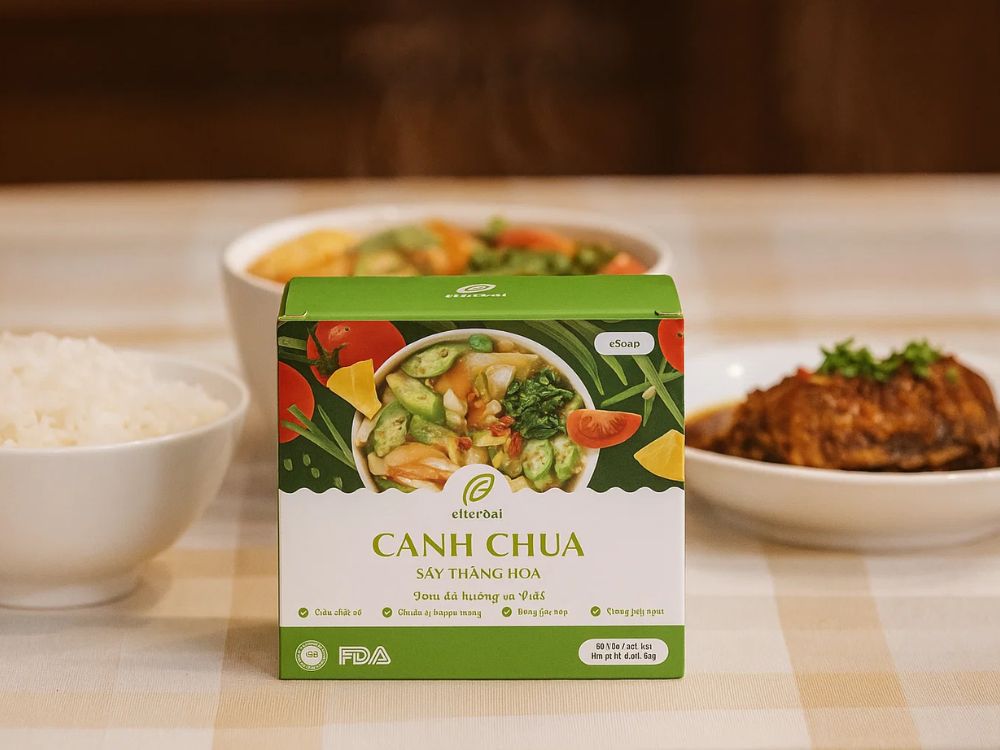 eSoup Canh chua là giải pháp canh ăn liền đột phá, sử dụng công nghệ sấy thăng hoa hiện đại để giữ trọn vẹn hương vị chua thanh, thanh đạm và dưỡng chất tự nhiên của nguyên liệu tươi.