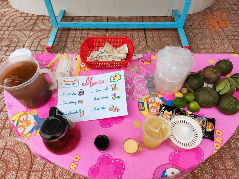 Khu vực tiệm cà phê được trang trí đơn giản nhưng rất đầy đủ, trên bàn được trưng bày với một chiếc khăn trải bàn màu hồng, thêm vào đó là bảng menu được viết tay với những màu sắc rực rỡ. Menu bao gồm các món nước phong phú như cà phê sữa, trà đường, nước đậu và nước mía, cam vắt,.. Mỗi loại đều có hương vị đặc trưng và cách pha chế khác nhau.