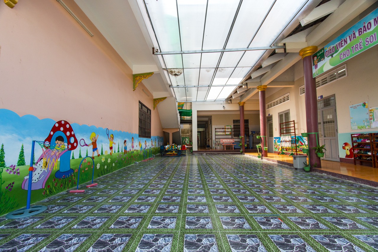 Không gian trường ấm áp, yên bình. Có phòng ăn phòng ngủ riêng biệt cho bé, không gian rộng rãi, thông thoáng, sạch sẽ, an toàn. Các con được làm vườn ngay tại trường.