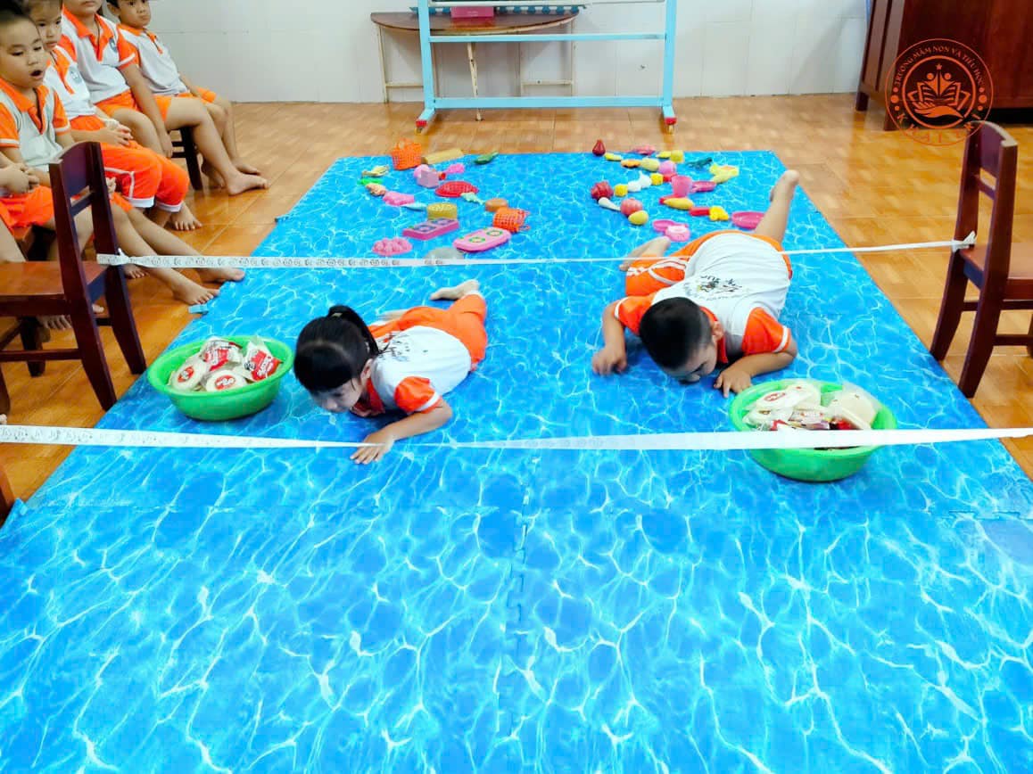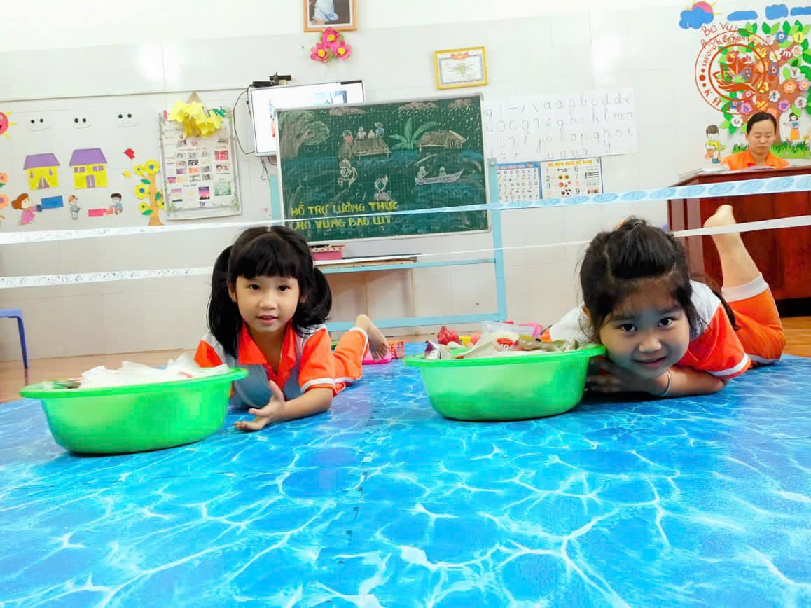 Tiếp nối kiến thức lý thuyết, các bé được giao nhiệm vụ vận chuyển lương thực, hỗ trợ tiếp tế cho bà con vùng ngập lụt. Trong không khí hào hứng, các em cùng nhau vượt qua các chướng ngại vật, khiêng vác thức ăn và vật dụng thiết yếu đến những nơi cần thiết. Hoạt động này không chỉ giúp các bé phát triển thể chất mà còn rèn luyện kỹ năng làm việc nhóm, sự phối hợp và tinh thần đoàn kết.