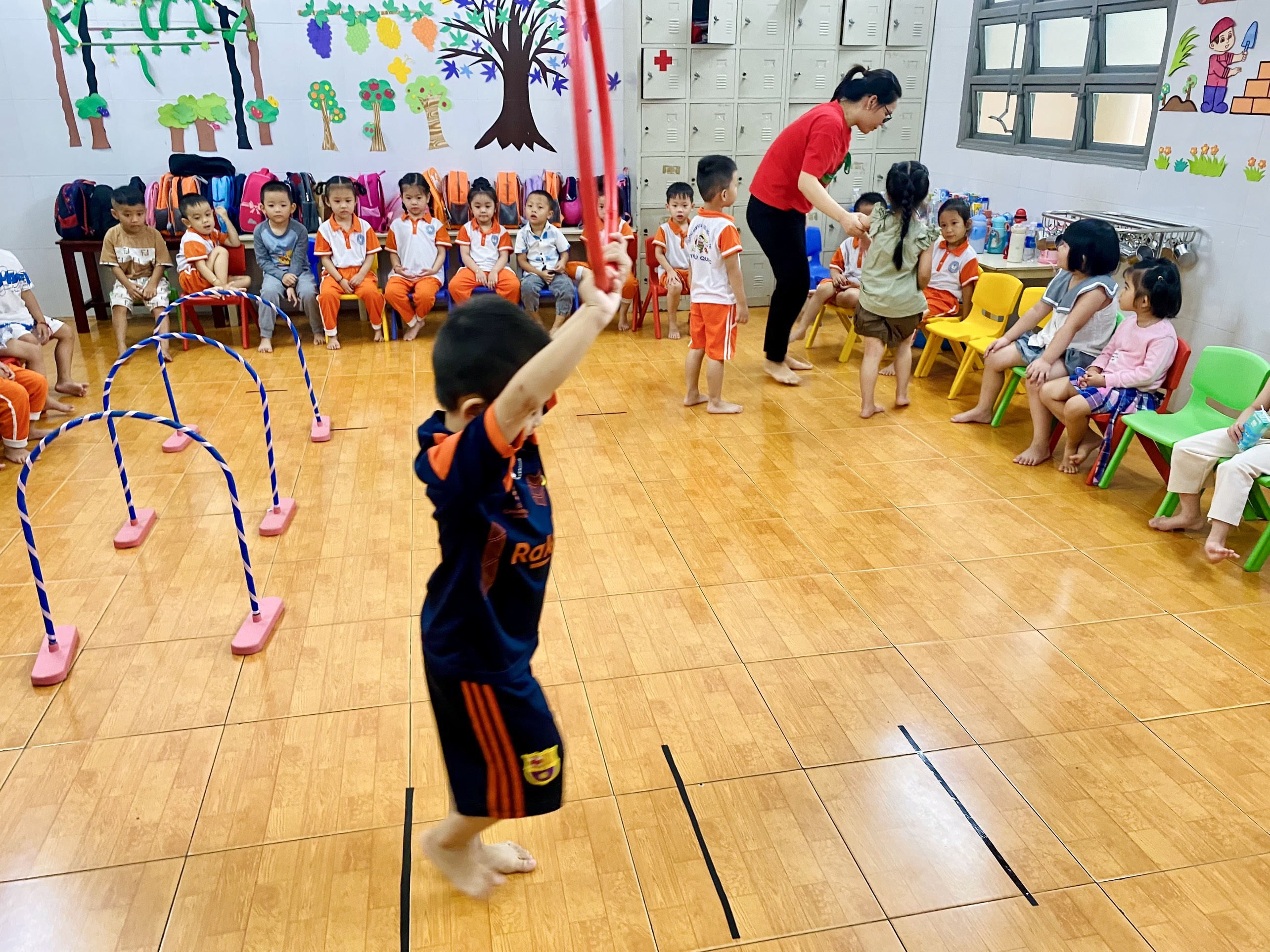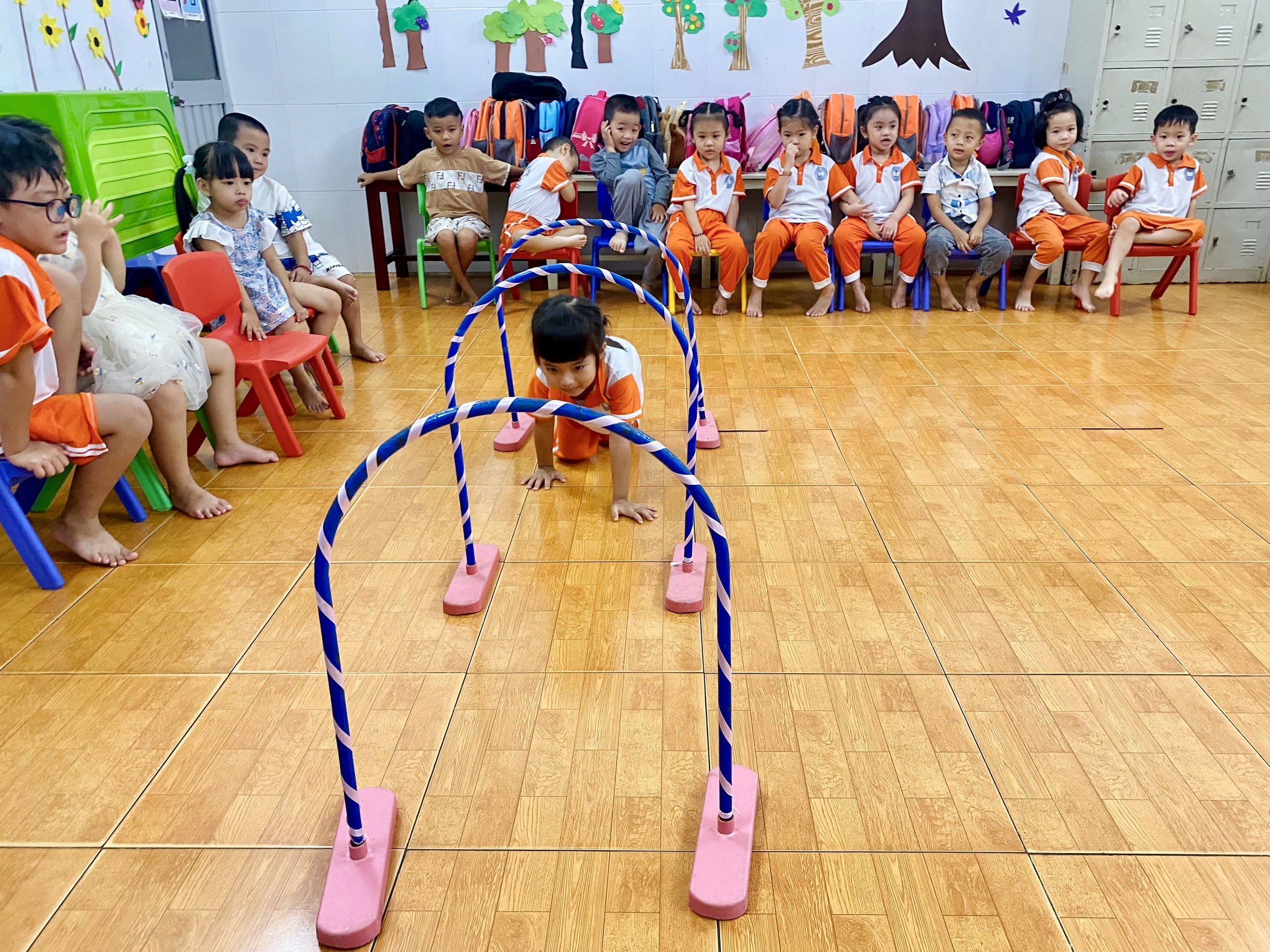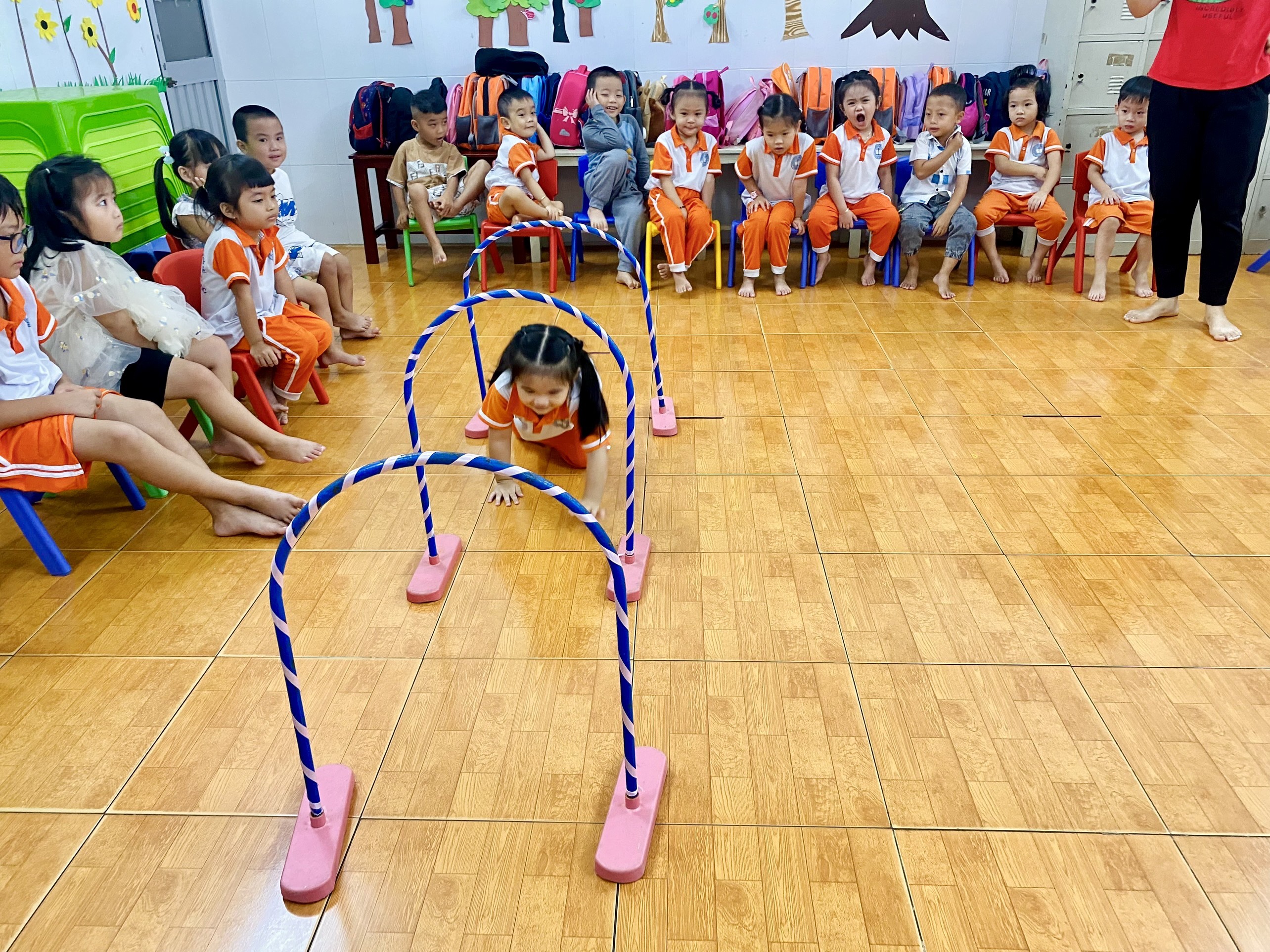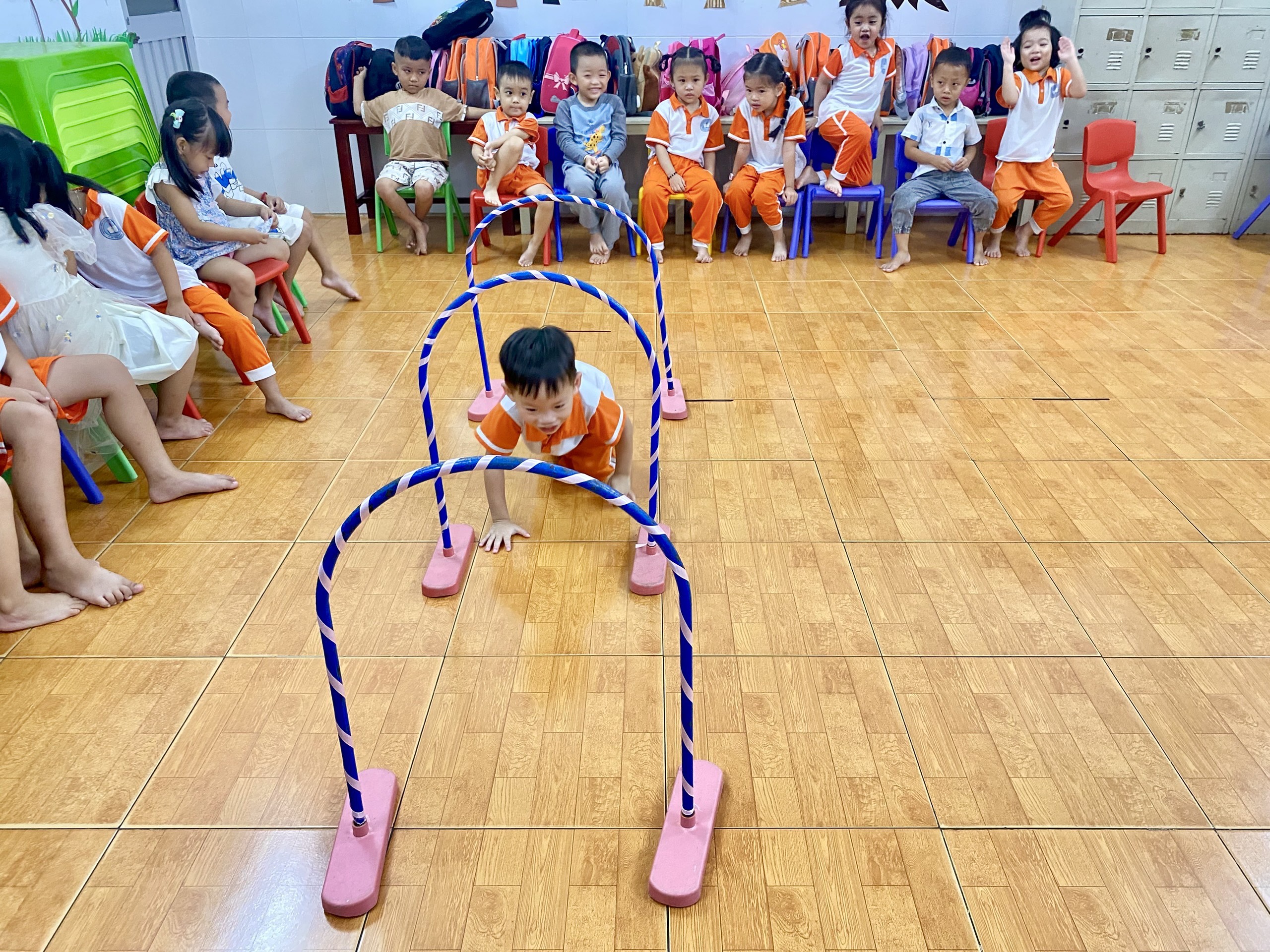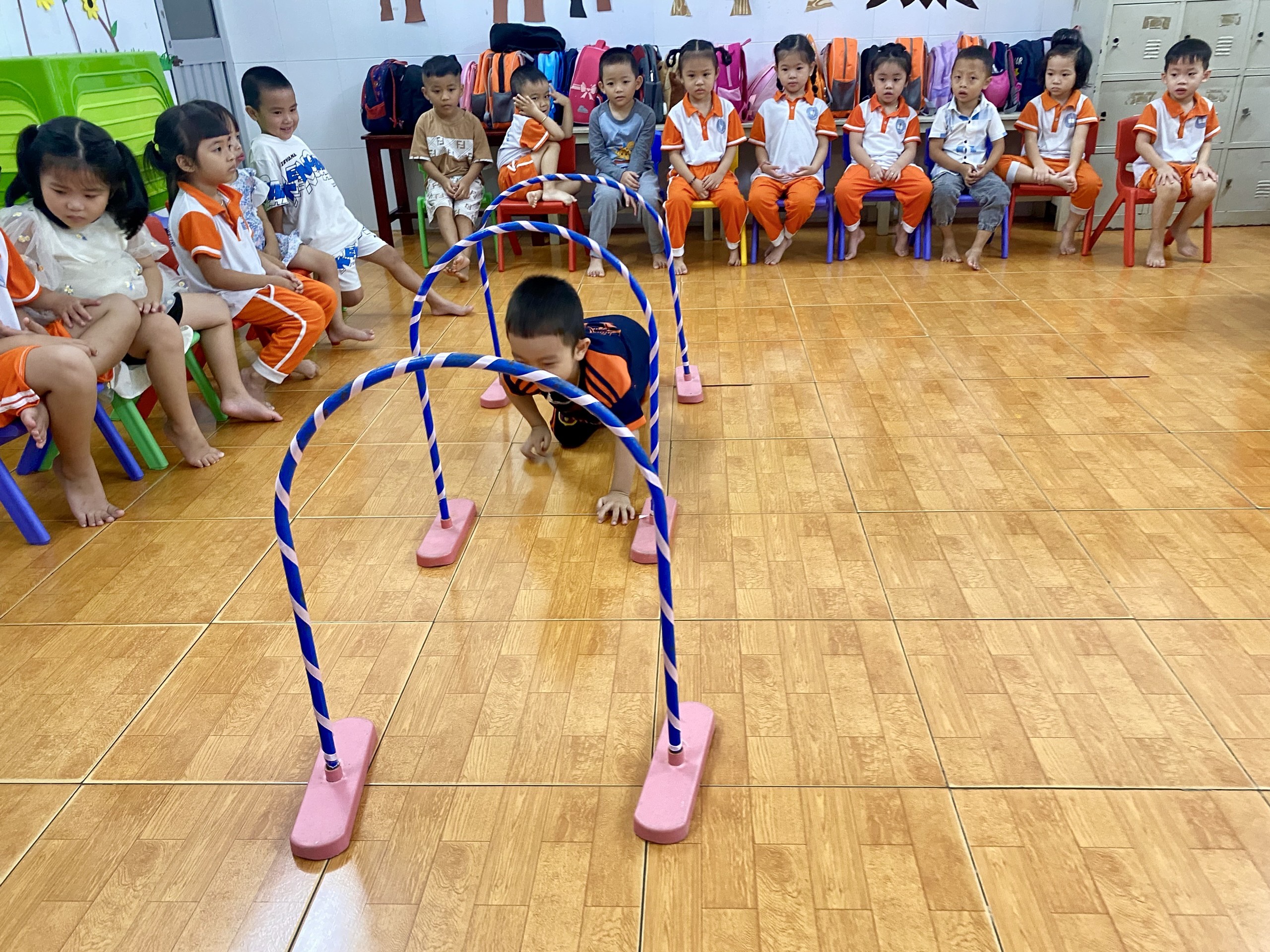 Sau khi chui qua cổng, trẻ sẽ được khuyến khích bật nhảy. Bật nhảy là một hoạt động vận động toàn diện, giúp trẻ rèn luyện sự mạnh mẽ và linh hoạt của cơ thể. Trẻ sẽ được hướng dẫn cách bật nhảy và cải thiện kỹ năng nhảy qua việc luyện tập và trải nghiệm.