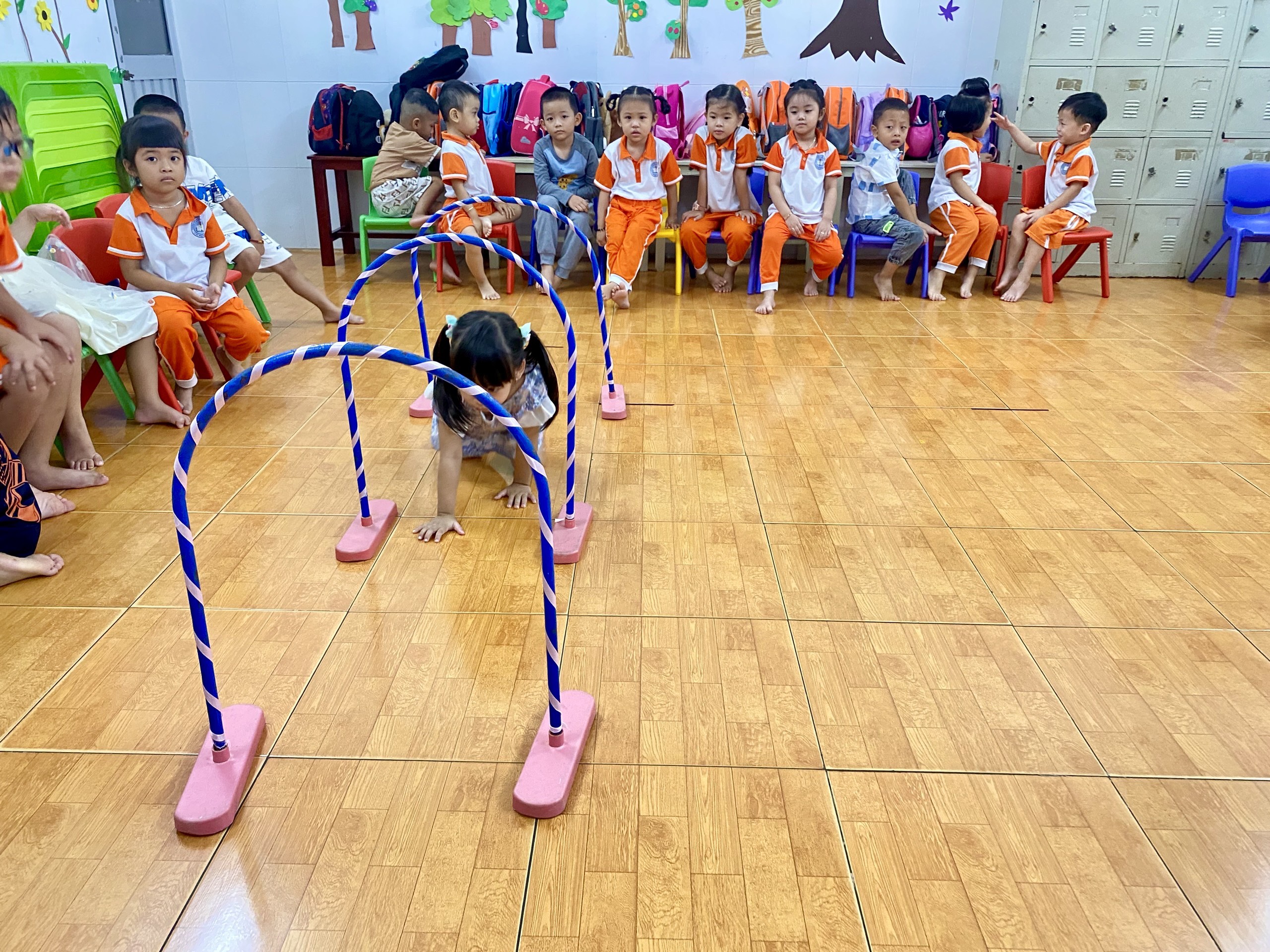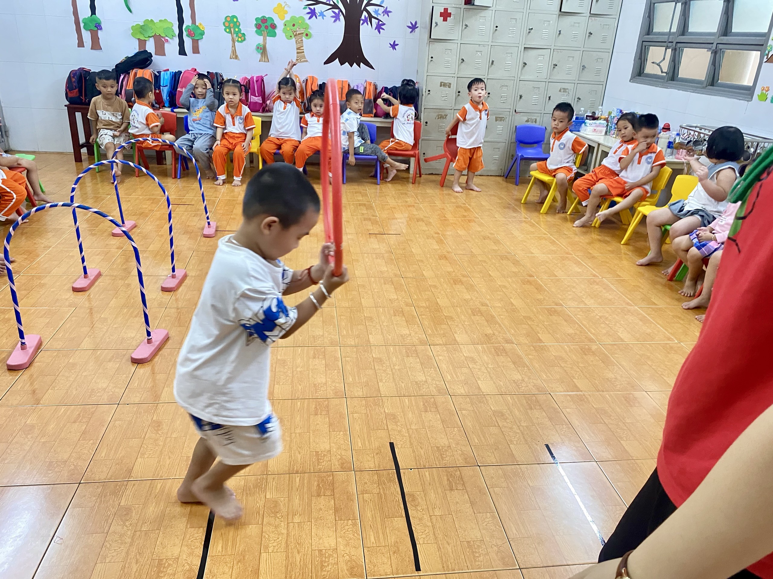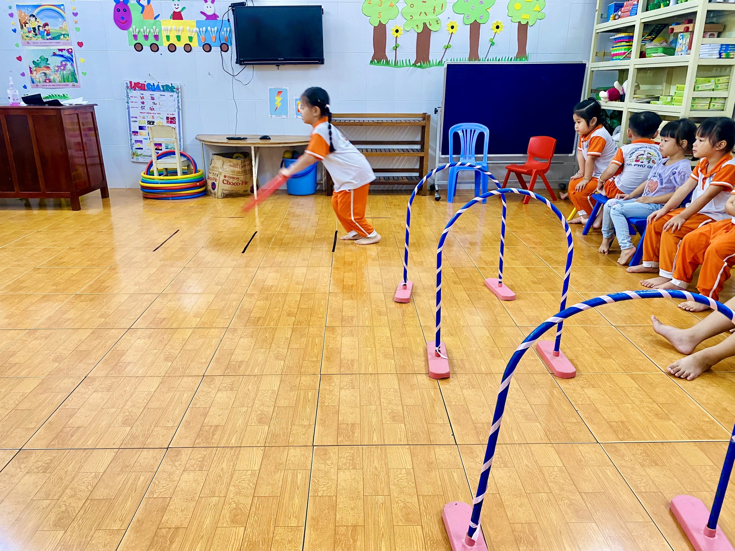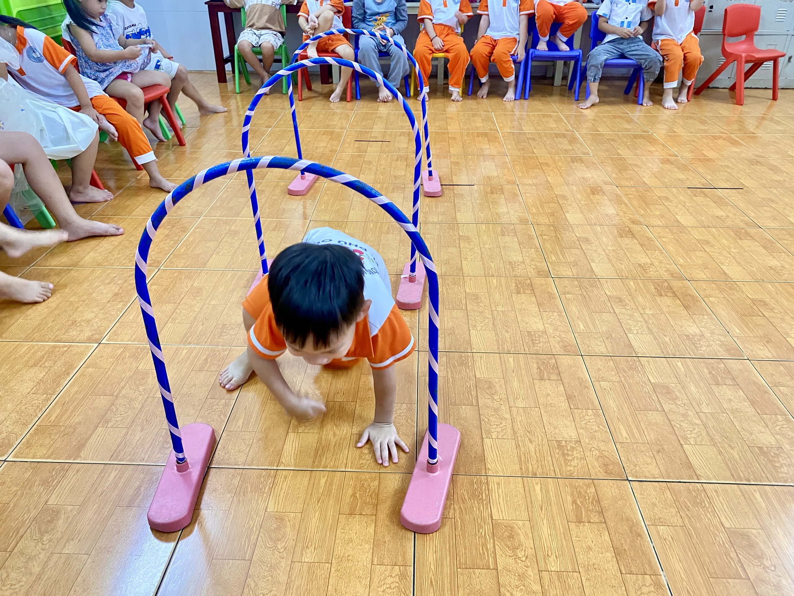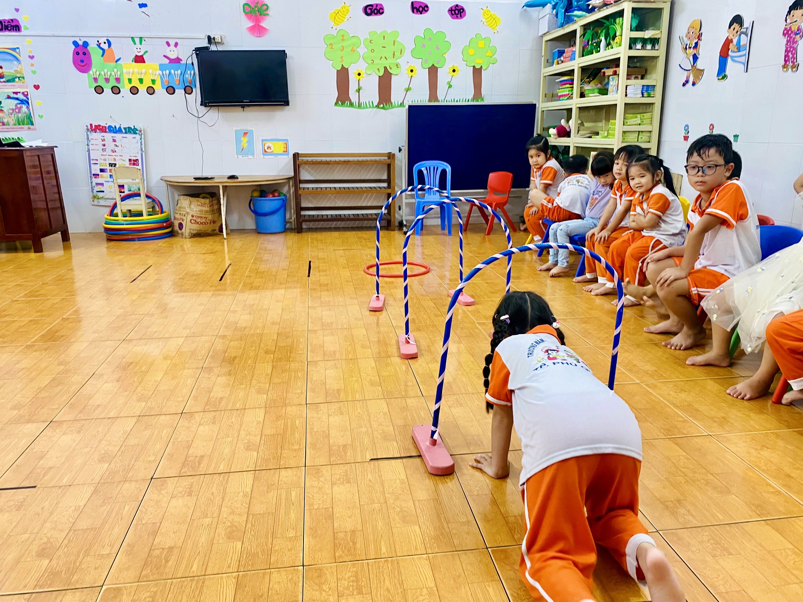 Sau khi chui qua cổng, trẻ sẽ được khuyến khích bật nhảy. Bật nhảy là một hoạt động vận động toàn diện, giúp trẻ rèn luyện sự mạnh mẽ và linh hoạt của cơ thể. Trẻ sẽ được hướng dẫn cách bật nhảy và cải thiện kỹ năng nhảy qua việc luyện tập và trải nghiệm.