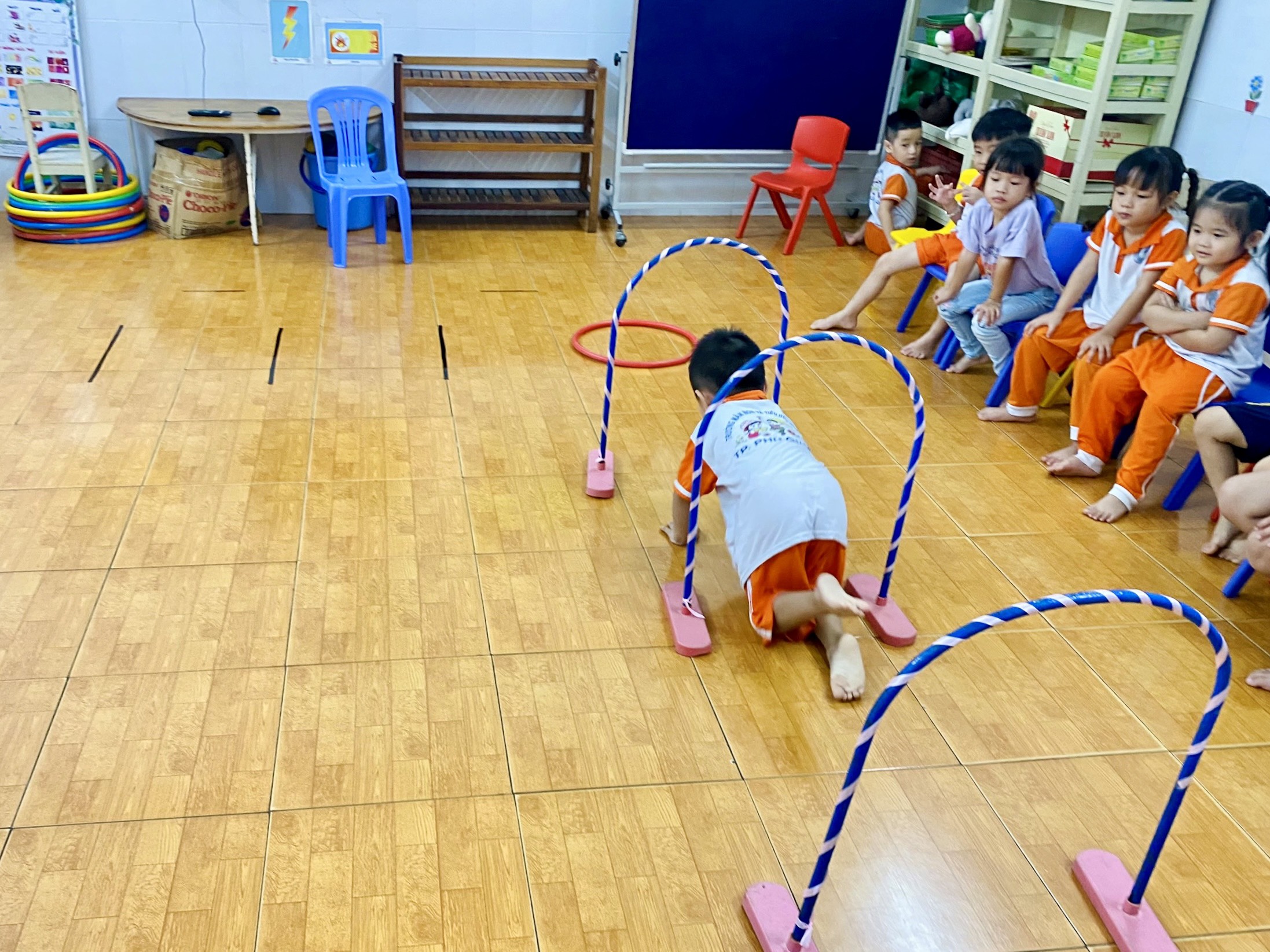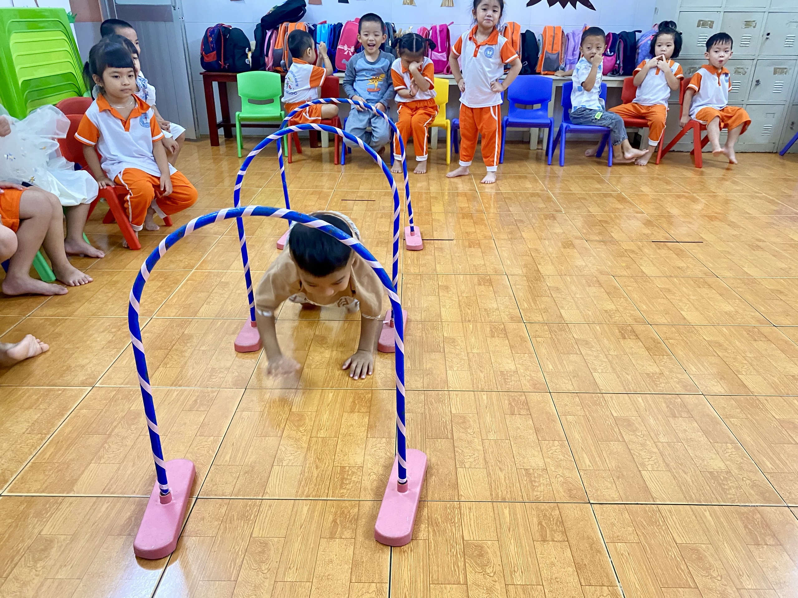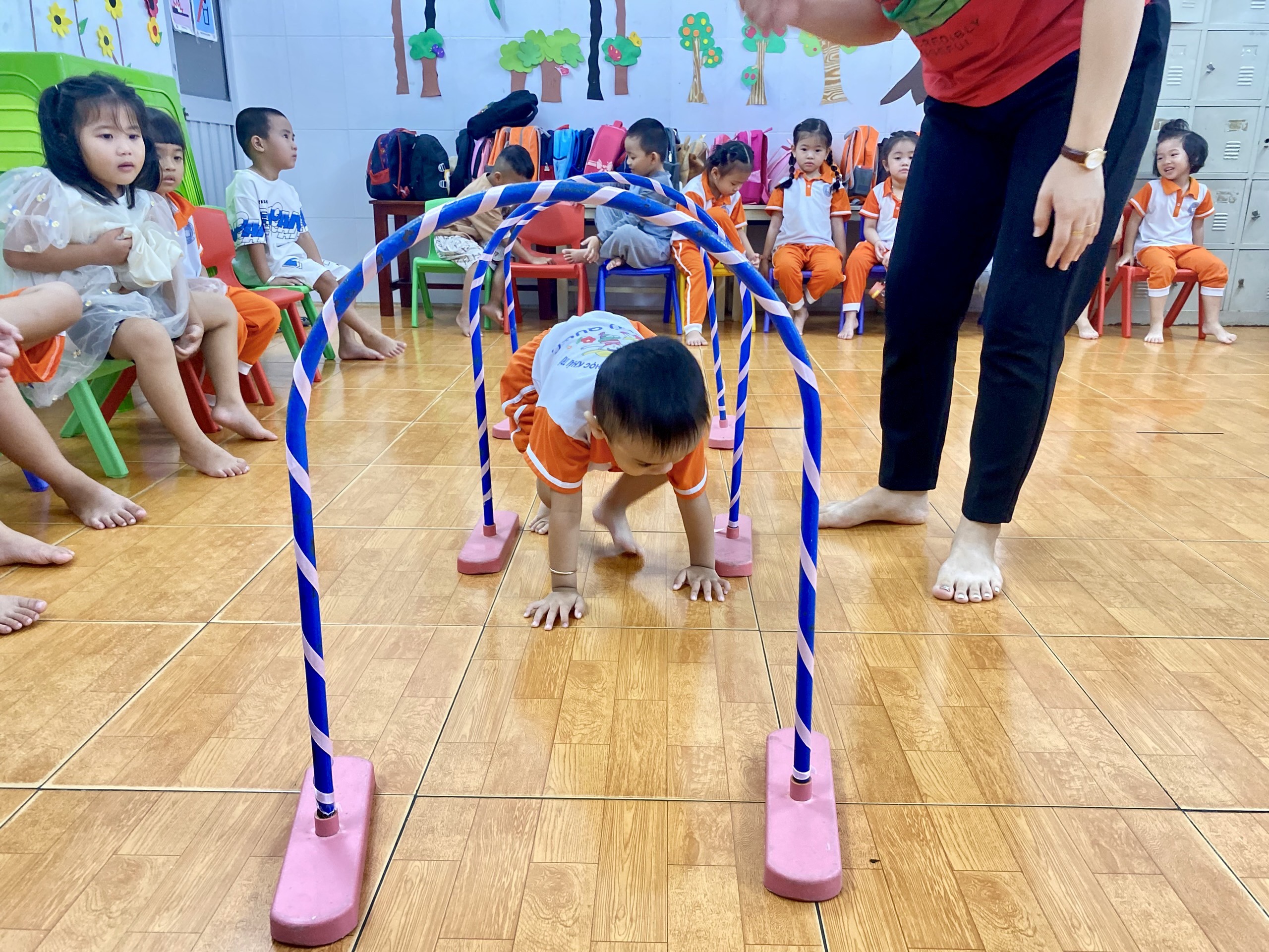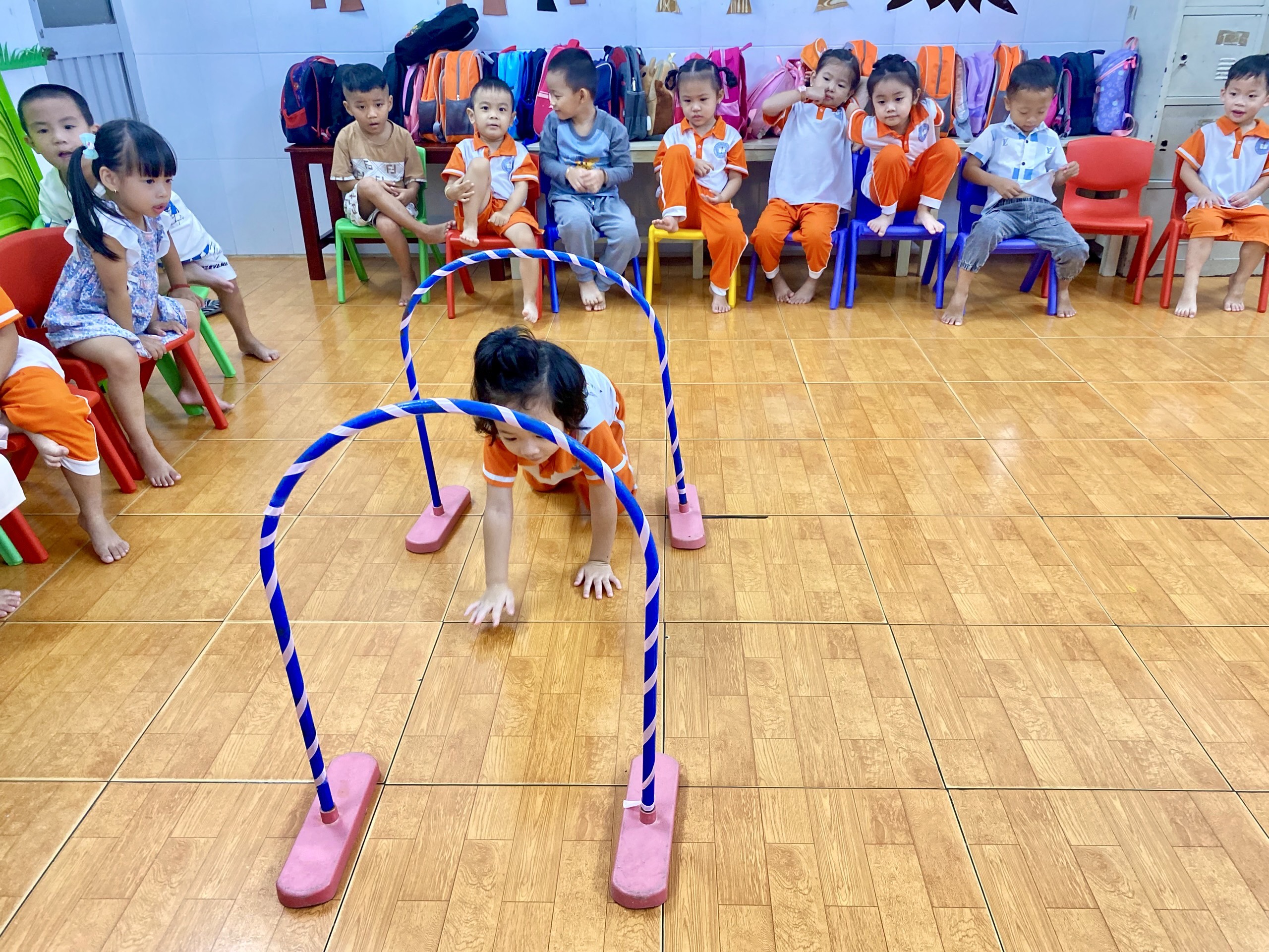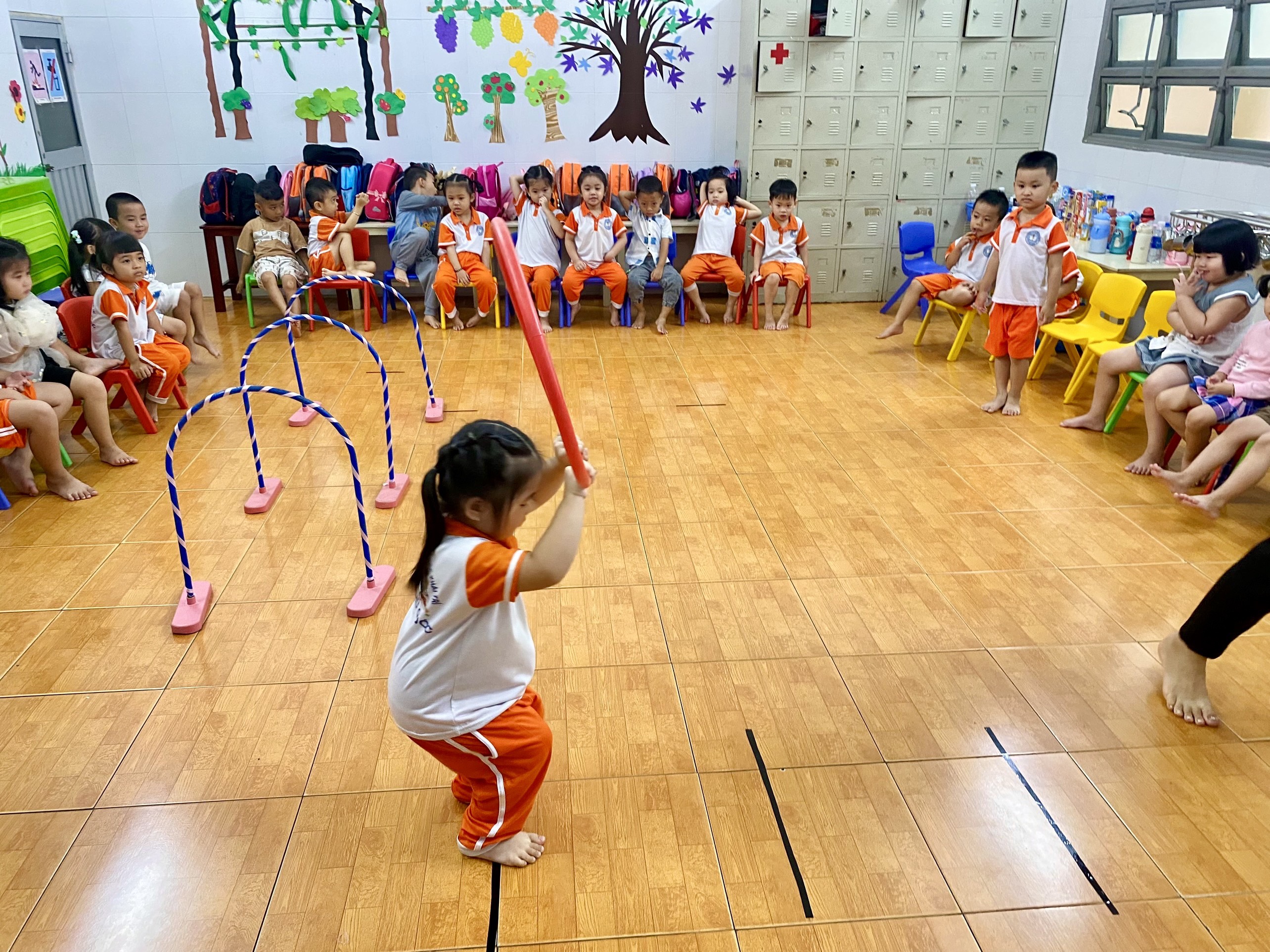 Sau khi chui qua cổng, trẻ sẽ được khuyến khích bật nhảy. Bật nhảy là một hoạt động vận động toàn diện, giúp trẻ rèn luyện sự mạnh mẽ và linh hoạt của cơ thể. Trẻ sẽ được hướng dẫn cách bật nhảy và cải thiện kỹ năng nhảy qua việc luyện tập và trải nghiệm.