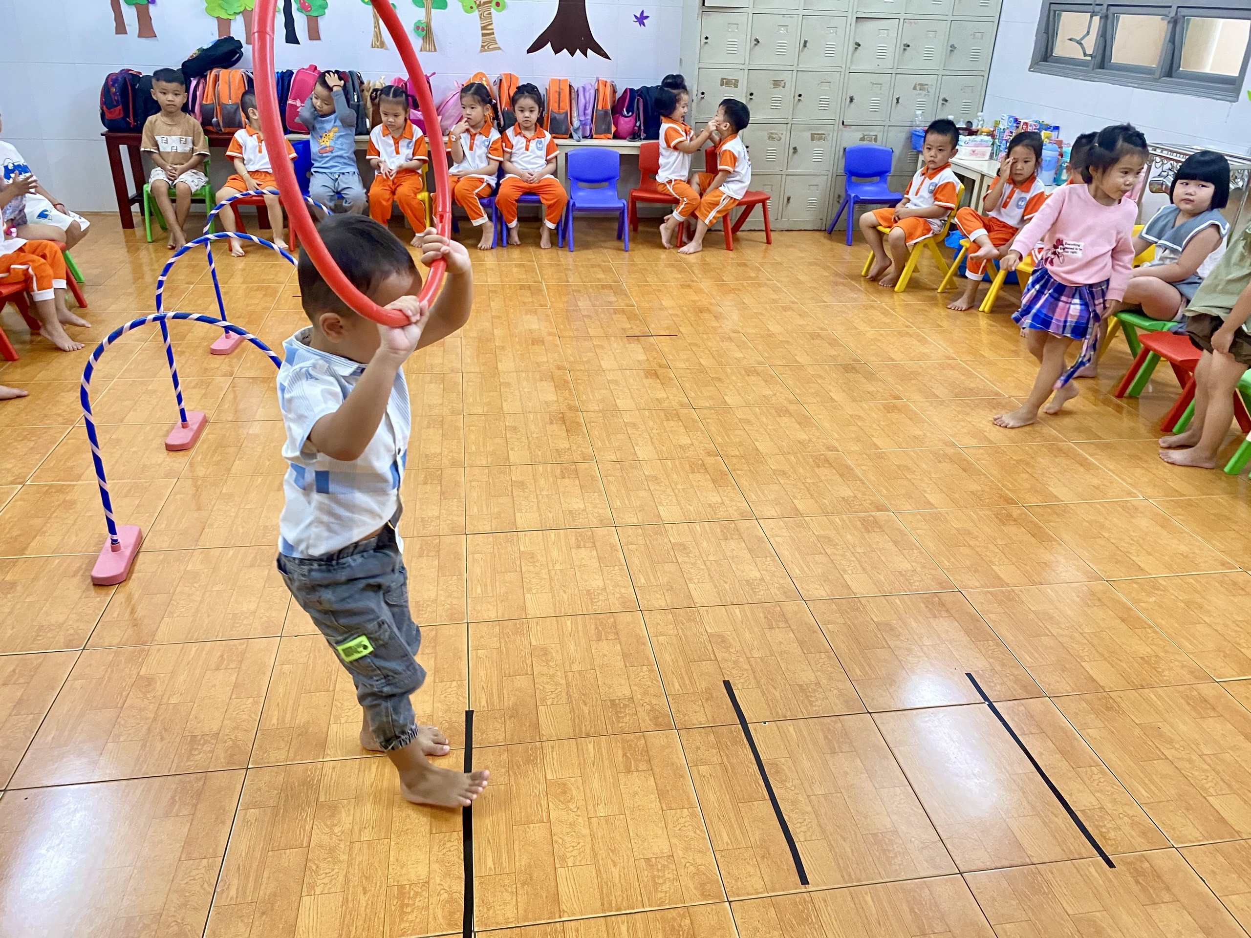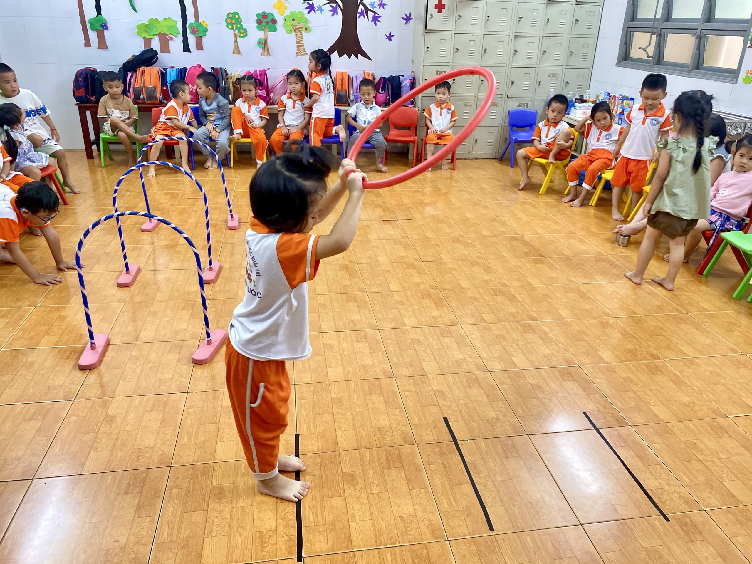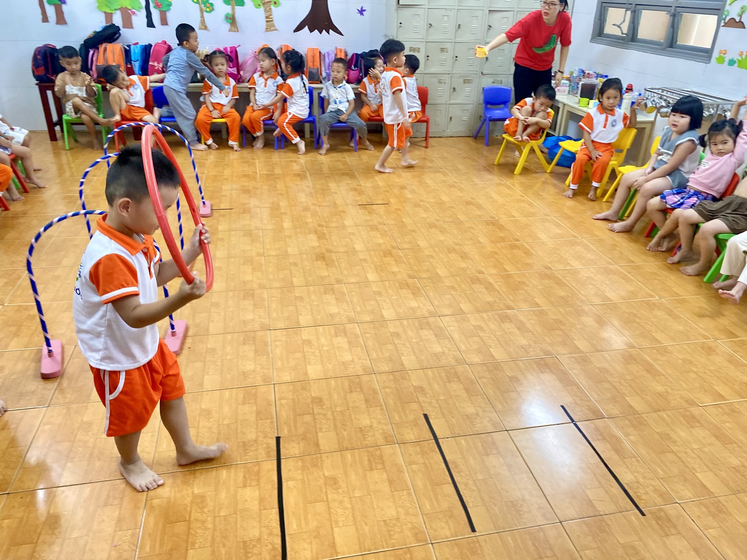 Một trong những yếu tố quan trọng trong hoạt động này là cầm vòng nhảy qua vạch. Trẻ sẽ được hướng dẫn cách cầm và sử dụng vòng nhảy để vượt qua vạch. Việc cầm vòng nhảy giúp trẻ rèn luyện tay, cổ tay và cơ bắp cánh tay, đồng thời cải thiện sự điều chỉnh và tăng cường khả năng tập trung.