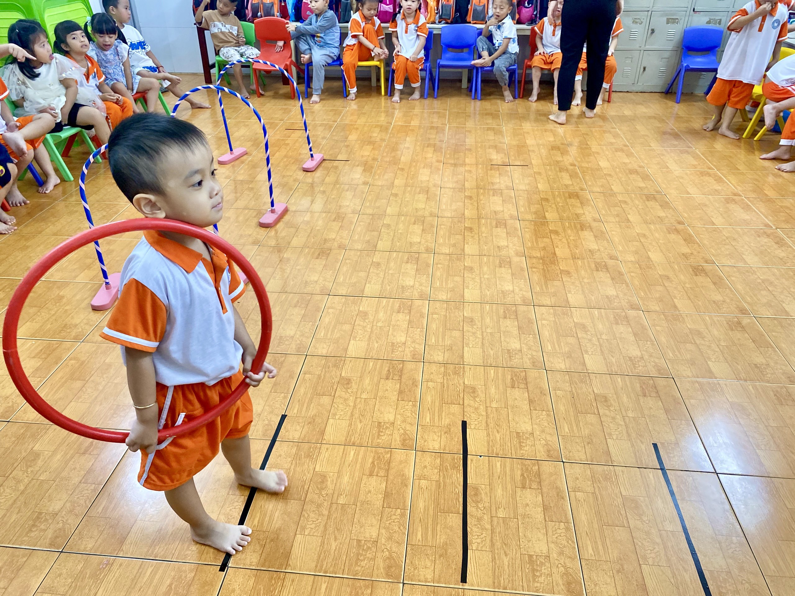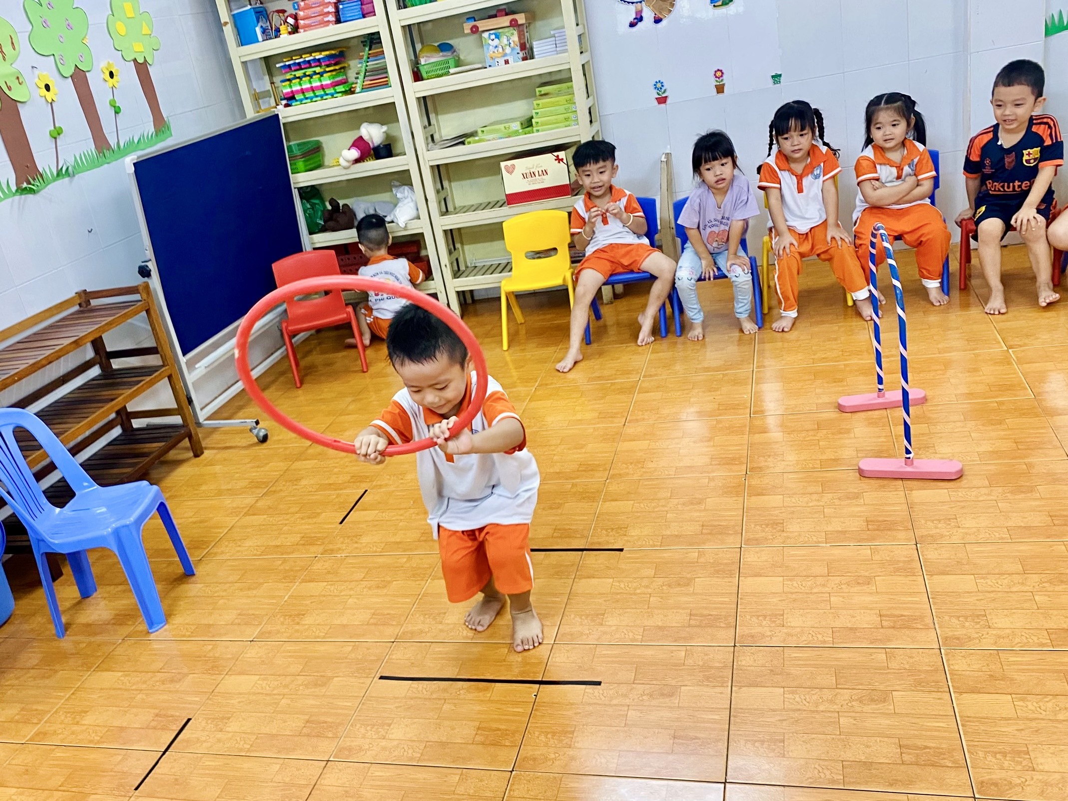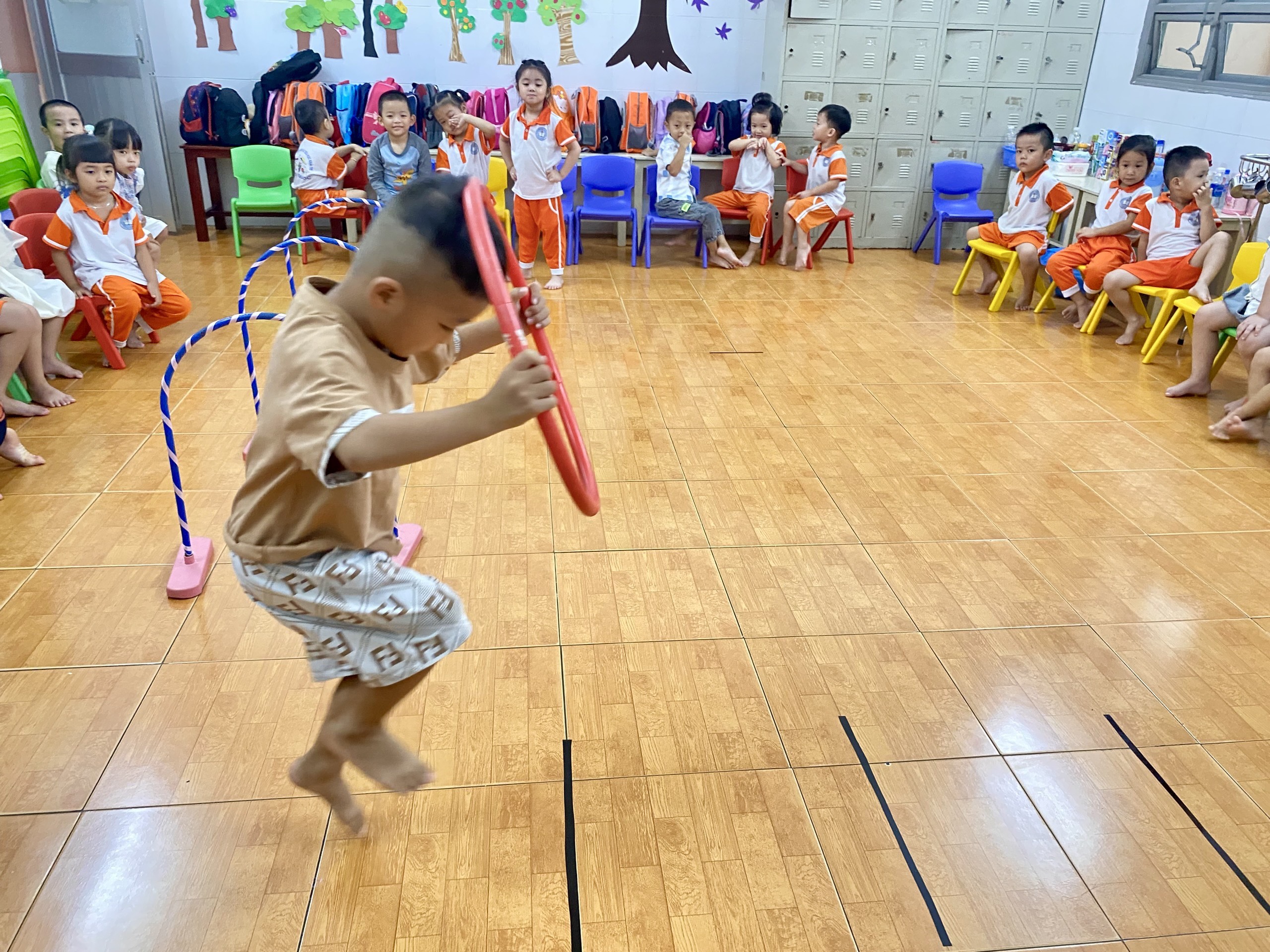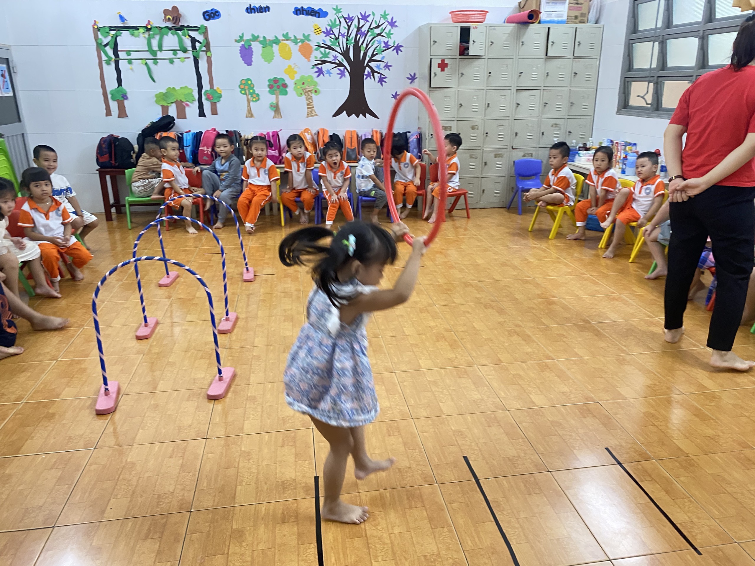 Một trong những yếu tố quan trọng trong hoạt động này là cầm vòng nhảy qua vạch. Trẻ sẽ được hướng dẫn cách cầm và sử dụng vòng nhảy để vượt qua vạch. Việc cầm vòng nhảy giúp trẻ rèn luyện tay, cổ tay và cơ bắp cánh tay, đồng thời cải thiện sự điều chỉnh và tăng cường khả năng tập trung.