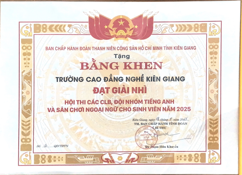 Trong hoạt động phong trào, tôi đạt Giải Nhì Hội thi Tiếng Anh dành cho Hội – Nhóm – Câu lạc bộ cấp tỉnh năm 2025, thể hiện khả năng ngoại ngữ, làm việc nhóm và tham gia tích cực các sân chơi học thuật.