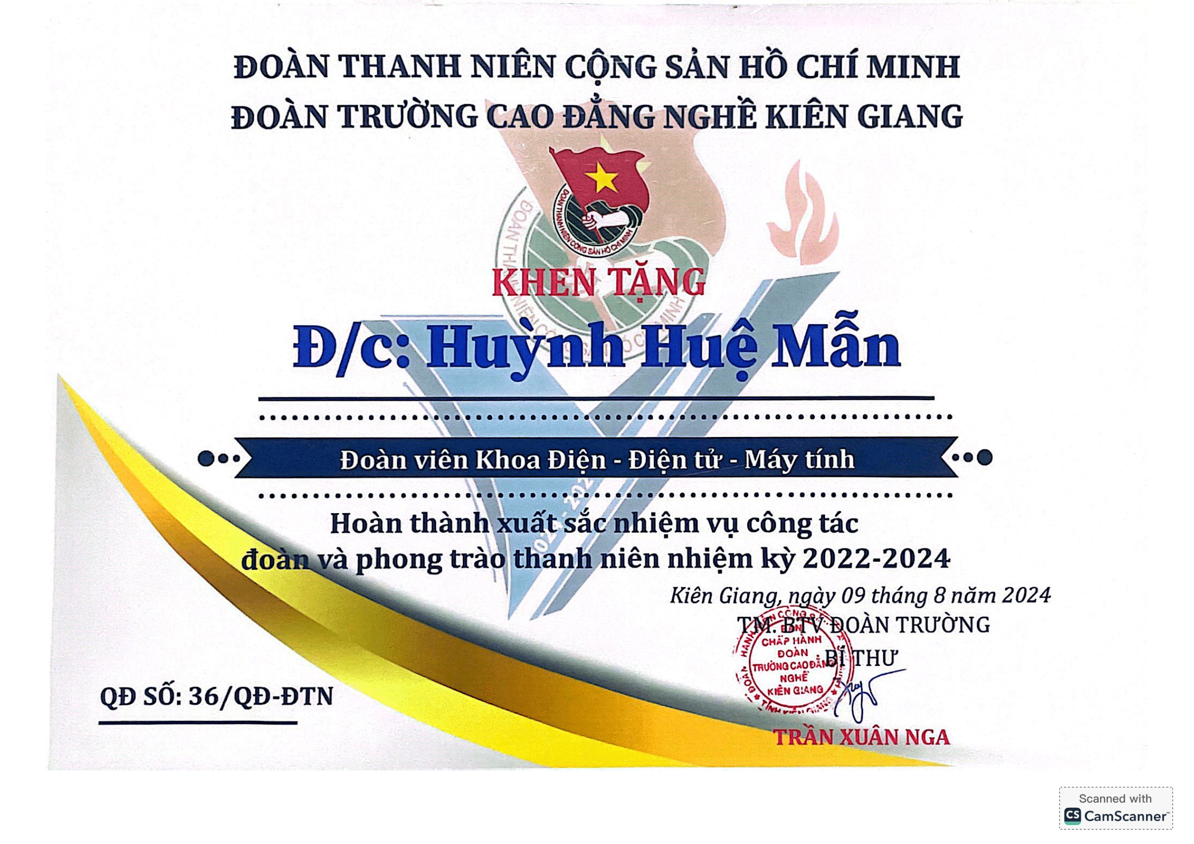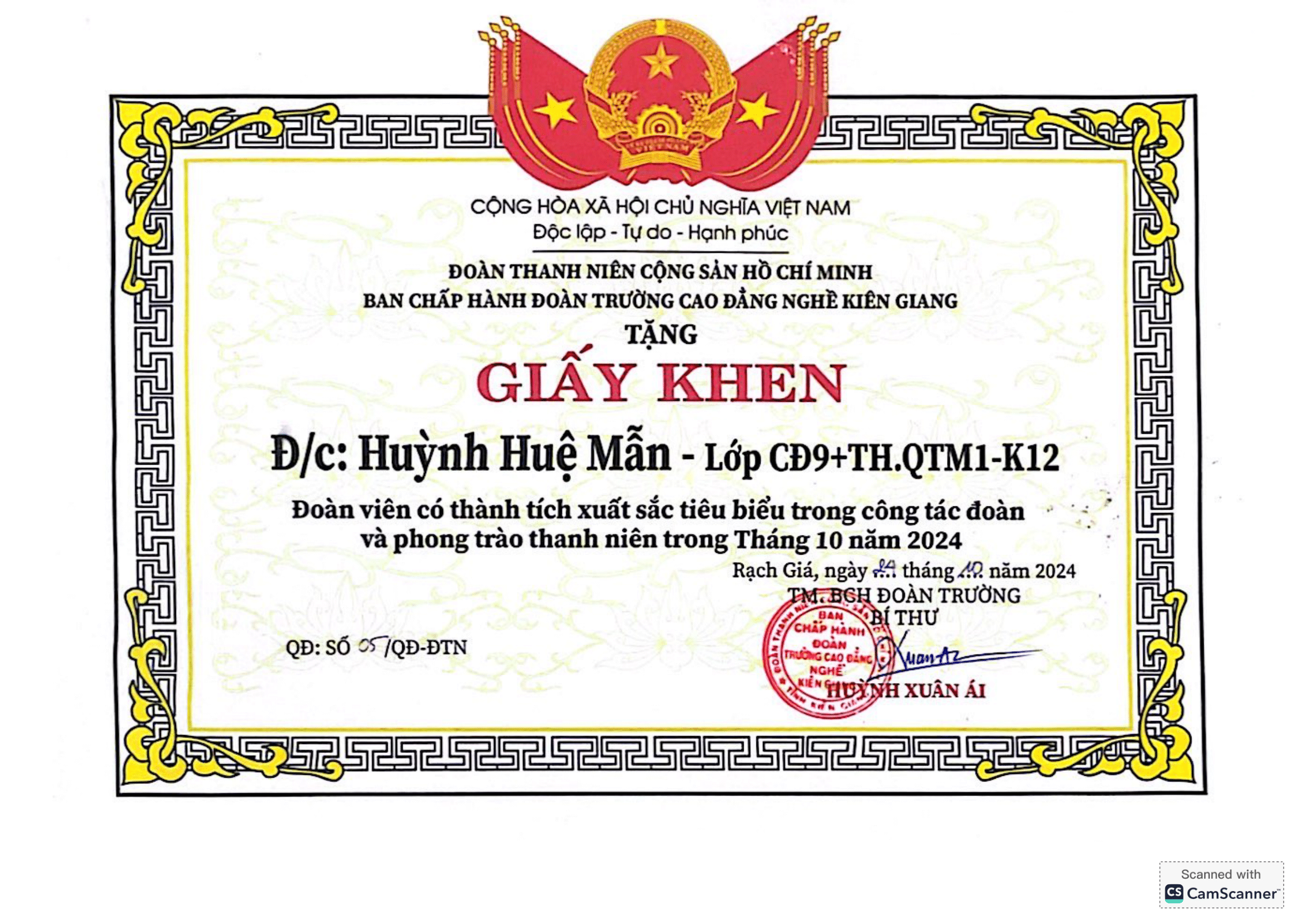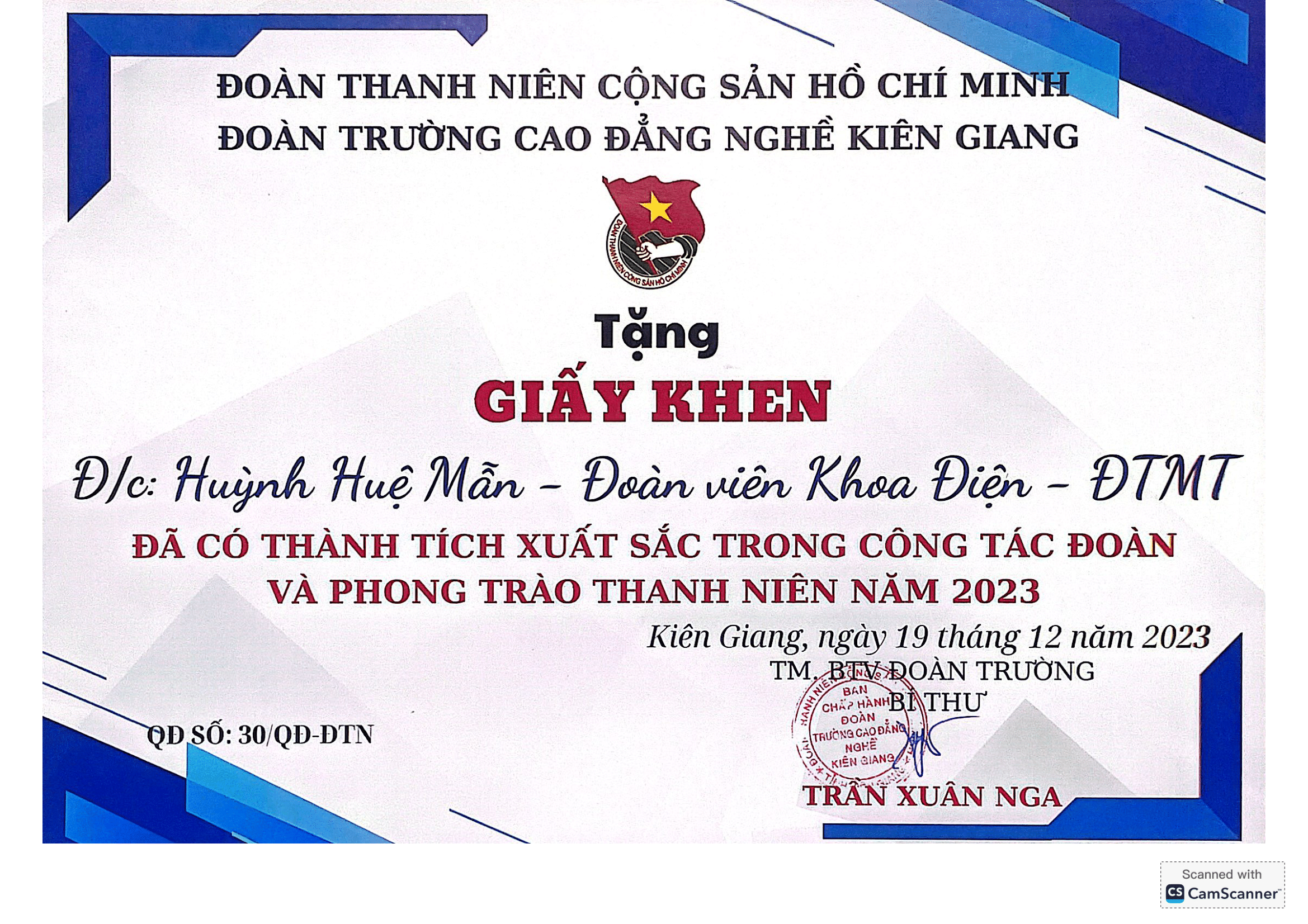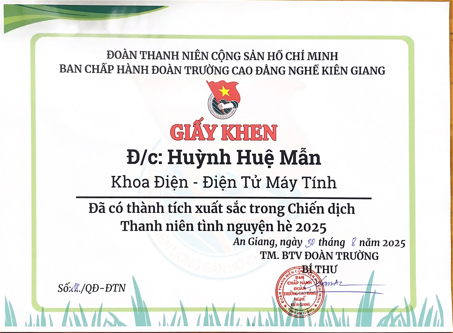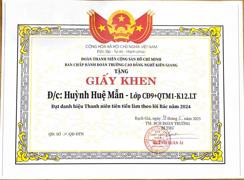 Ngoài ra, tôi là đoàn viên có thành tích xuất sắc trong công tác Đoàn và phong trào thanh niên liên tục các năm 2023, 2024 và 2025, ghi nhận sự đóng góp tích cực trong hoạt động Đoàn – Hội và công tác sinh viên.