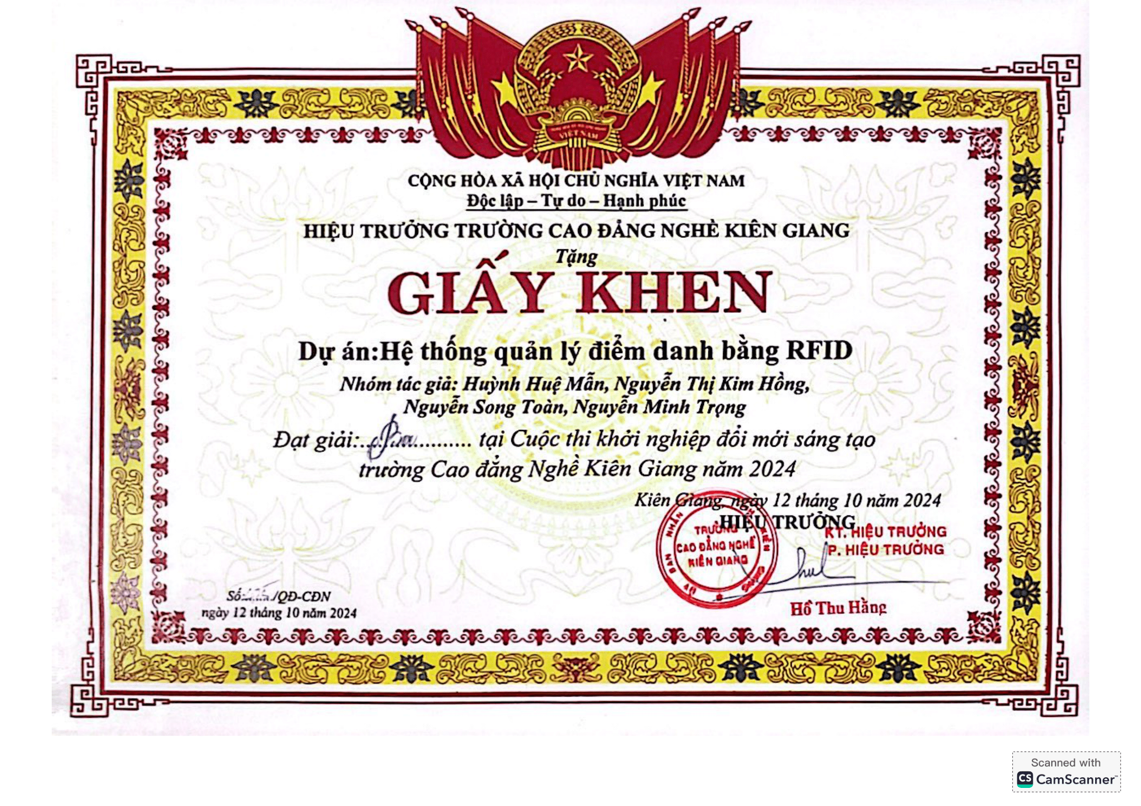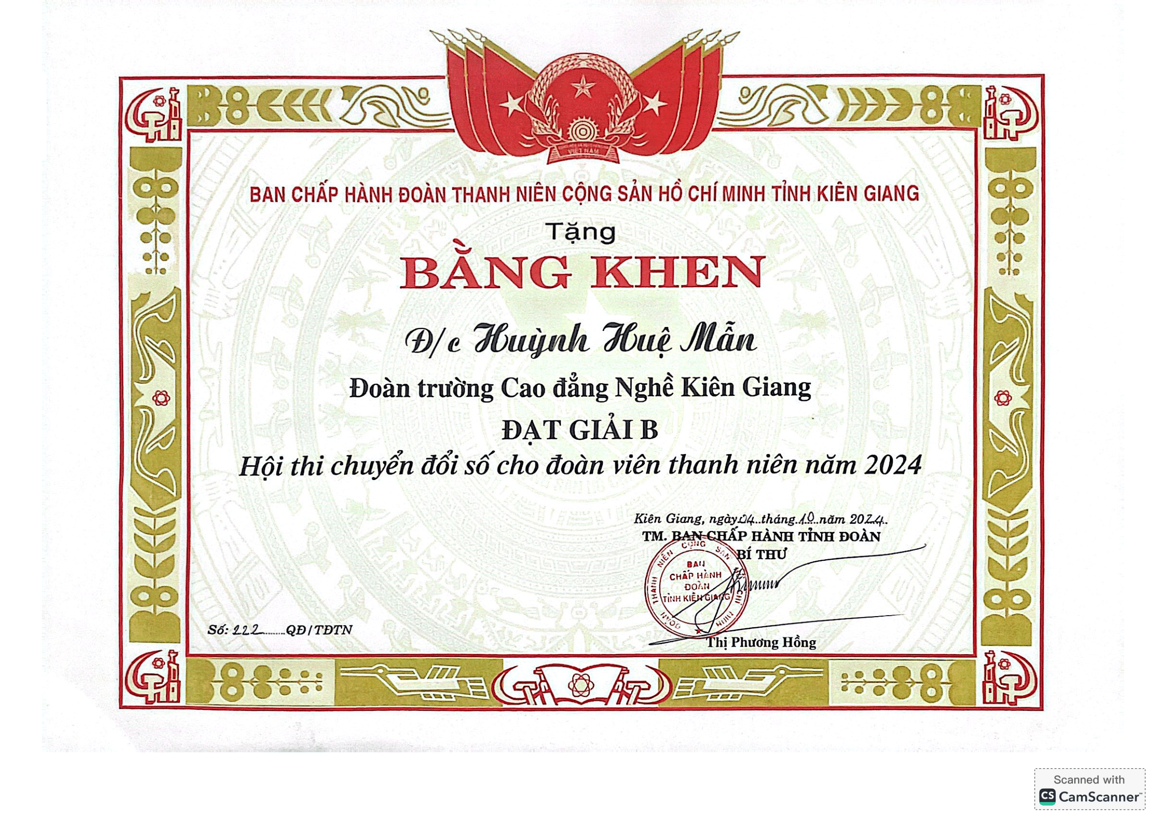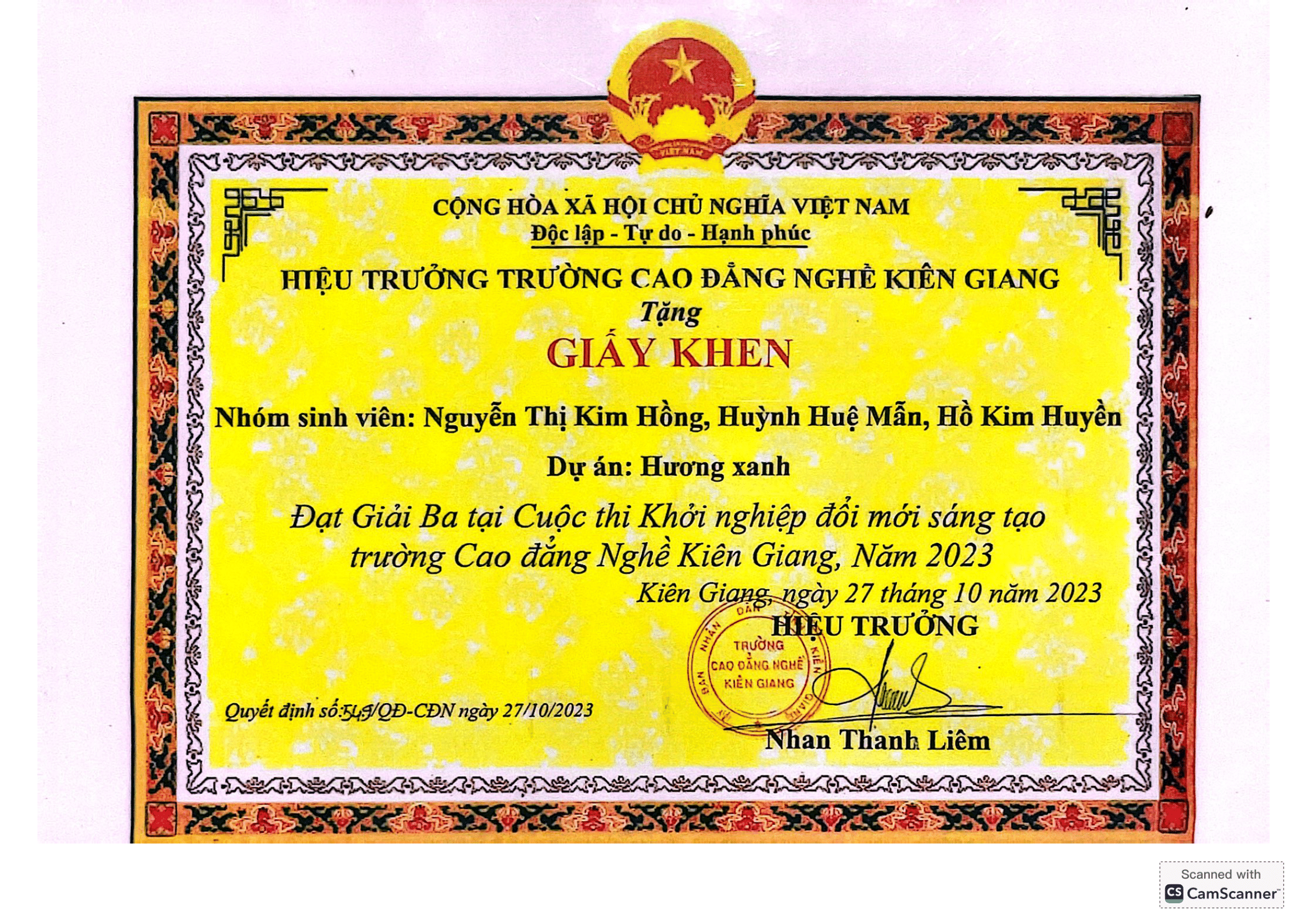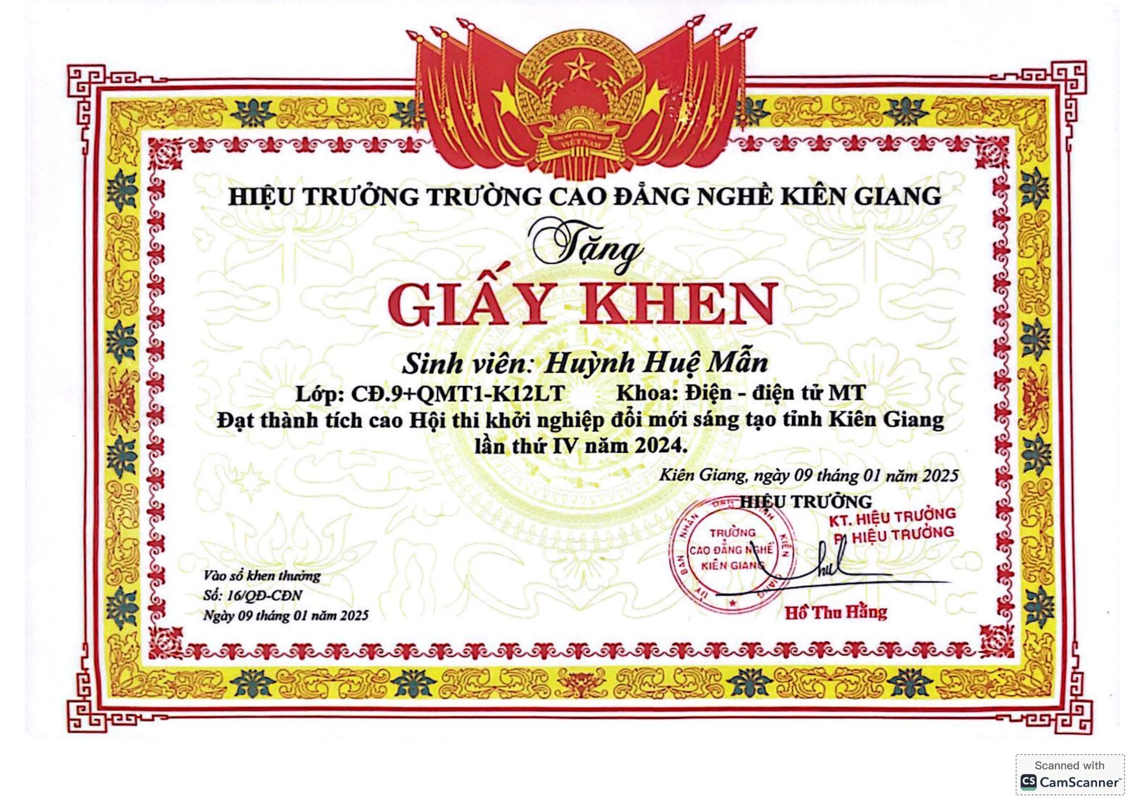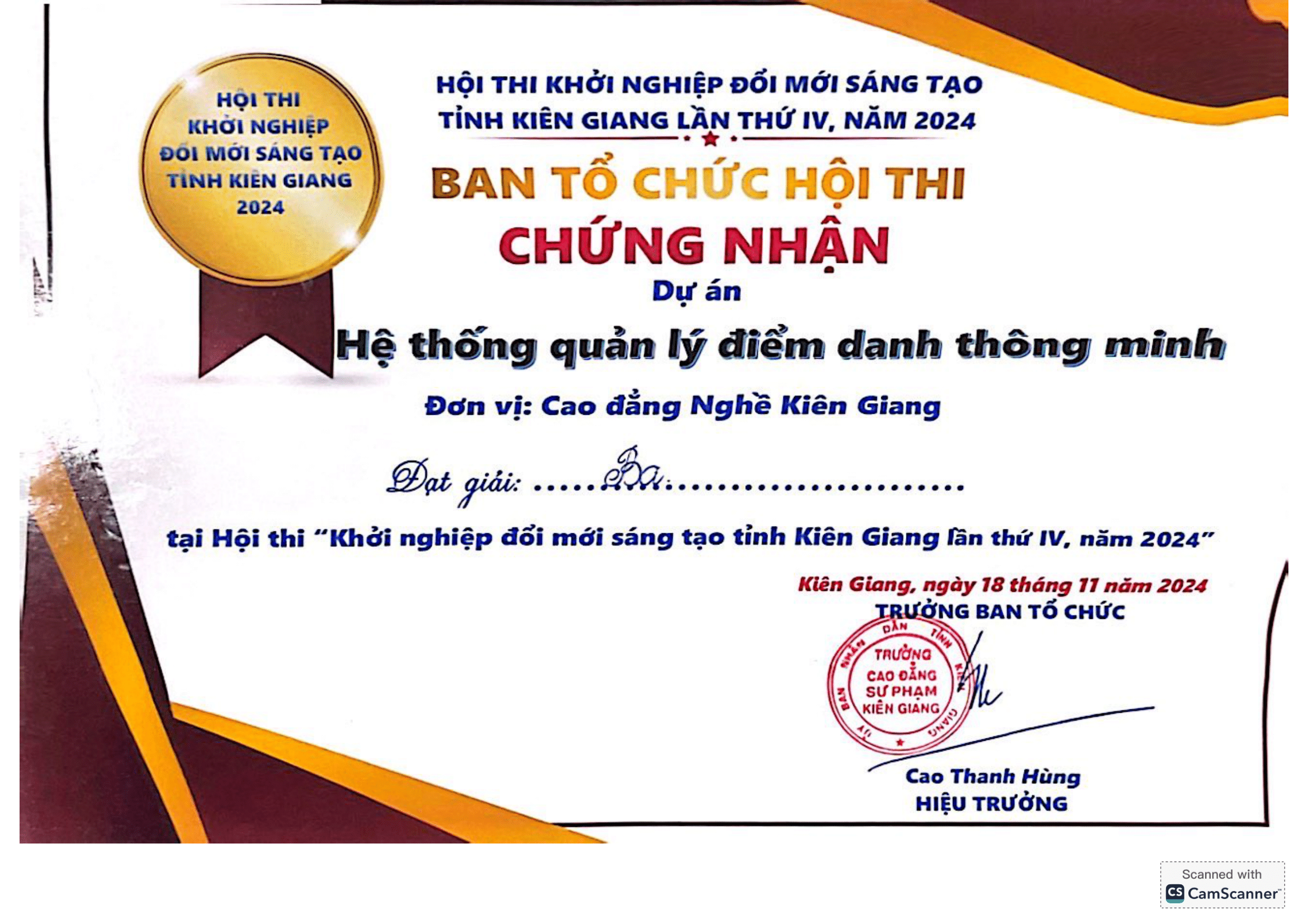 Bên cạnh học tập, tôi may mắn đạt được nhiều giải thưởng từ cấp trường đến cấp tỉnh, cả ở hình thức cá nhân và đội nhóm. Tiêu biểu gồm: Giải Ba Hội thi Sáng tạo Kỹ thuật tỉnh An Giang lần thứ X (2024–2025) cùng giảng viên hướng dẫn; Giải Ba Hội thi Khởi nghiệp Đổi mới Sáng tạo tỉnh Kiên Giang lần thứ IV (2024) cùng đội nhóm sinh viên; và Giải Ba Cuộc thi Khởi nghiệp Đổi mới Sáng tạo trong học sinh, sinh viên Trường Cao đẳng Nghề Kiên Giang năm 2024.