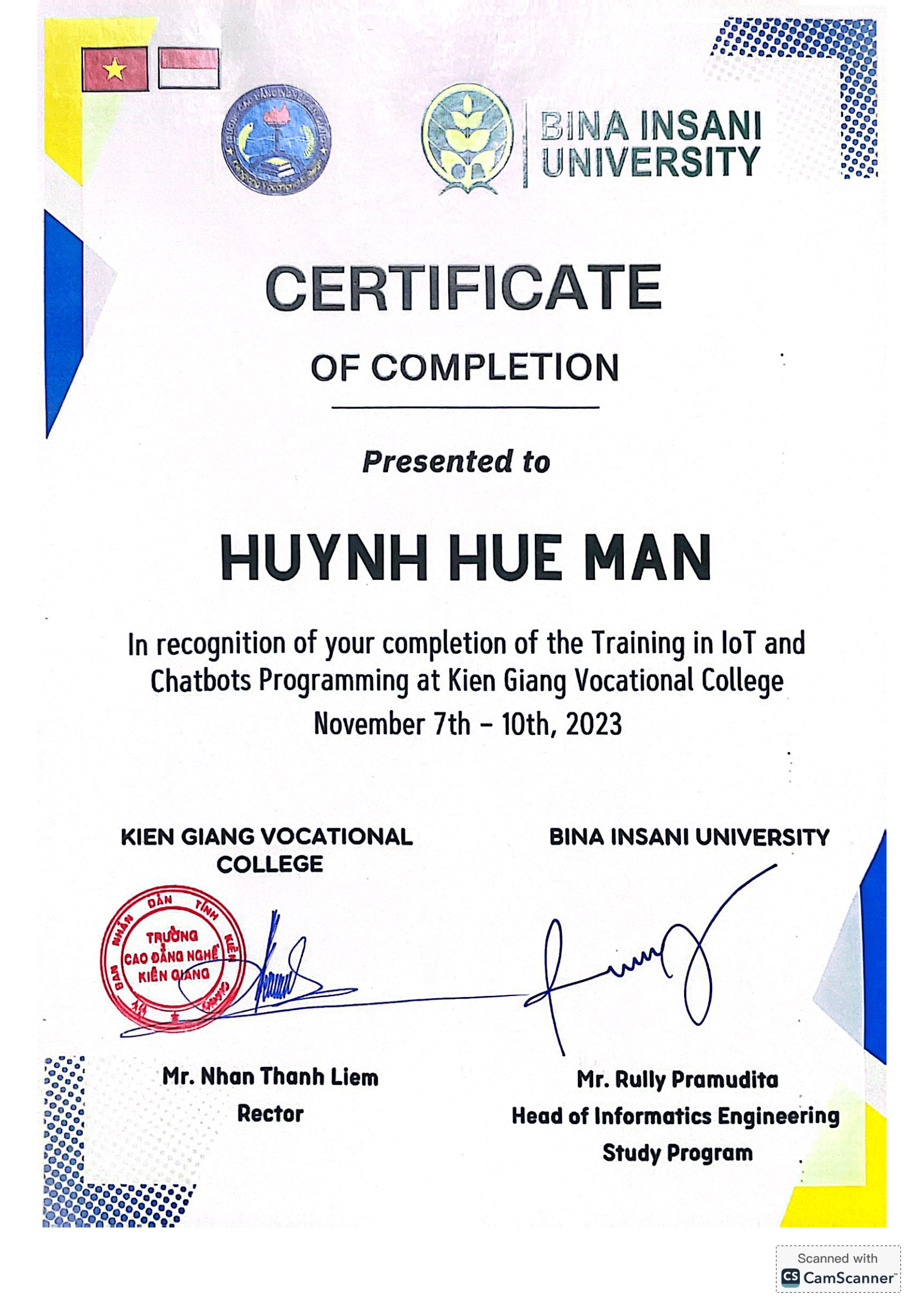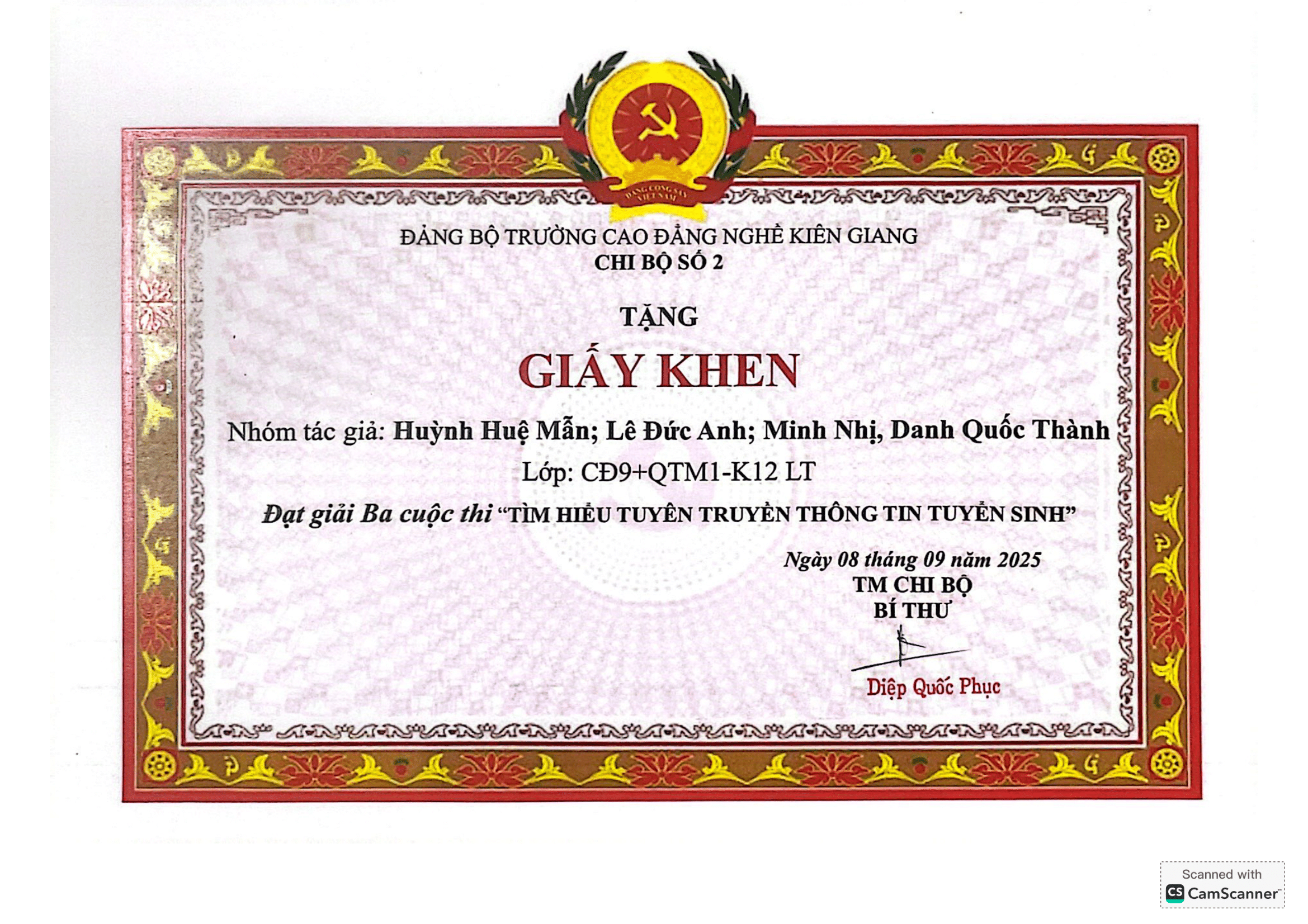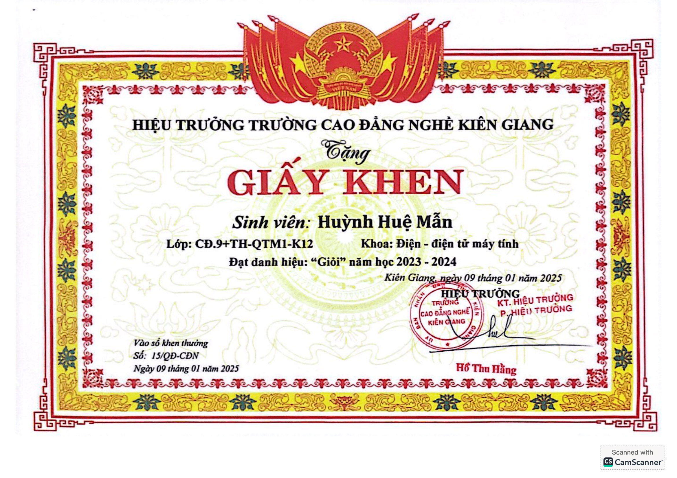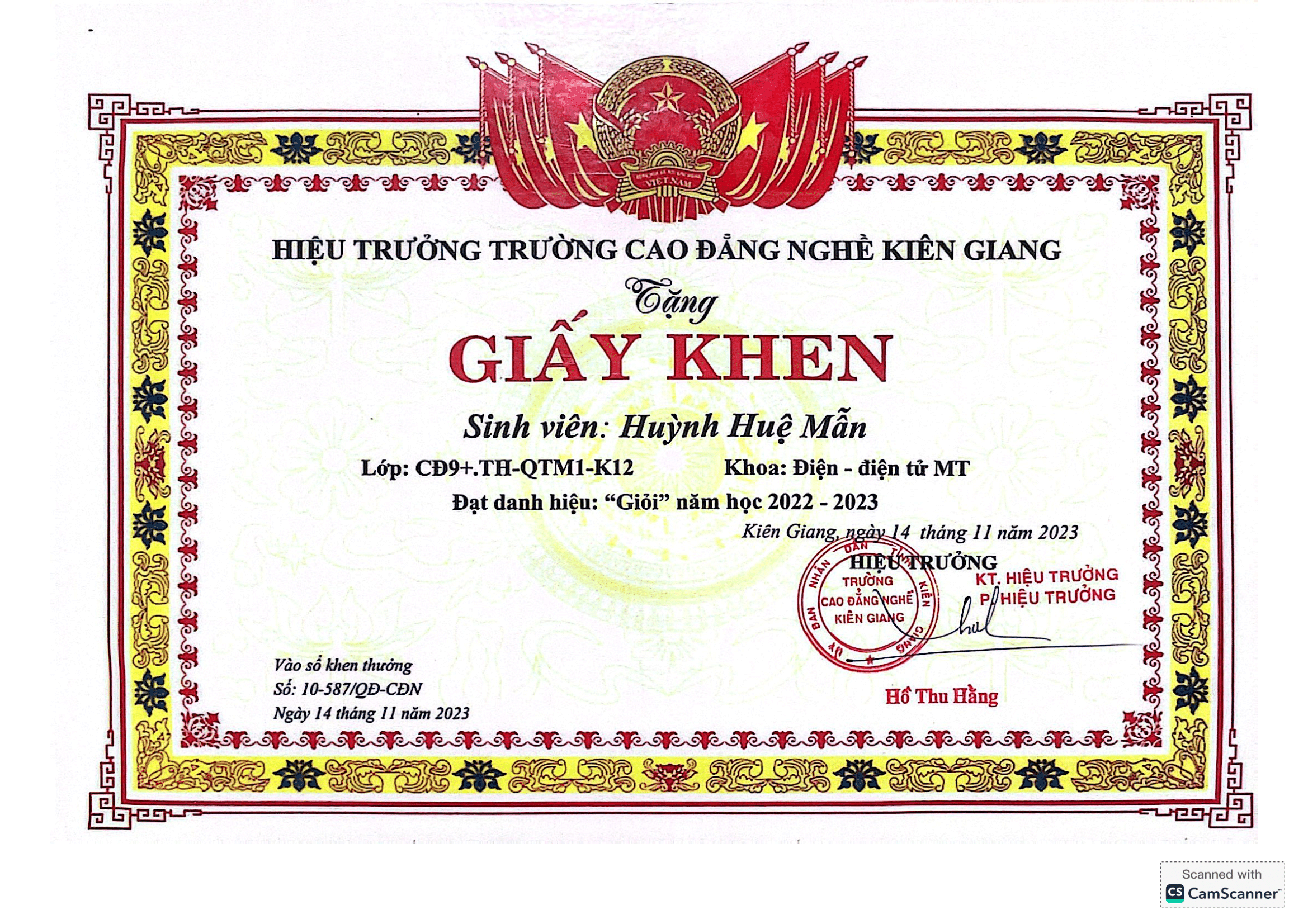 Trong quá trình học tập tại Trường Cao đẳng Nghề Kiên Giang, tôi duy trì kết quả học tập tốt và liên tục đạt học bổng loại Giỏi trong suốt 6 học kỳ của 3 năm học. Thành tích này thể hiện sự nỗ lực, tinh thần học tập nghiêm túc và khả năng tự học bền bỉ.