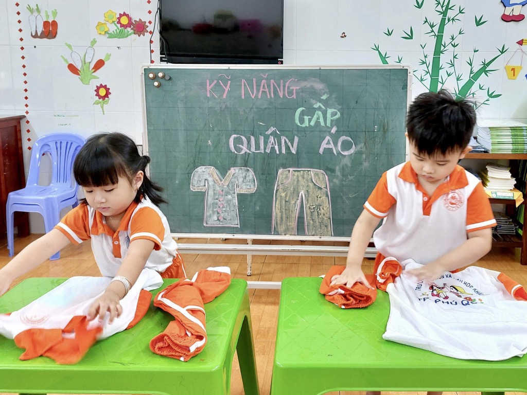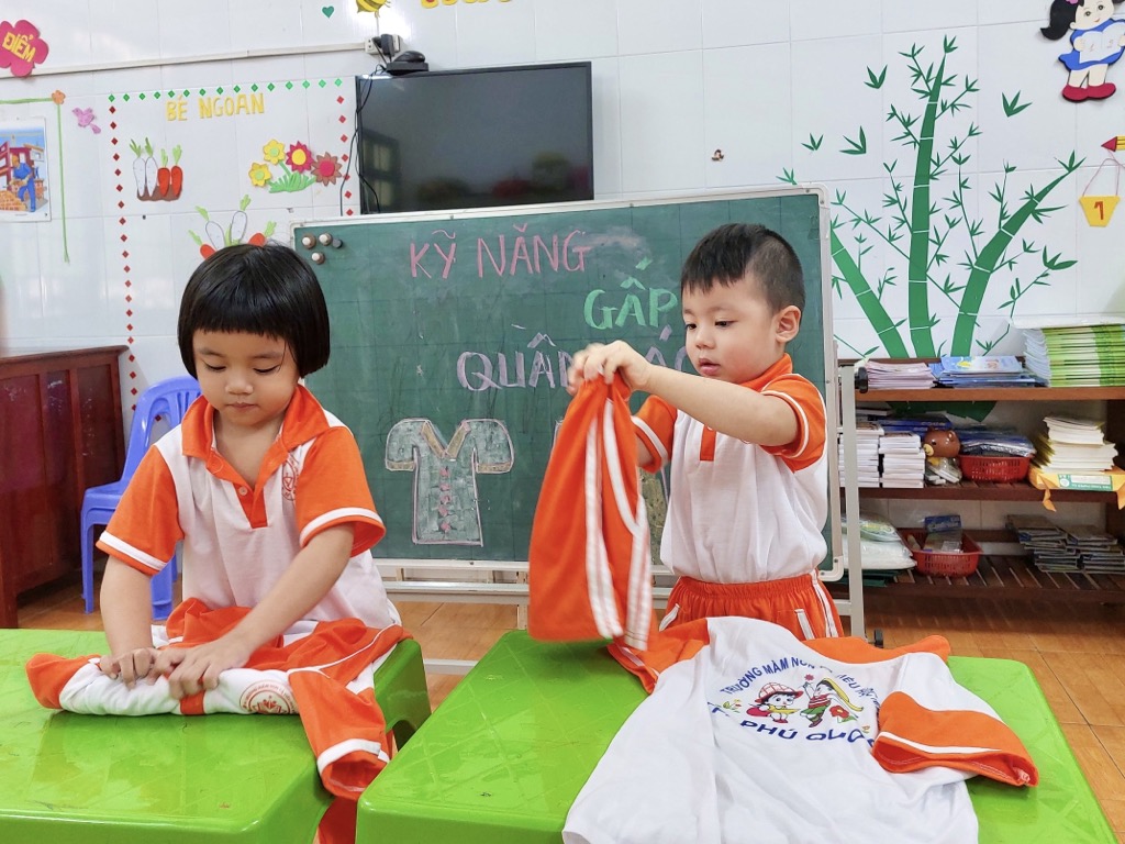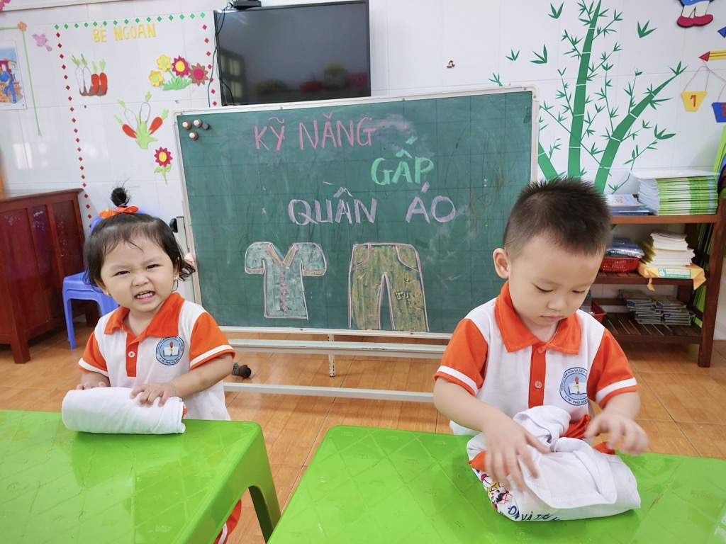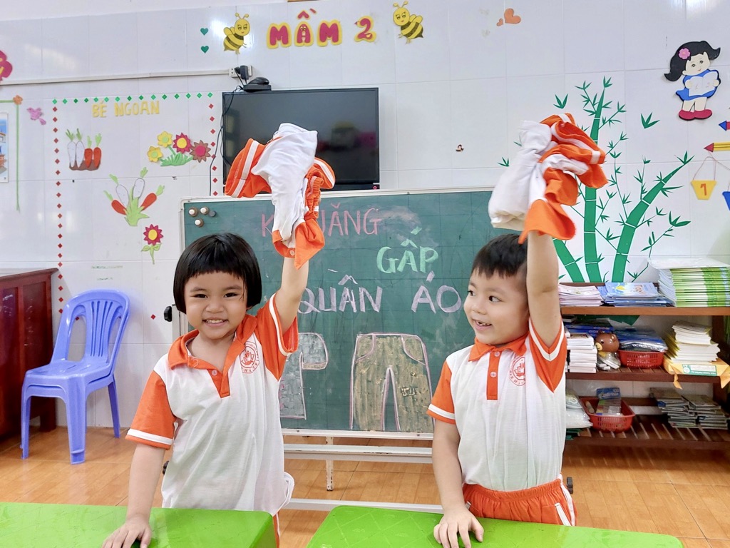 Tại trường Mầm non Khải Trí, việc giáo dục kỹ năng gấp quần áo cho các bé được coi là một phần quan trọng trong chương trình giáo dục. Kỹ năng này không chỉ giúp các bé tự chăm sóc bản thân mà còn giúp phát triển khả năng tập trung và sự tự lập.