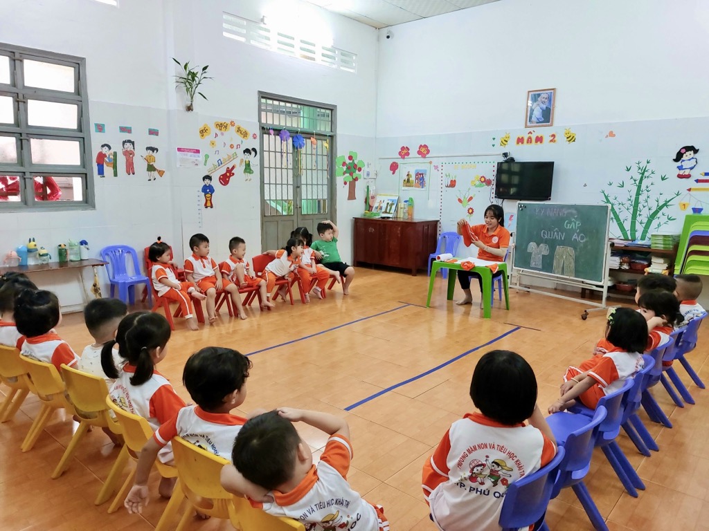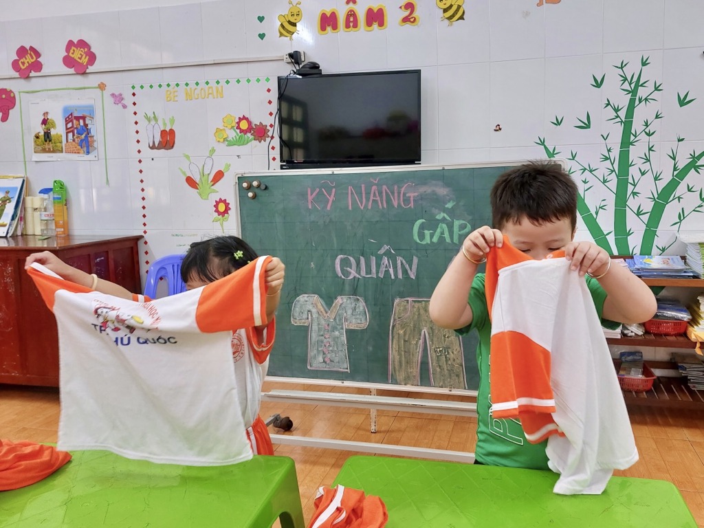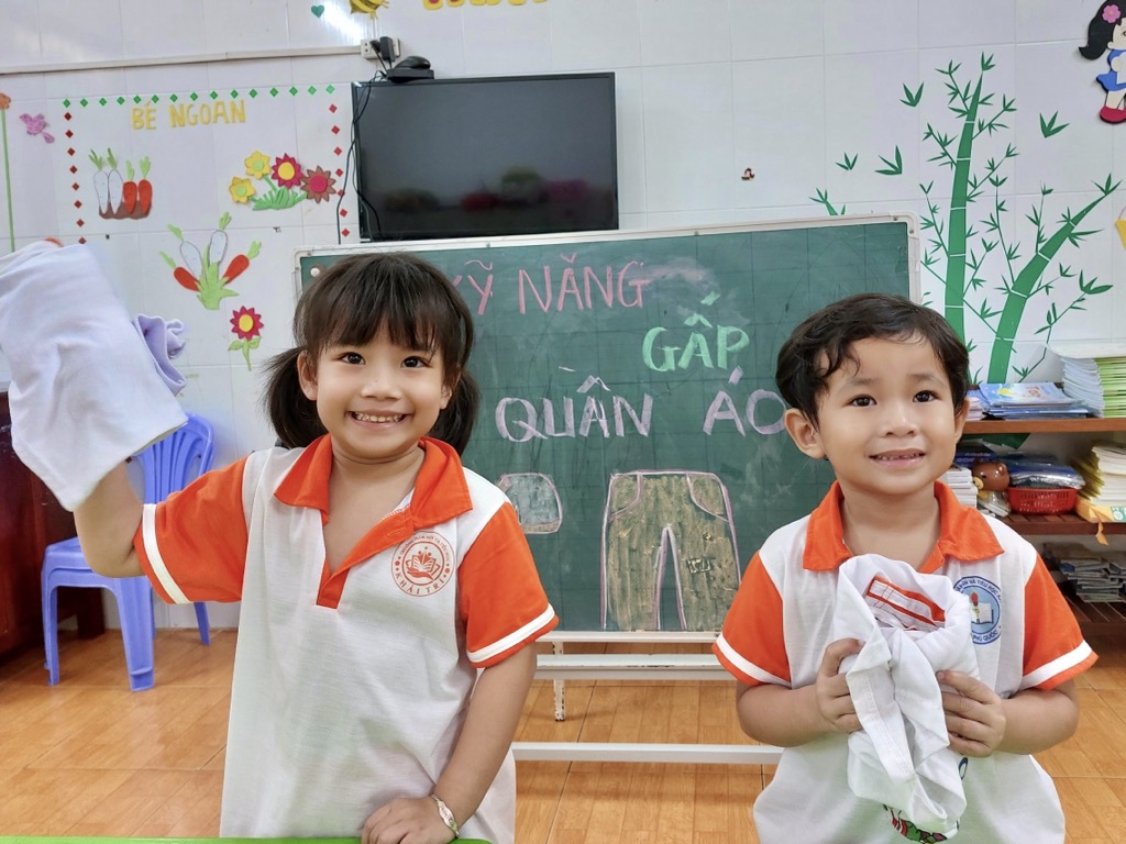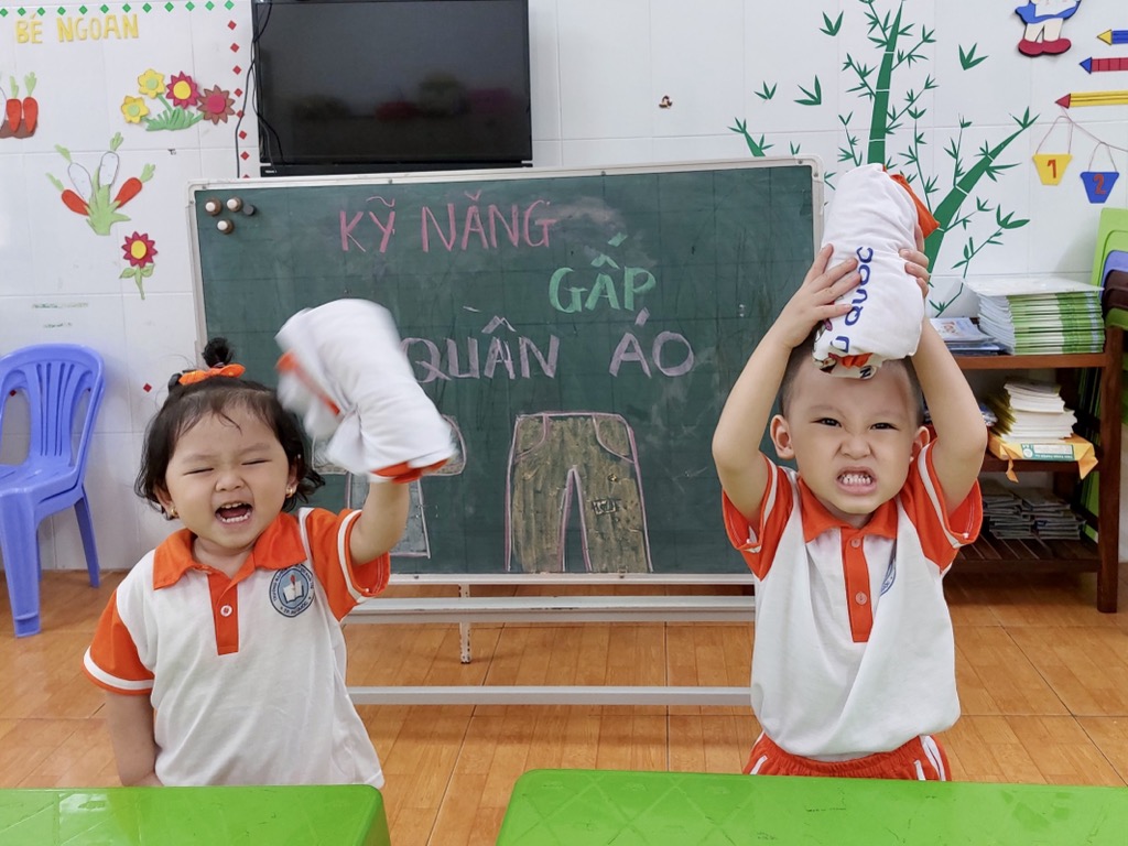 Tại trường Mầm non Khải Trí, việc giáo dục kỹ năng gấp quần áo cho các bé được coi là một phần quan trọng trong chương trình giáo dục. Kỹ năng này không chỉ giúp các bé tự chăm sóc bản thân mà còn giúp phát triển khả năng tập trung và sự tự lập.
