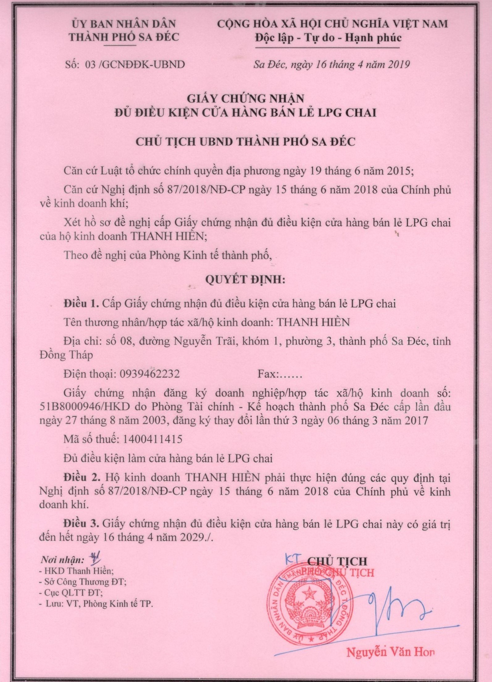 Chúng tôi tự hào là đơn vị được Sở Công Thương tỉnh Đồng Tháp cấp giấy chứng nhận đủ điều kiện kinh doanh mua bán gas (LPG) theo quyết định số 101/GCNĐĐK-SCT ngày 29/09/2021.