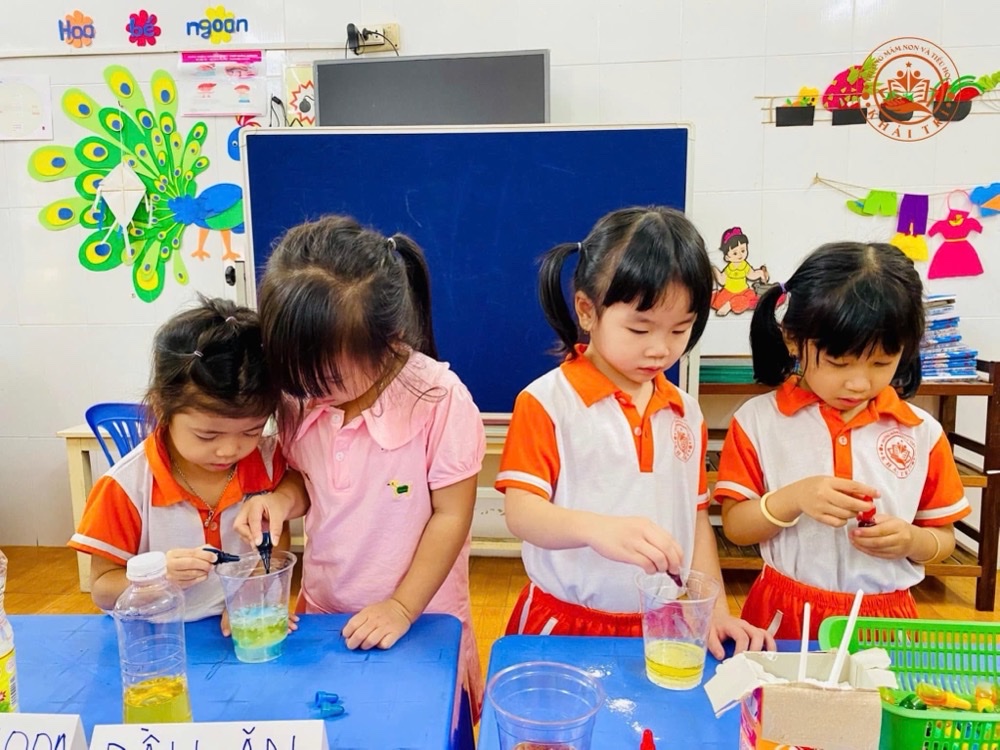Trong quá trình thực hiện thí nghiệm, trẻ sẽ được quan sát và nhận biết sự khác biệt giữa nước và dầu. Thông qua việc cho nước (nặng hơn dầu) vào cốc, trẻ sẽ thấy nước chìm xuống dưới, trong khi dầu nổi lên trên. Đây là một cách đơn giản mà hiệu quả để trẻ hiểu về khái niệm khối lượng và tính chất của các chất khác nhau.