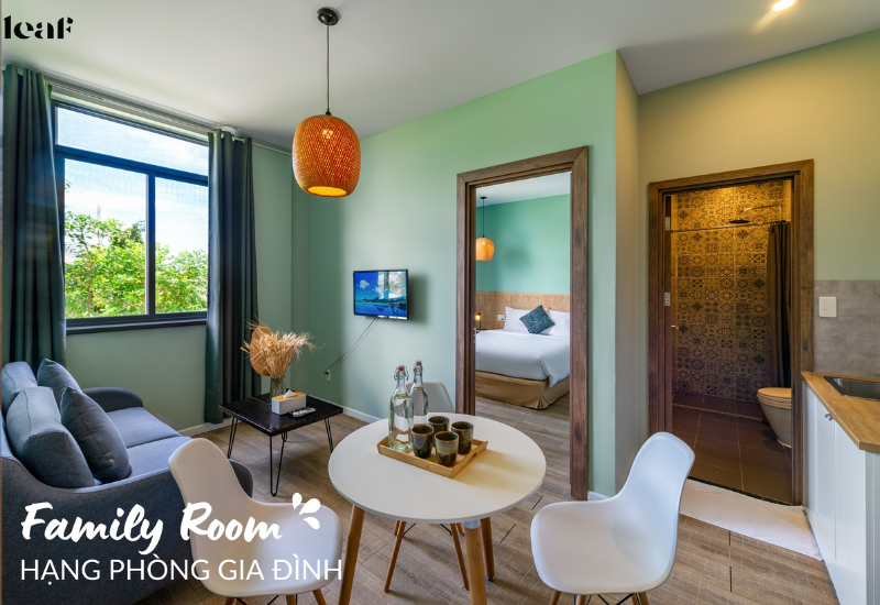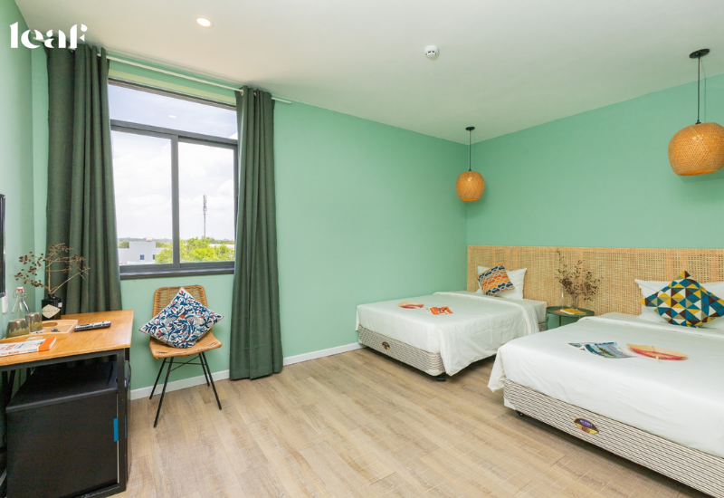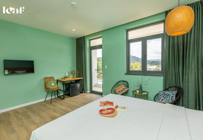 Leaf Hotel Phú Quốc là khách sạn sao mang phong cách hiện đại, tinh tế, nổi bật với thiết kế kết hợp hài hòa giữa gam màu trắng và xanh ngọc, tạo cảm giác thư giãn và gần gũi với thiên nhiên. Với định hướng phát triển du lịch bền vững, khách sạn sử dụng các vật dụng thân thiện với môi trường như dép cói, nước thủy tinh, nói không với nhựa dùng một lần. Hệ thống phòng nghỉ đa dạng từ Superior, Deluxe đến Family Suite, có diện tích rộng rãi, ban công thoáng mát và đầy đủ tiện nghi như minibar, két sắt, Wi-Fi tốc độ cao, điều hòa, TV, cùng các tiện ích chất lượng như nhà hàng, quán café sân thượng, cho thuê xe máy, tour địa phương và dịch vụ đưa đón sân bay. Không chỉ gây ấn tượng bởi không gian sạch sẽ, decor tinh tế và bữa sáng phong phú, Leaf Hotel còn được đánh giá cao bởi đội ngũ nhân viên thân thiện, luôn sẵn sàng hỗ trợ chu đáo. Đây là lựa chọn lý tưởng dành cho các cặp đôi, gia đình hoặc nhóm bạn đang tìm kiếm kỳ nghỉ yên bình, tiện nghi và gần gũi với thiên nhiên tại Phú Quốc.