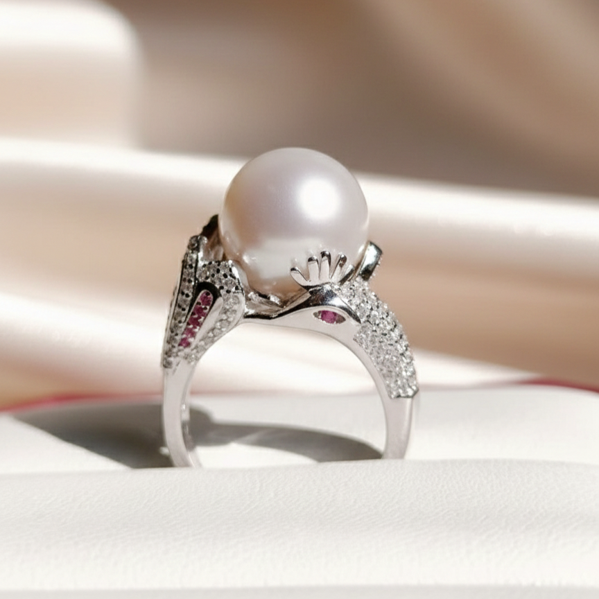 Nhẫn ngọc trai nước ngọt với thiết kế tinh xảo, được chế tác từ vàng trắng hoặc bạc xi bạch kim.