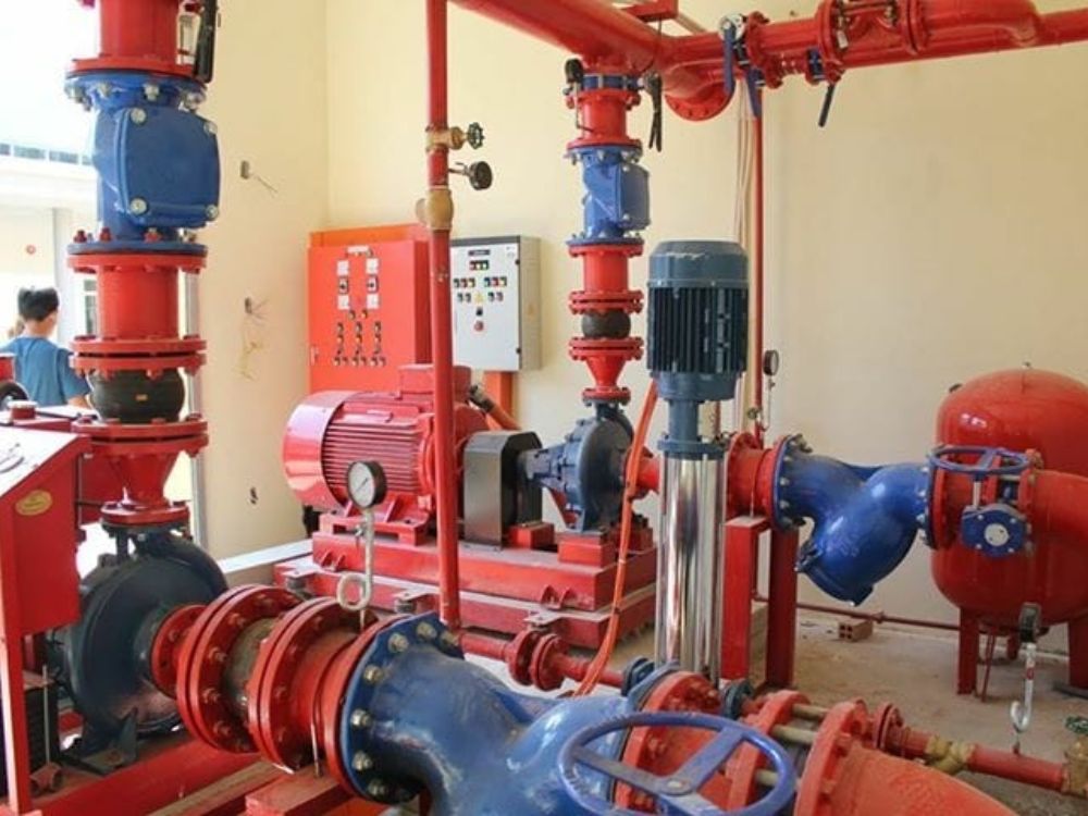 Lắp đặt hệ thống chữa cháy: gia công, lắp đặt ống sắt tráng kẽm, van, bơm, test áp lực, kết nối máy bơm, điện động lực.