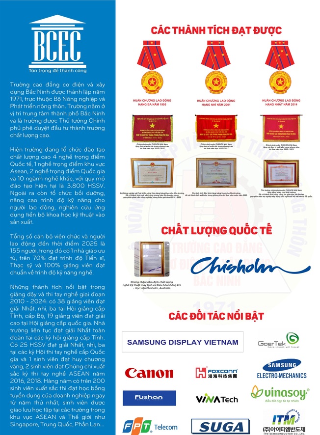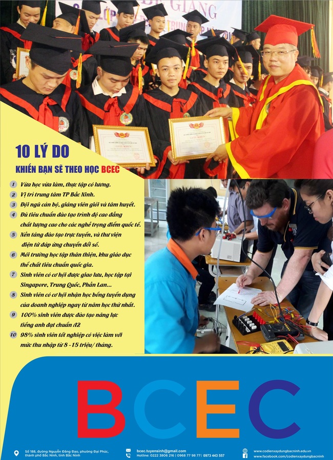 Trường Cao đẳng Cơ điện và Xây dựng Bắc Ninh (BCEC) — tiền thân thành lập từ năm 1971, trực thuộc Bộ Nông nghiệp & Phát triển Nông thôn — là trường công lập đào tạo hệ Cao đẳng và Trung cấp, tọa lạc ngay trung tâm TP. Bắc Ninh (Cơ sở 1: số 188 Nguyễn Đăng Đạo – Phường Đại Phúc; Cơ sở 2: Phường Hạp Lĩnh) . Trường nổi bật với chương trình đào tạo đa dạng: gồm 4 nghề trọng điểm quốc tế, 1 nghề trọng điểm ASEAN, 2 nghề trọng điểm quốc gia và nhiều ngành nghề khác, áp dụng phương pháp “Vừa học, vừa làm, thực tập có lương” nhằm gắn kết chặt chẽ với doanh nghiệp và thị trường lao động.