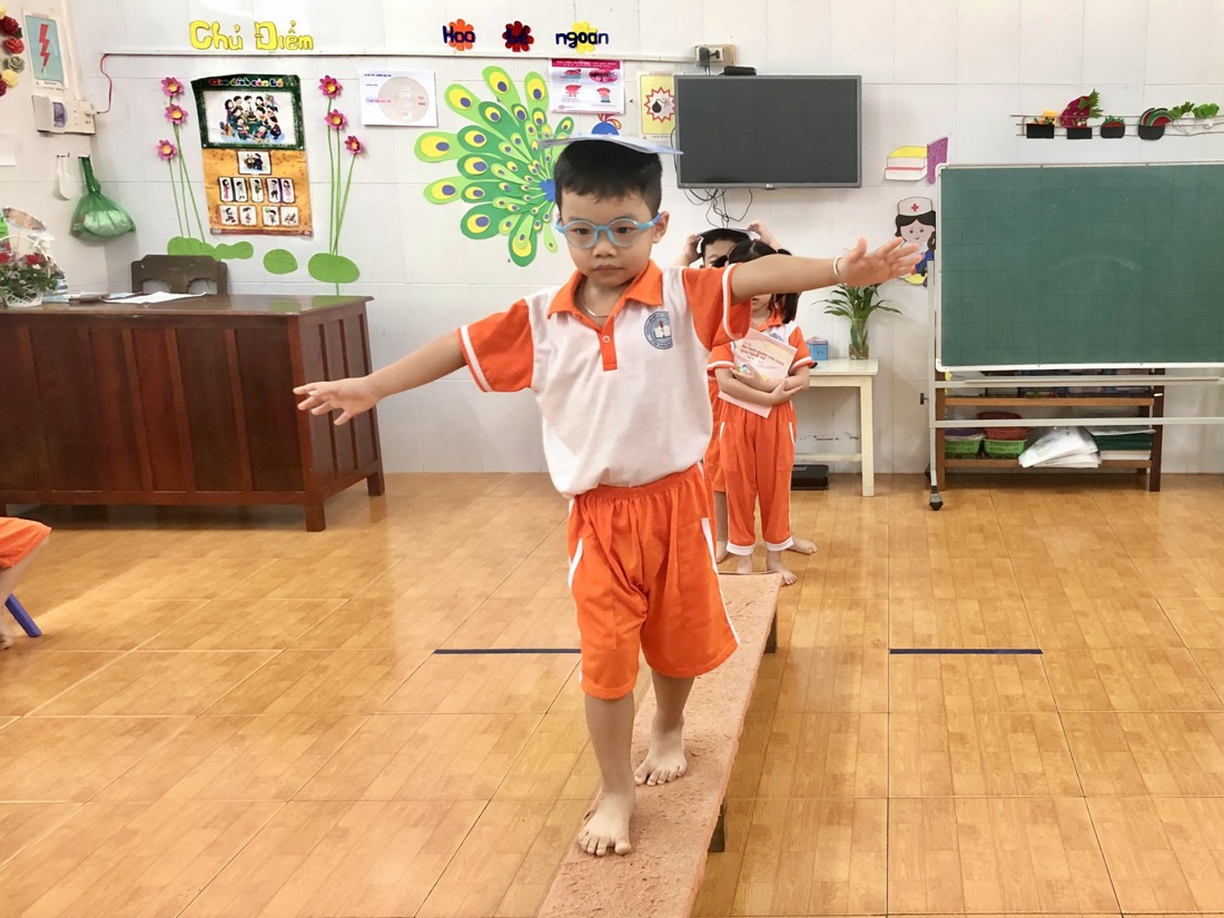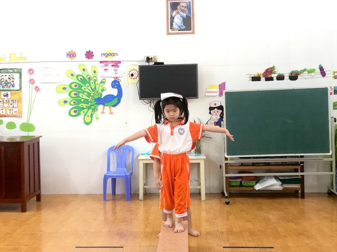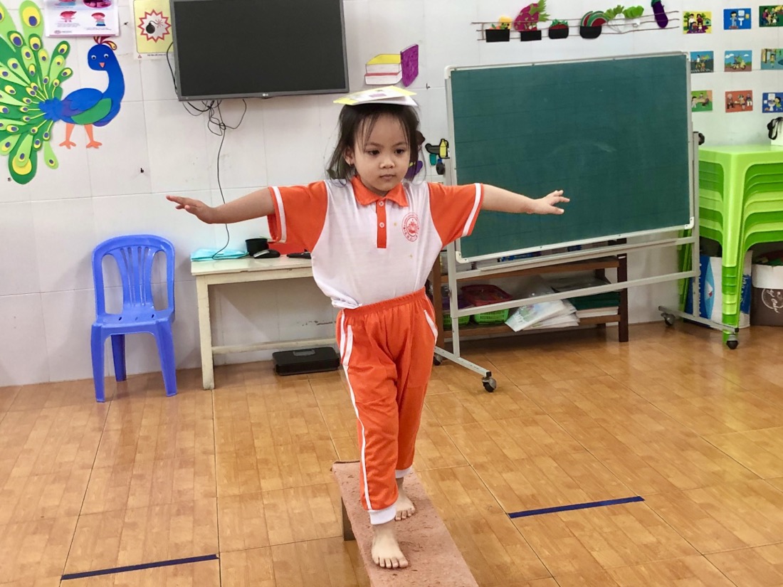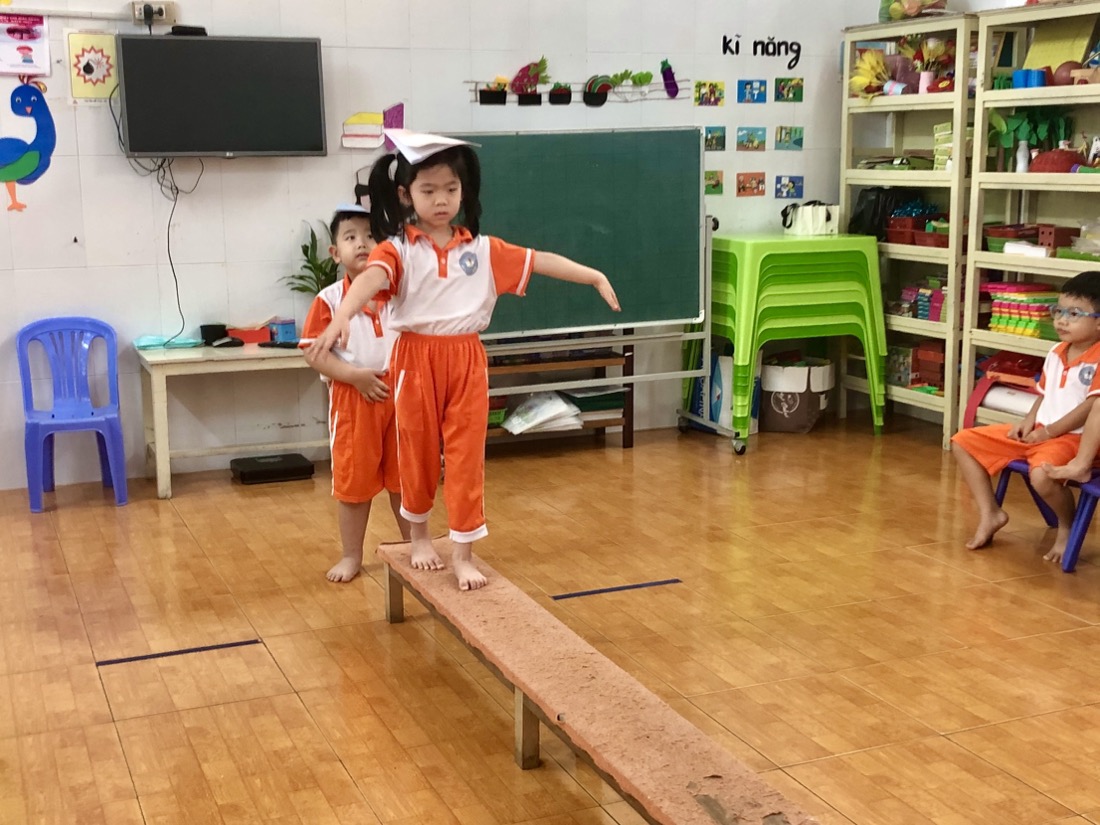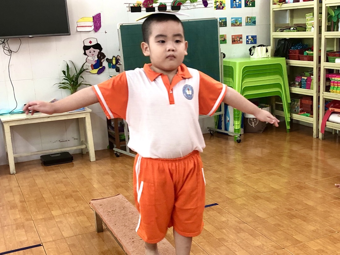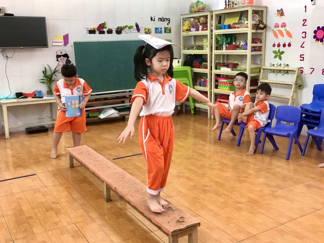 Để bắt đầu hoạt động này, trẻ sẽ được chuẩn bị một quyển tập và một chiếc ghế thể dục dài. Sau đó trẻ sẽ đặt quyển tập lên đầu và tập trung giữ thăng bằng để vượt qua thử thách đó là đi từ điểm đầu đến điểm cuối của chiếc ghế.
