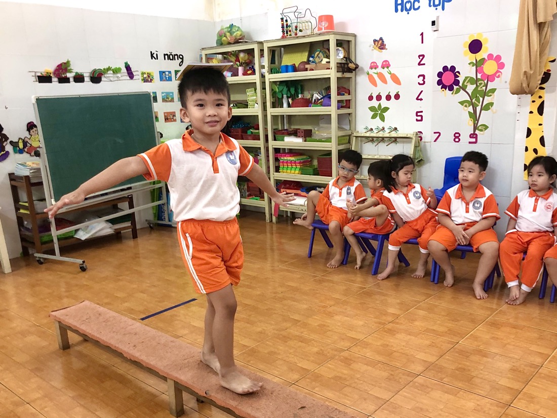 Hoạt động giữ thăng bằng đi trên ghế thể dục là một hoạt động phát triển thể chất và sự khéo léo cho trẻ mầm non. Nó không chỉ giúp trẻ phát triển các kỹ năng cần thiết mà còn tăng cường sự cân đối và tập trung. Đây là một hoạt động vui nhộn và thú vị được các bé tham gia tích cực.