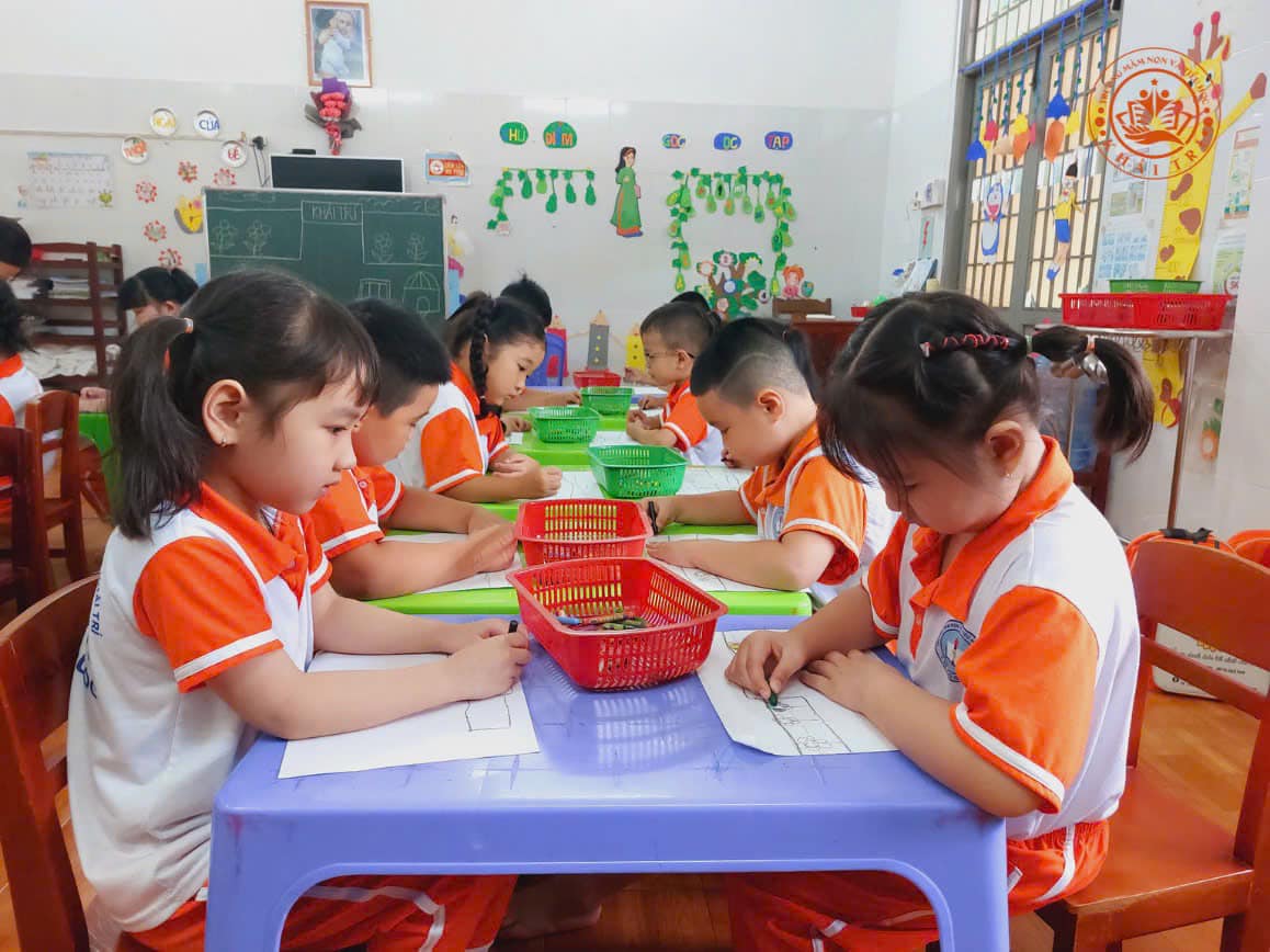Mỗi buổi hoạt động vẽ, các em sẽ được cung cấp đầy đủ dụng cụ như màu sáp, bút chì và giấy vẽ. Các giáo viên không chỉ hướng dẫn các em cách sử dụng các công cụ mà còn tạo ra một môi trường thoải mái, giúp các em tự do sáng tạo