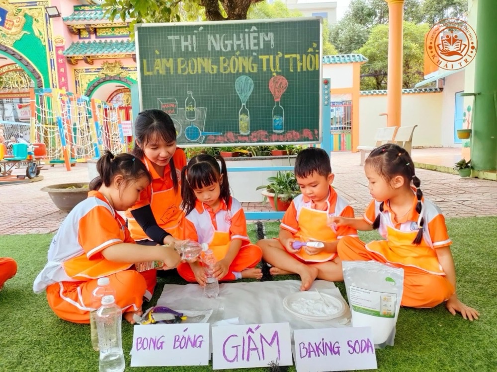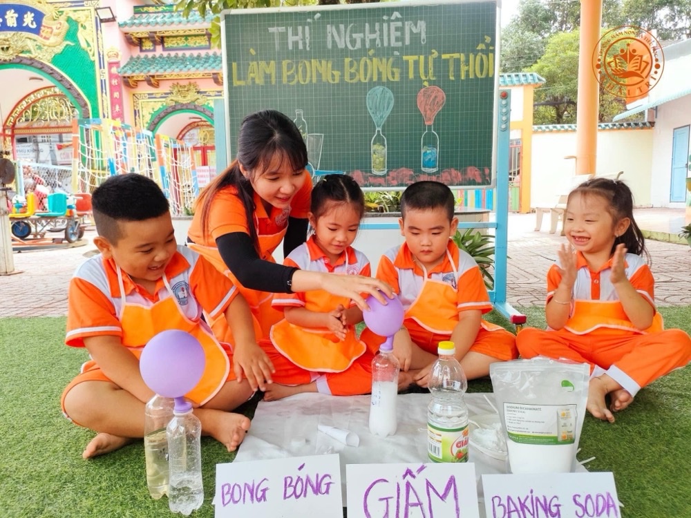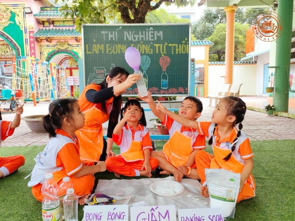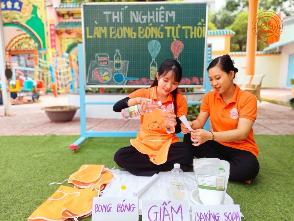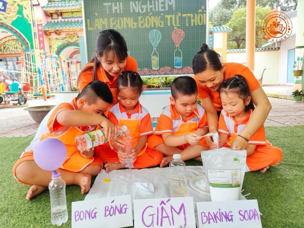 Trong buổi học, các bé được hướng dẫn cách làm bong bóng tự thổi bằng những nguyên liệu dễ tìm như giấm, baking soda, và một chiếc bóng bay. Với sự hướng dẫn tận tình của các cô giáo, các bé đã từng bước thực hiện thí nghiệm và theo dõi sự kỳ diệu khi bóng bay tự thổi phồng lên.