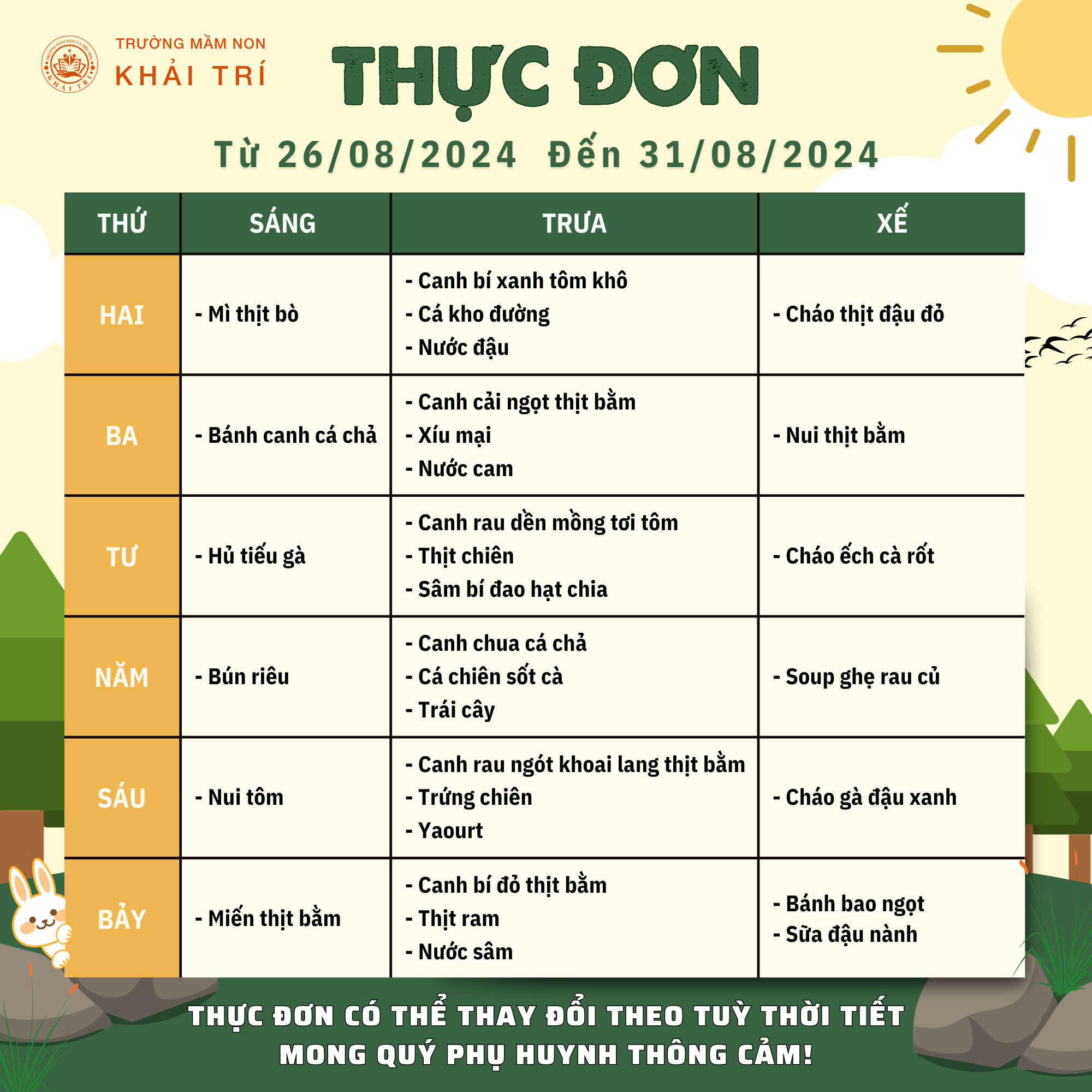 Thực Đơn Tuần Mới (Từ 26/08/2024 - 31/08/2024)
