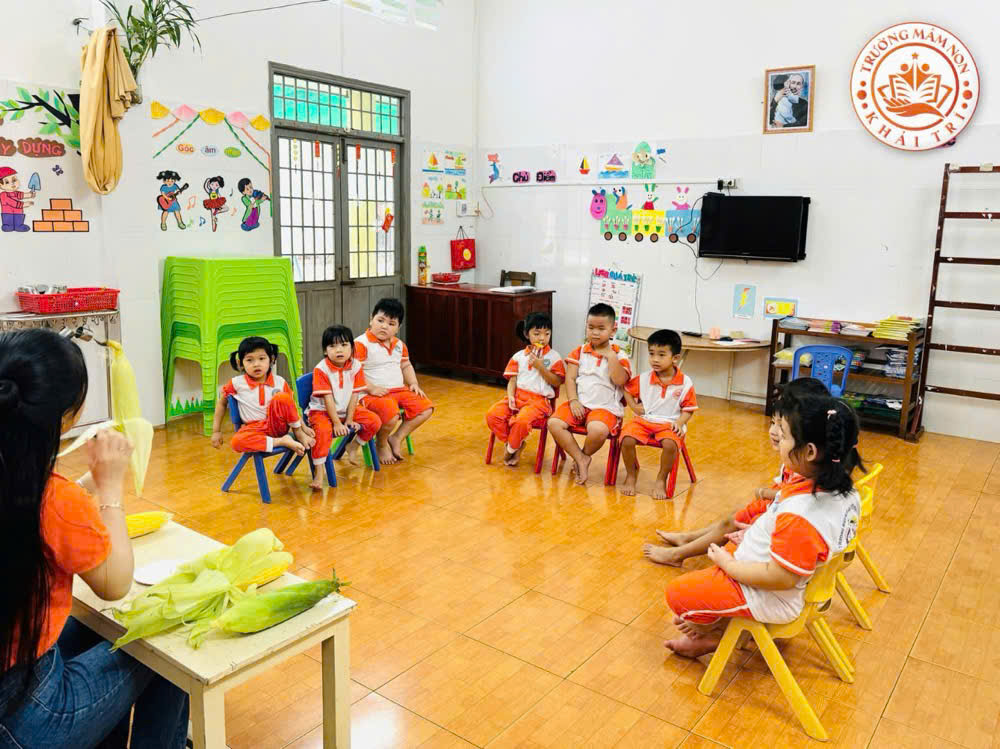Để chuẩn bị cho hoạt động, giáo viên đã lựa chọn những trái bắp tươi ngon, đảm bảo an toàn vệ sinh. Các dụng cụ như dĩa để đựng hạt, khăn lau tay cũng được chuẩn bị đầy đủ. Không gian lớp học được bố trí gọn gàng, tạo điều kiện thuận lợi cho các bé tham gia hoạt động.