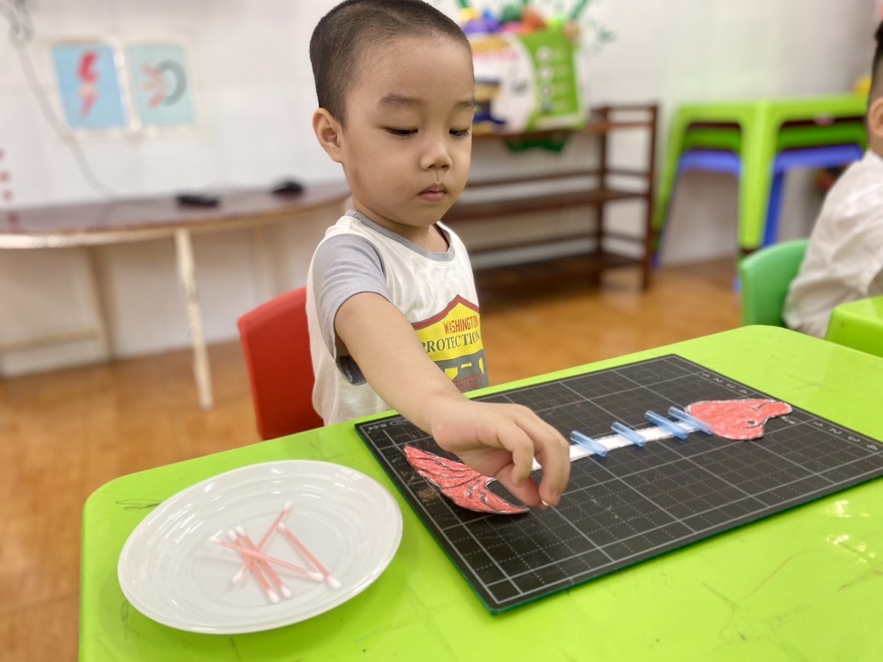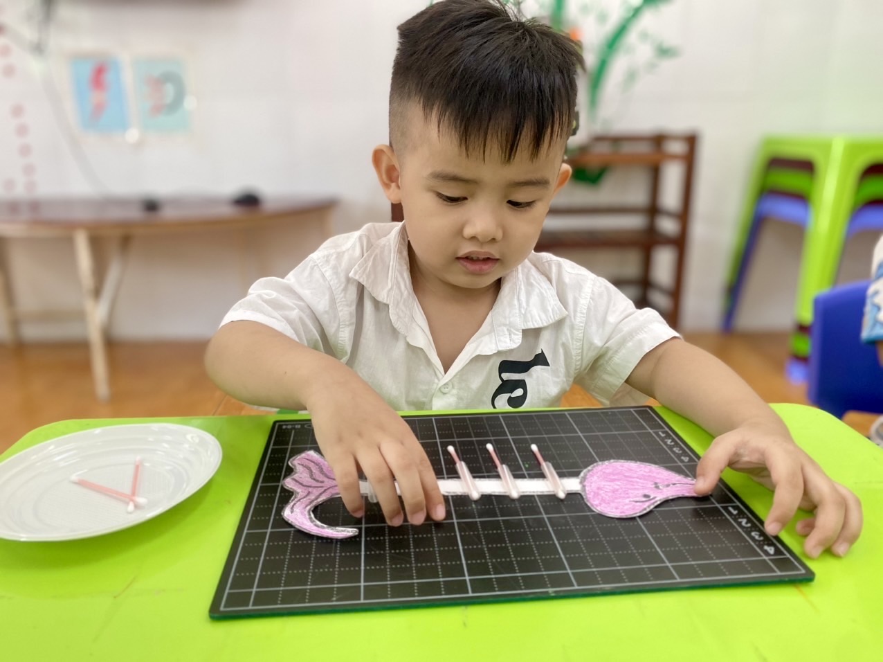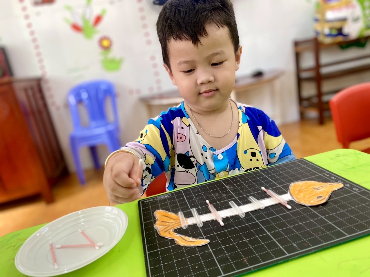 Hoạt động tạo hình xương cá bằng bông tăm là một hoạt động sáng tạo và giáo dục thú vị dành cho trẻ mầm non. Hoạt động này không chỉ giúp trẻ phát triển khả năng tư duy sáng tạo và khéo léo, mà còn giúp trẻ rèn kỹ năng tập trung và cải thiện khả năng tay mắt.