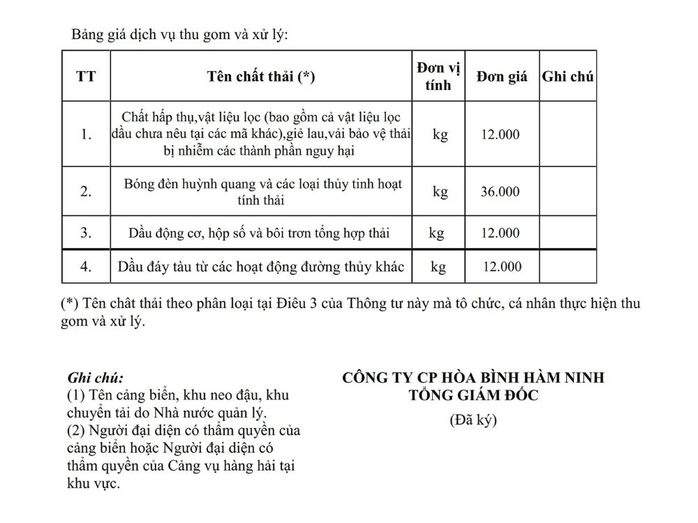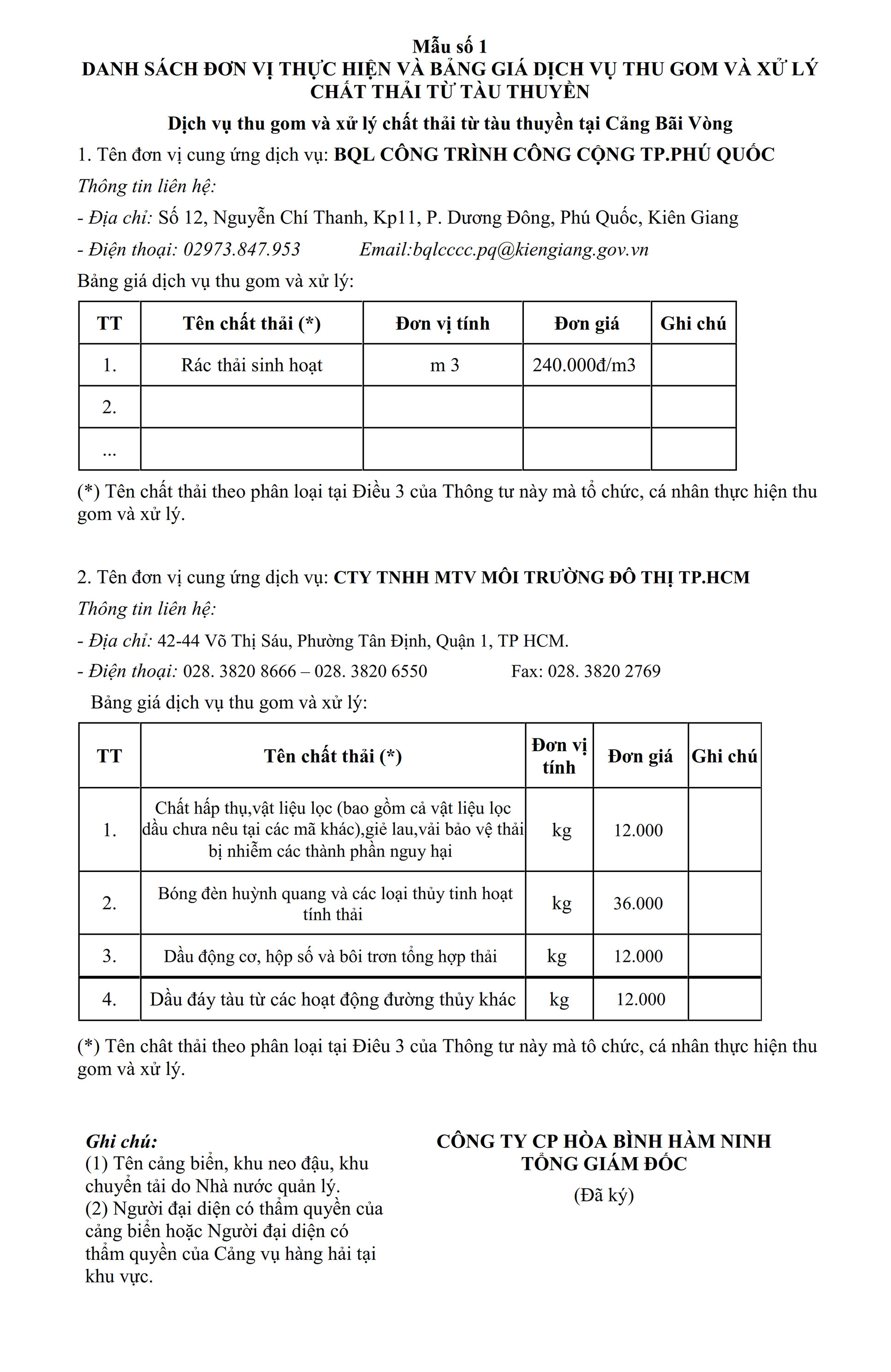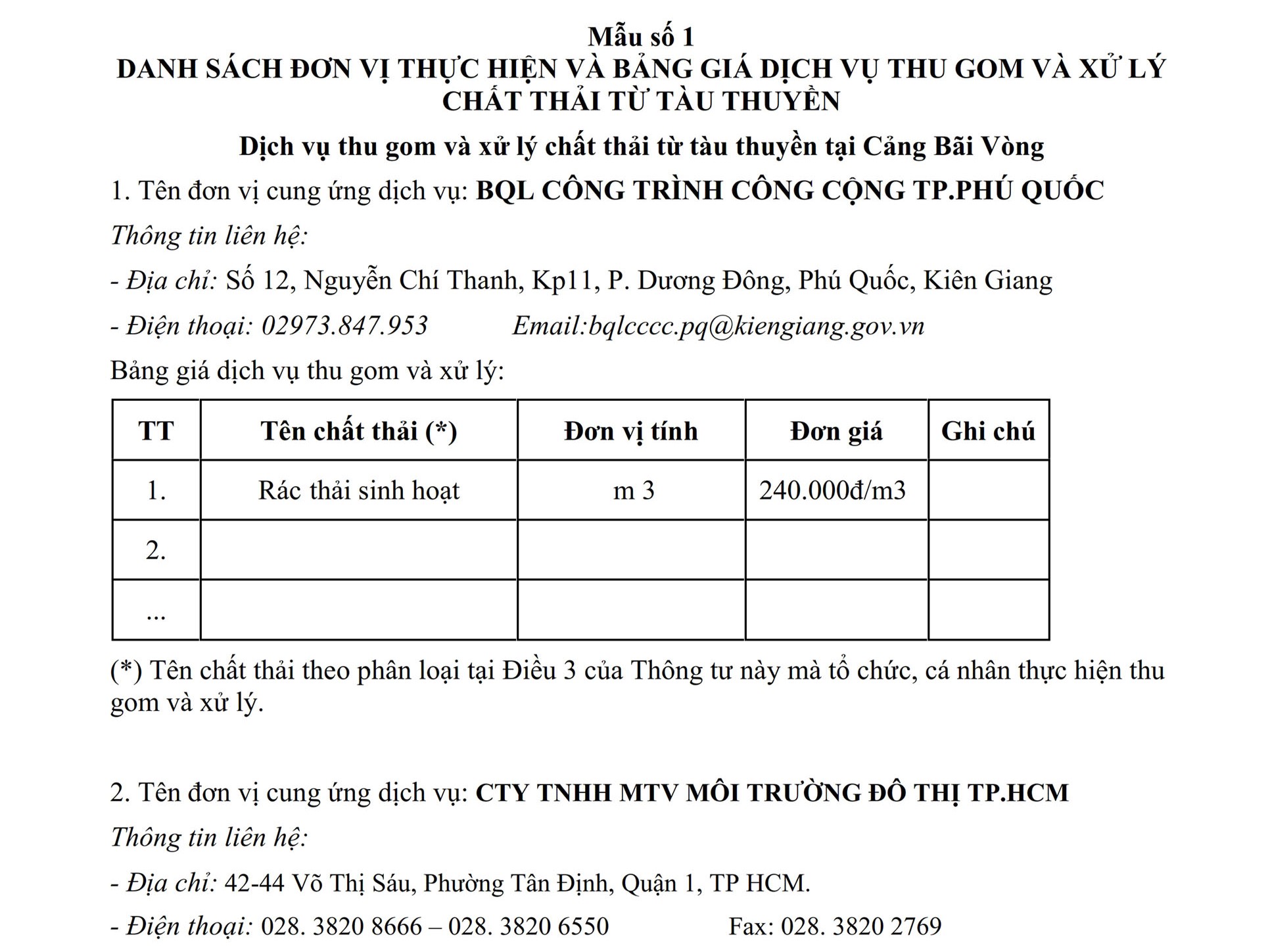 Danh sách các đơn vị tham gia cung ứng dịch vụ thu gom, xử lý chất thải từ Bến cảng Bãi Vòng.