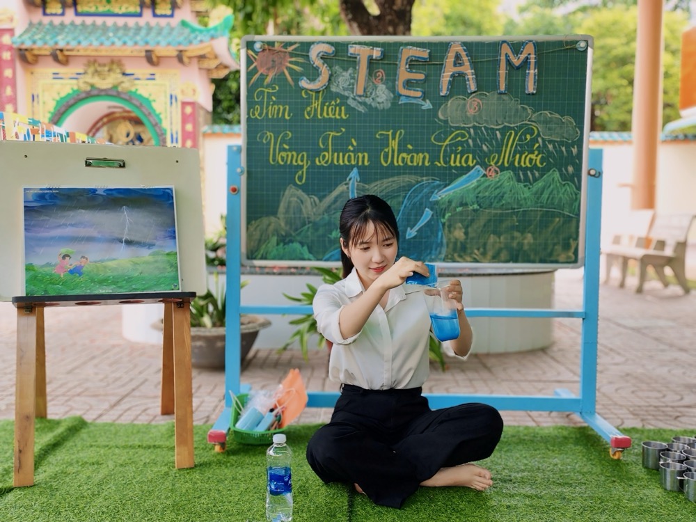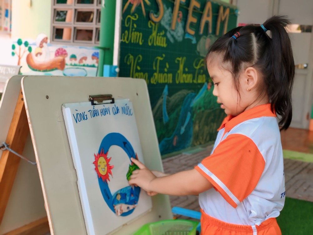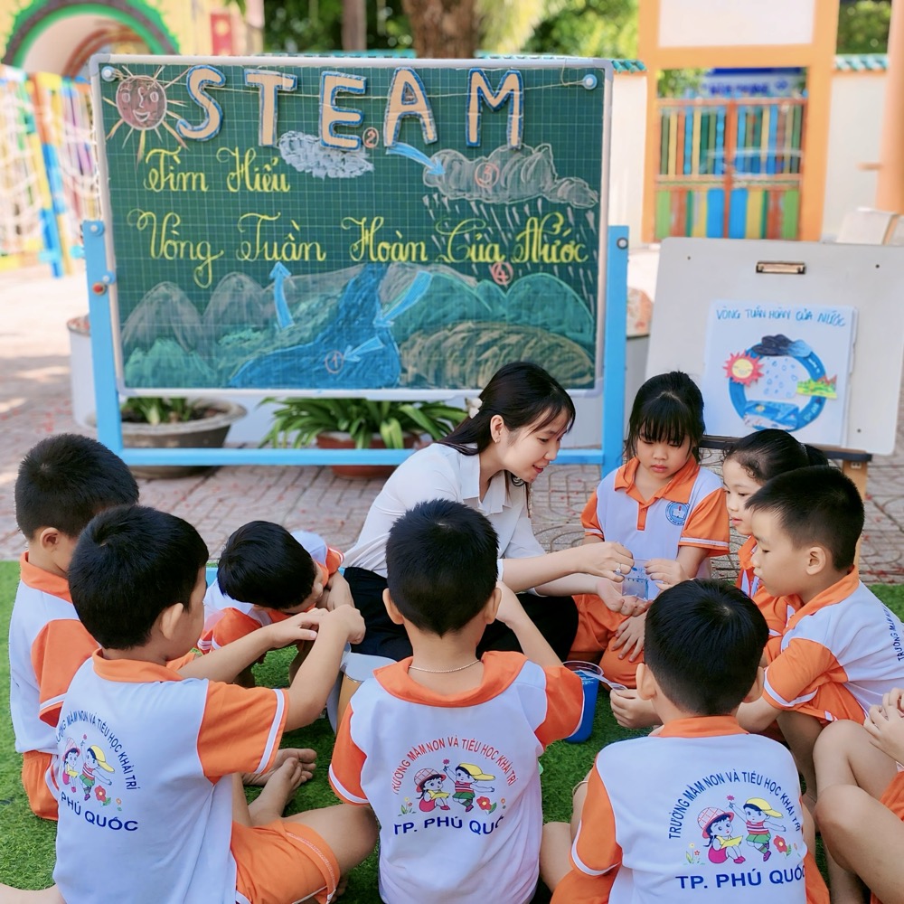 Tại trường Mầm non Khải Trí, việc phát triển nhận thức cho trẻ bằng các hoạt động luôn được đặt lên hàng đầu và một trong những hoạt động hấp dẫn đó chính là tìm hiểu vòng tuần hoàn của nước. Trẻ được khuyến khích sử dụng các giác quan để tìm hiểu về nước, từ đó thảo luận về lý do tại sao trời mưa. Qua đó trẻ cũng được thực hành thiết kế vòng tuần hoàn để thực hiện thí nghiệm quan sát hiện tượng nước bốc hơi và ngưng tụ thành giọt nước.