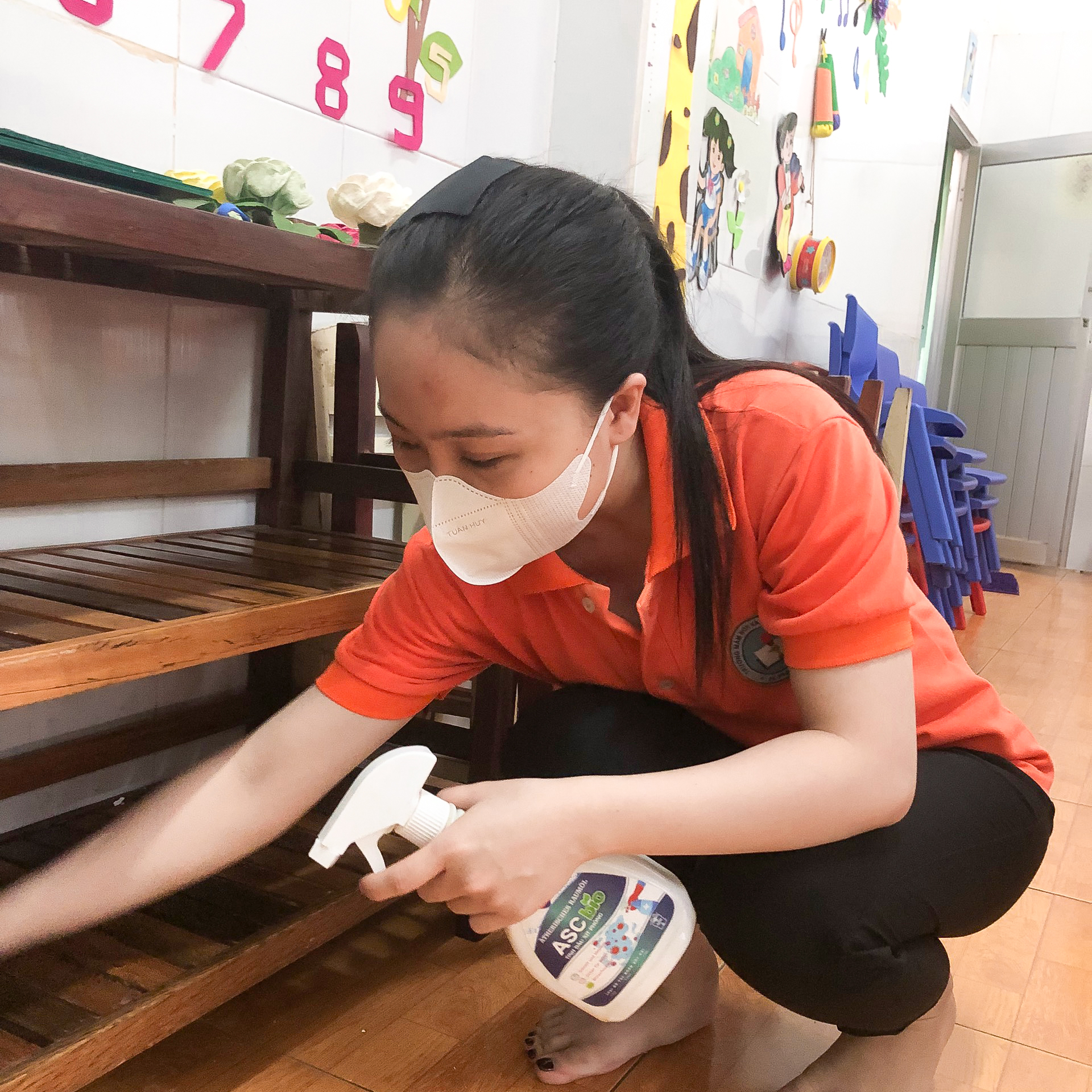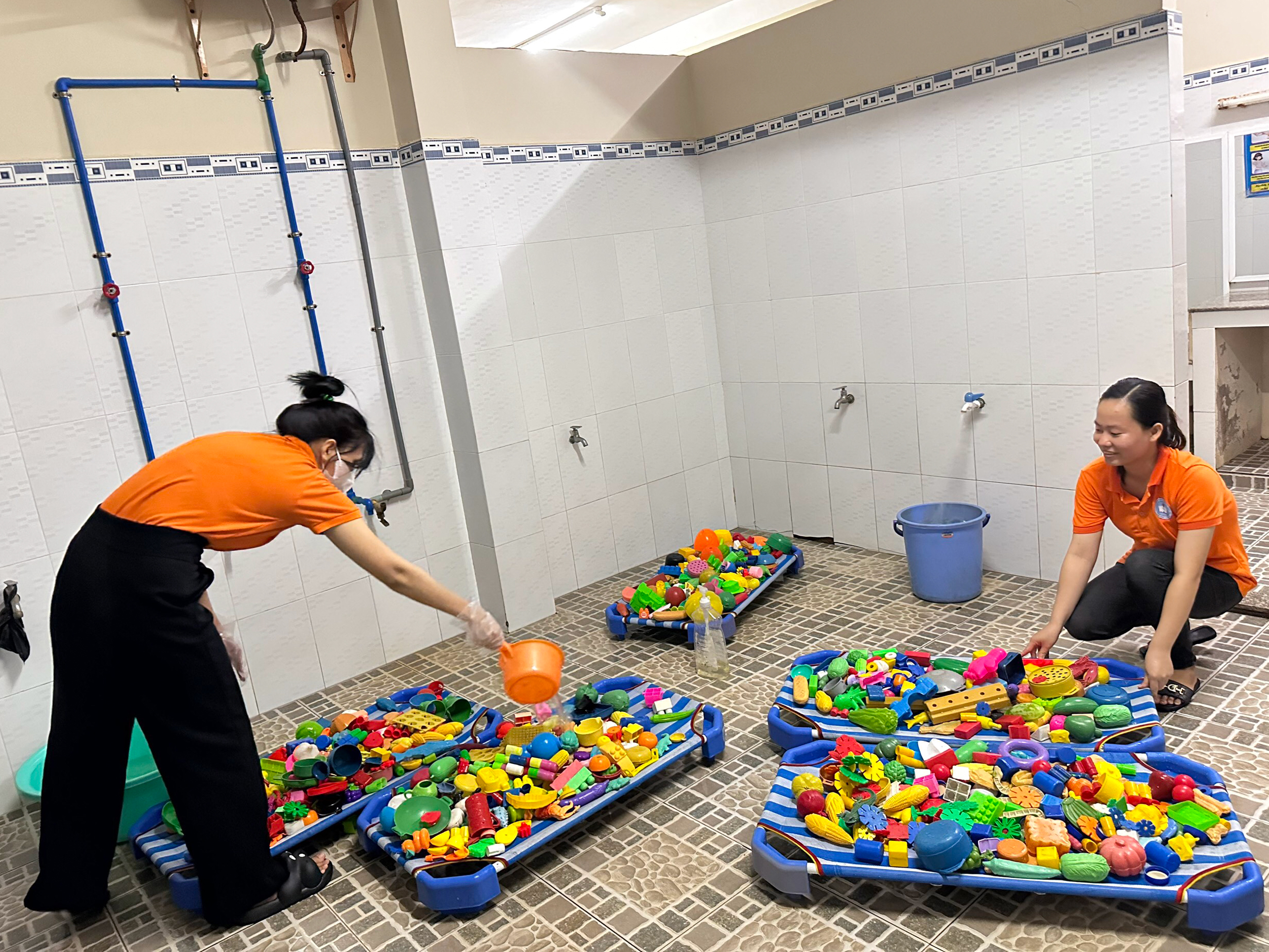 Sau khi rửa sạch, các cô sẽ xả nước sạch để loại bỏ hết xà phòng và chất tẩy trên đồ chơi. Đồ chơi sau khi được rửa sạch và xả nước sạch sẽ được phơi khô hoàn toàn trước khi đưa trở lại phòng học và khu vực chơi.