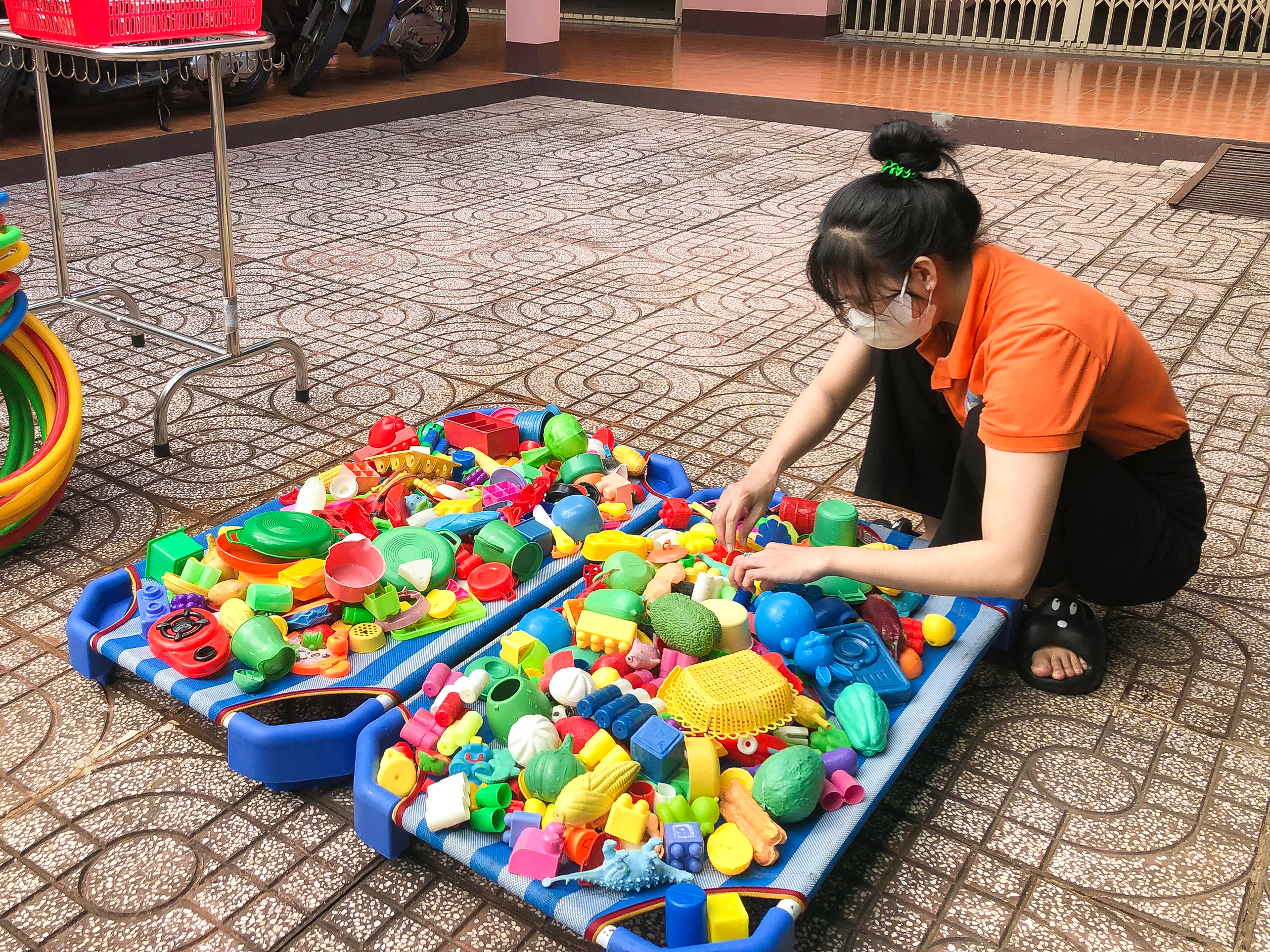 Đầu tiên, các cô giáo sẽ tập trung thu gom tất cả các đồ chơi từ các phòng học và khu vực chơi. Sau đó, đồ chơi sẽ được phân loại thành từng nhóm tương tự nhau như đồ chơi xếp hình, búp bê, ô tô, đồ chơi mô phỏng, v.v. Qua việc phân loại, các cô giáo có thể tiện lợi trong việc vệ sinh và bảo quản đồ chơi.
