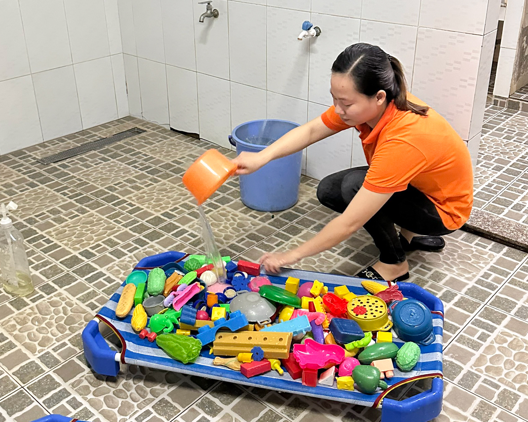 Tiếp theo, các cô giáo sẽ sử dụng nước và xà phòng để rửa sạch các đồ chơi. Việc rửa sạch đồ chơi không chỉ giúp loại bỏ bụi bẩn mà còn loại bỏ vi khuẩn và các chất cặn bẩn khác. Các cô giáo sẽ sử dụng bàn chải nhỏ để làm sạch các khe hẹp hoặc các bộ phận khó tiếp cận. Đồ chơi cần được rửa sạch kỹ càng và đảm bảo không còn chất tẩy trên bề mặt.