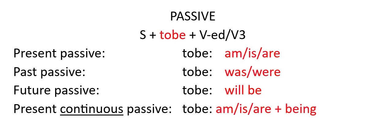 S + am/is/are + V3/ed (+ by + O)