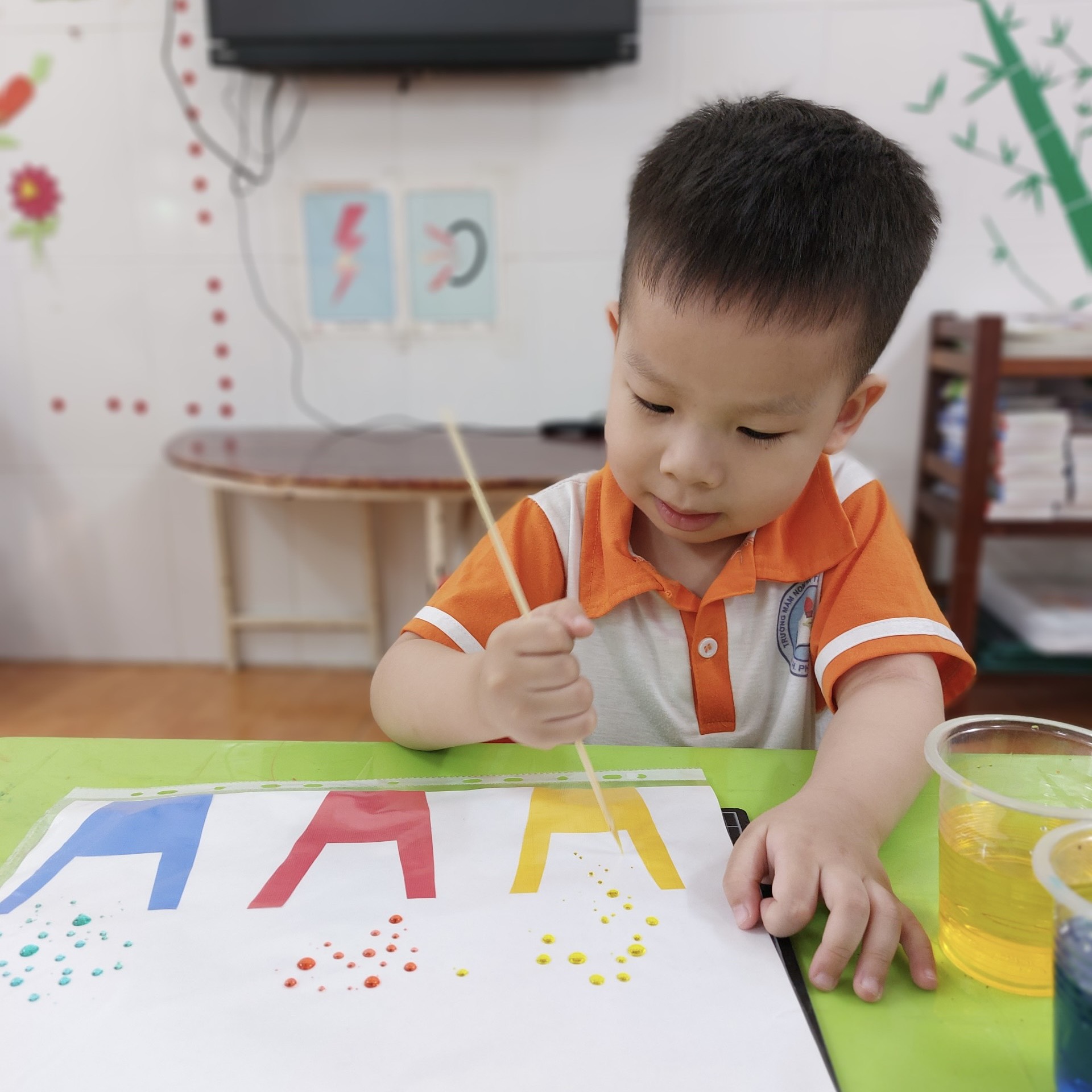 Trong quá trình thực hiện, trẻ sẽ phải quan sát và nhận biết màu sắc của giọt nước, phân biệt và chọn lựa đúng ly đựng nước để di chuyển giọt nước vào. Đồng thời, trẻ cũng sẽ học cách sử dụng đồ dùng một cách linh hoạt và chính xác để hoàn thành nhiệm vụ.