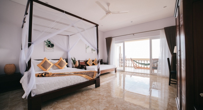 Võng cũng được bố trí tại ban công nhằm ru khách vào những giây phút yên bình hoặc những giấc ngủ bằng tiếng sóng vỗ về bờ. Không gian rộng rãi thoáng mát và có lắp mùng chống muỗi thật điệu đà.
