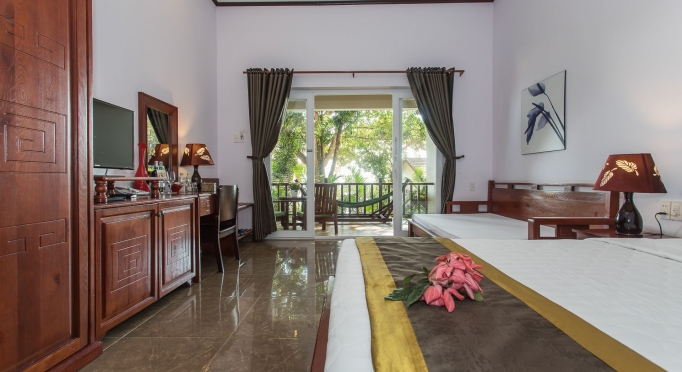Sở hữu lối thiết kế thân thiện, gần gũi thiên nhiên với tất cả các trang thiết bị được sắp đặt một cách gọn gàng và tinh tế. Thông qua cửa kính trong suốt, quí khách cảm nhận được ánh sáng tự nhiên cùng sắc xanh mơn mởn của những tán cây nhiệt đới, tiếng chim hót líu lo, tiếng lá rừng thủ thỉ. Nằm đọc sách, thư giãn trên võng hay ngồi ghế uống trà tại ban công nhìn ra sân vườn đều vô cùng thảnh thơi và thoải mái. Cảm giác sống chan hòa cùng tự nhiên rất thật và tuyệt vời biết bao.