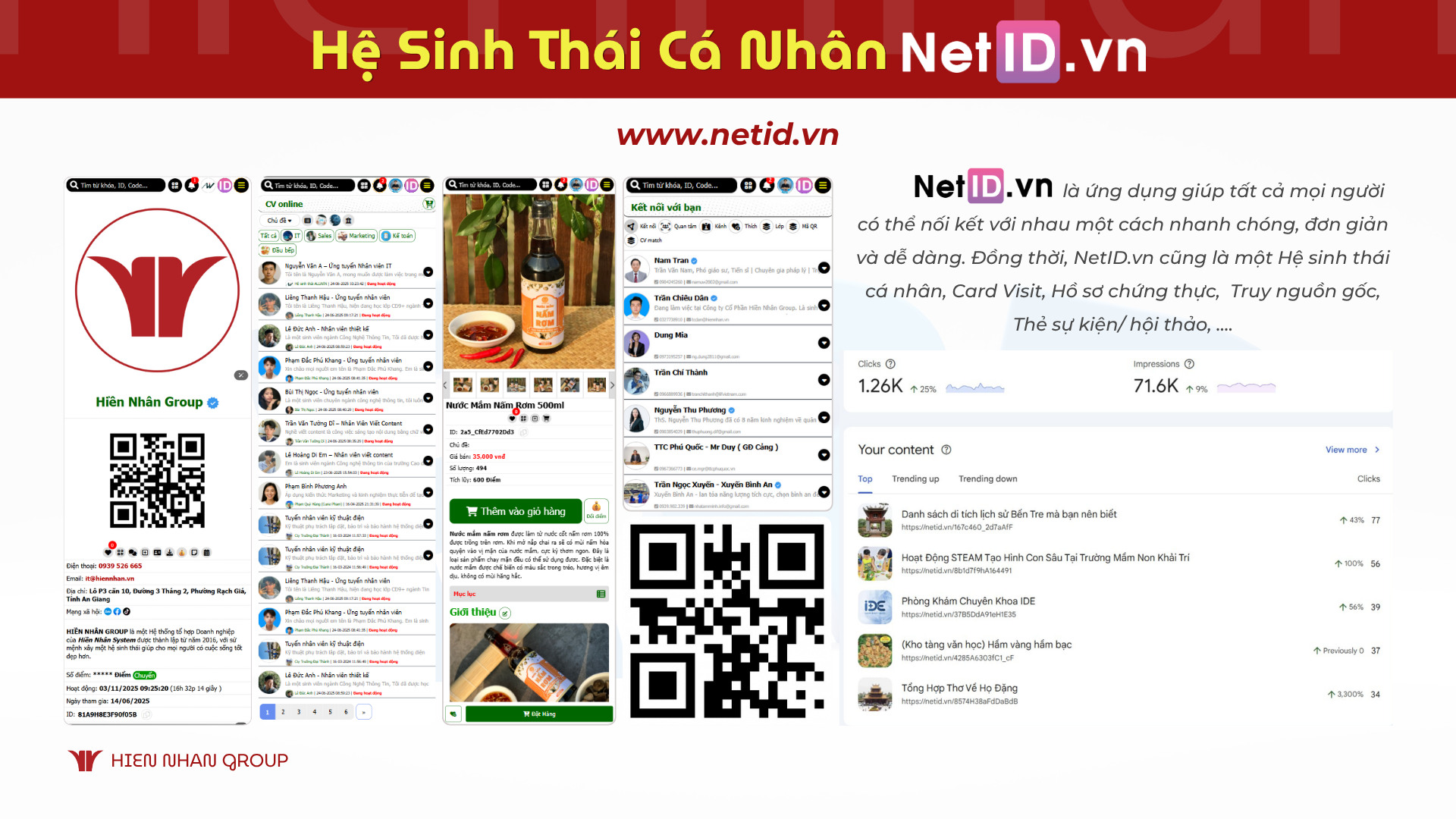 NetID là ứng dụng giúp tất cả mọi người có thể nối kết với nhau một cách nhanh chóng, đơn giản và dễ dàng. Đồng thời, NetID.vn cũng là một Hệ sinh thái cá nhân, Card Visit, Hồ sơ chứng thực, Truy nguồn gốc, Thẻ sự kiện/ hội thảo, ....