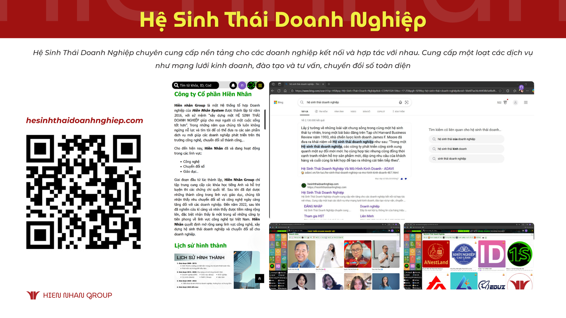 Hệ Sinh Thái Doanh Nghiệp chuyên cung cấp nền tảng cho các doanh nghiệp kết nối và hợp tác với nhau. Cung cấp một loạt các dịch vụ như mạng lưới kinh doanh, đào tạo và tư vấn, chuyển đổi số toàn diện