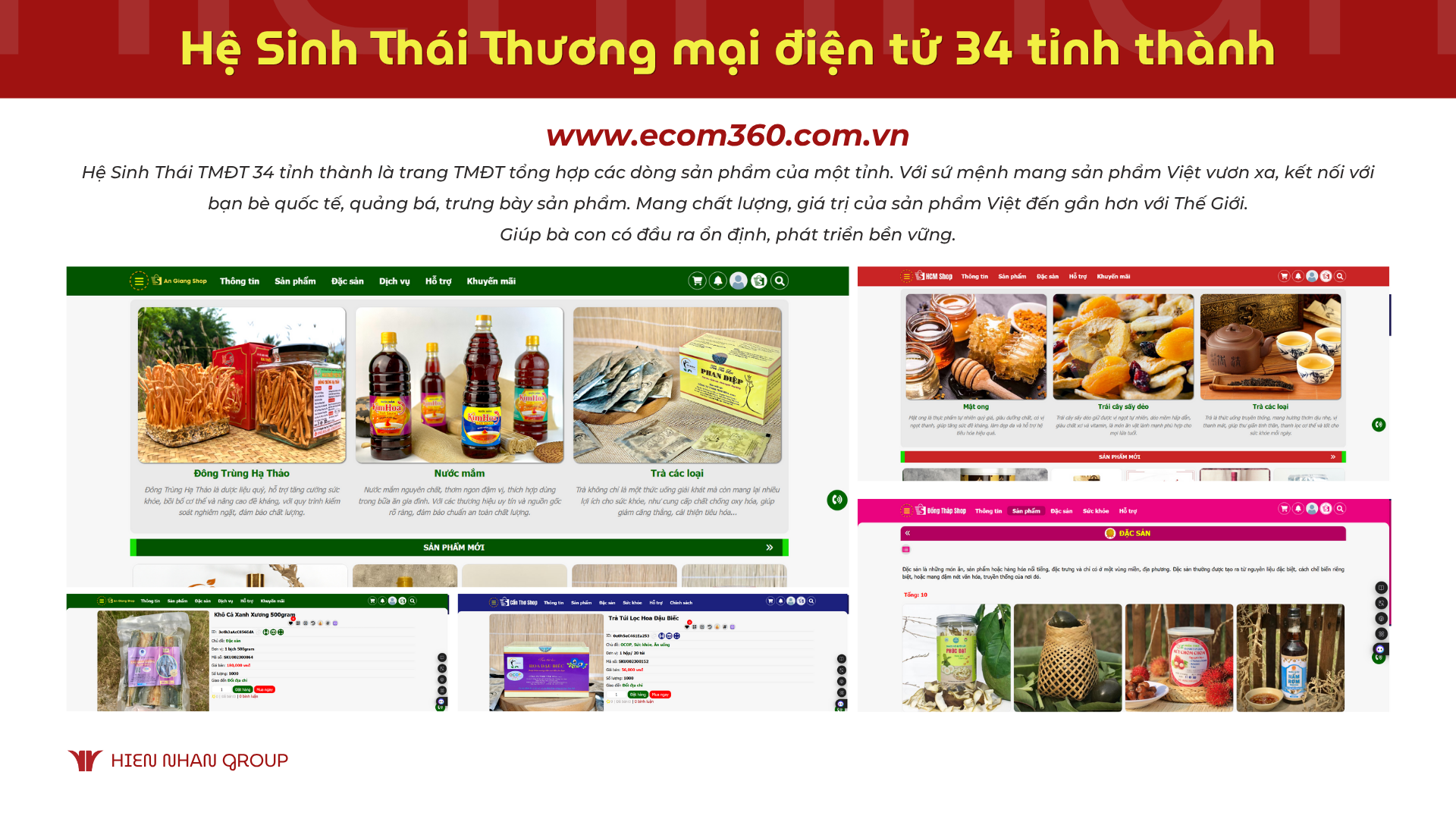 Hệ Sinh Thái TMĐT 34 tỉnh thành là trang TMĐT tổng hợp các dòng sản phẩm của một tỉnh. Với sứ mệnh mang sản phẩm Việt vươn xa, kết nối với bạn bè quốc tế, quảng bá, trưng bày sản phẩm. Mang chất lượng, giá trị của sản phẩm Việt đến gần hơn với Thế Giới. Giúp bà con có đầu ra ổn định, phát triển bền vững.