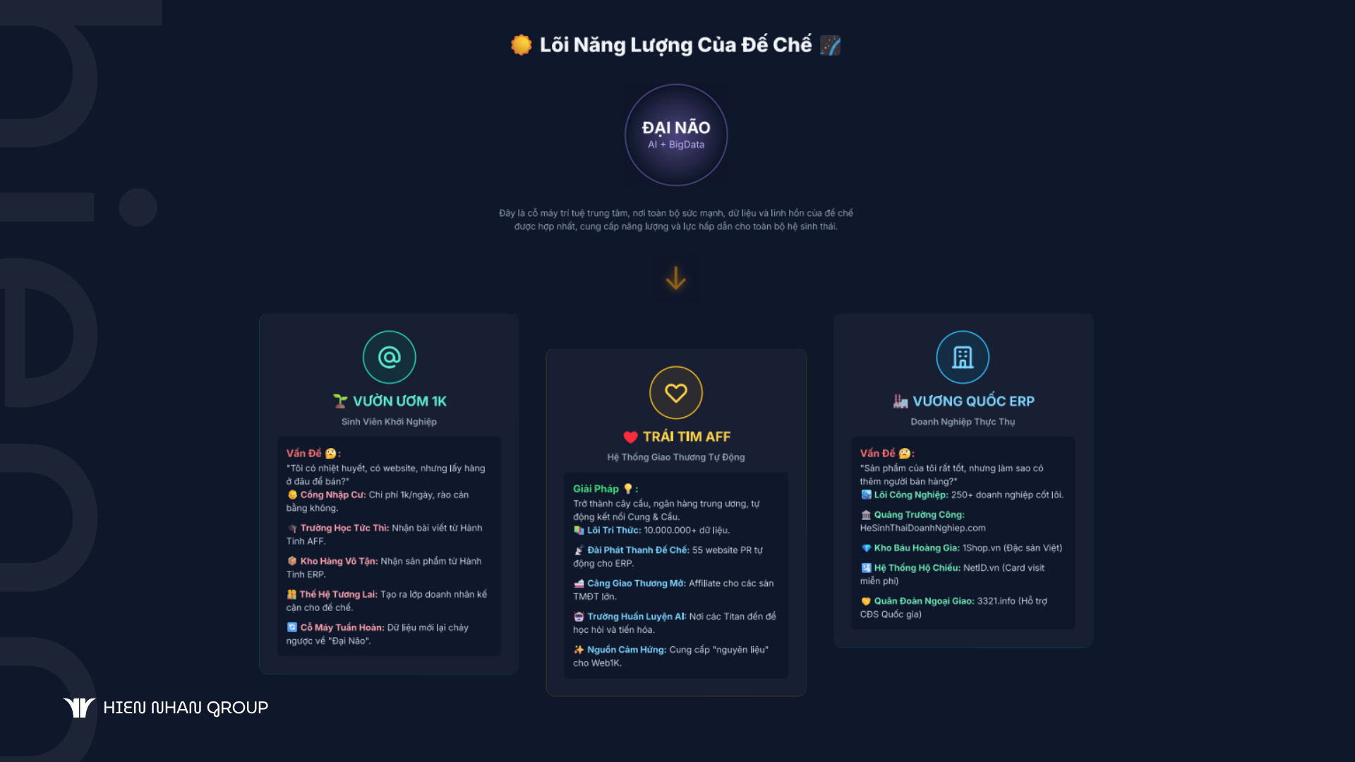 Hiền Nhân Group là một hệ thống tổ hợp doanh nghiệp trực thuộc Hiền Nhân System, được thành lập từ năm 2016, với sứ mệnh “Xây dựng một Hệ sinh thái giúp mọi người có cuộc sống tốt đẹp hơn”.