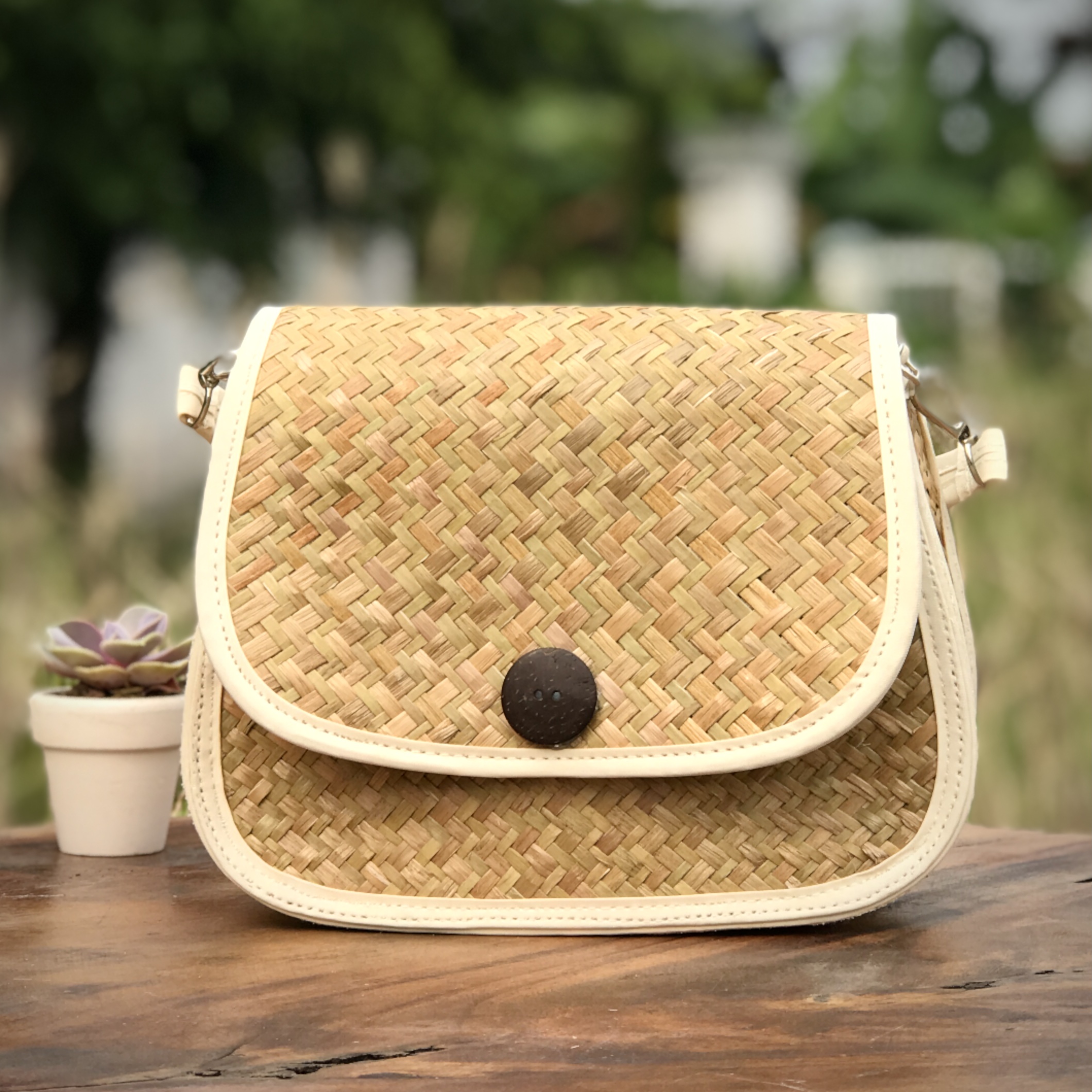 Túi Đeo Hình Bầu Nút Dừa là sản phẩm được làm từ cỏ buông thiên nhiên, đây là một phụ kiện tuyệt vời cho chị em mình khi muốn mang đi chơi, đi dạo, đi chợ xuân,... Túi là sự kết hợp giữa hiện đại và truyền thống, màu sắc tươi sáng trẻ trung, với những đường viền vải màu trắng sáng làm tăng thêm sự tinh tế, sang trọng của túi.